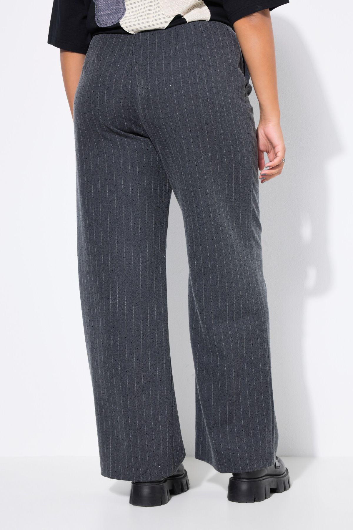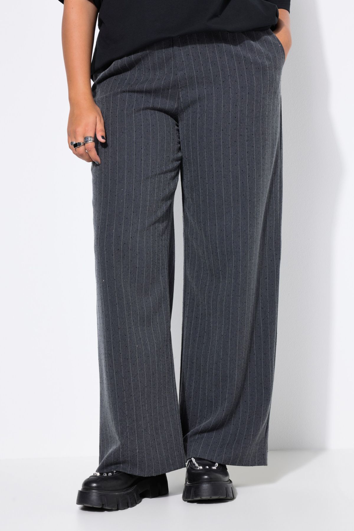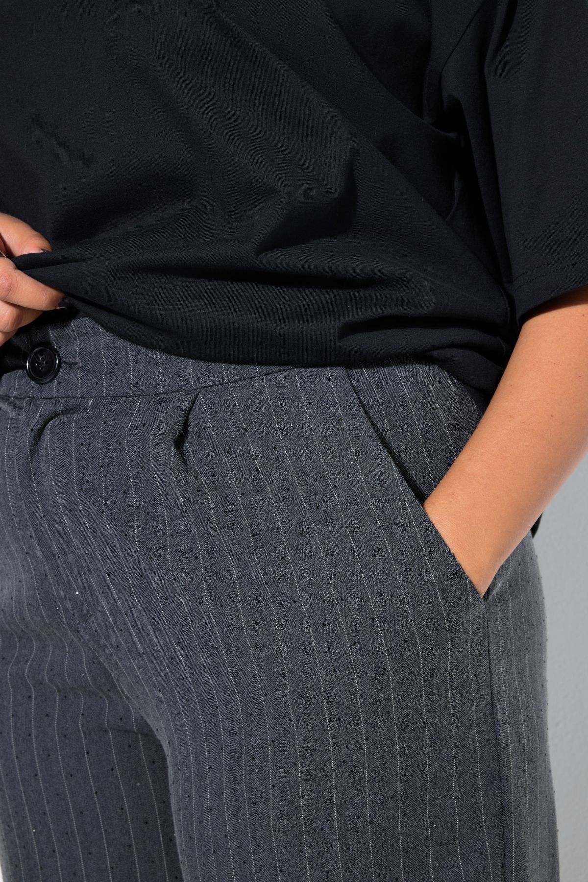 Широки крачоли, висока талия, кристали, тънки райета, частично еластичен колан, вътрешен шев приблизително 80 см.