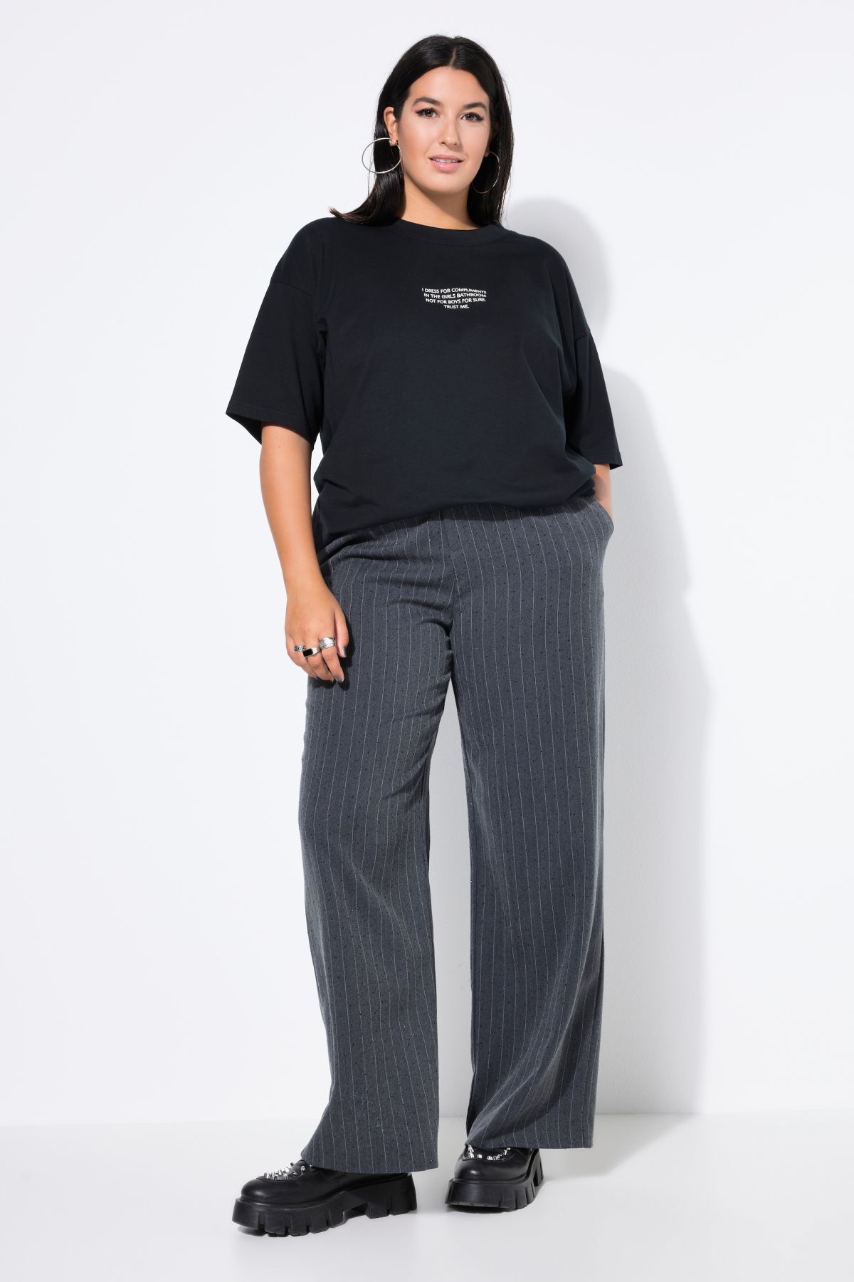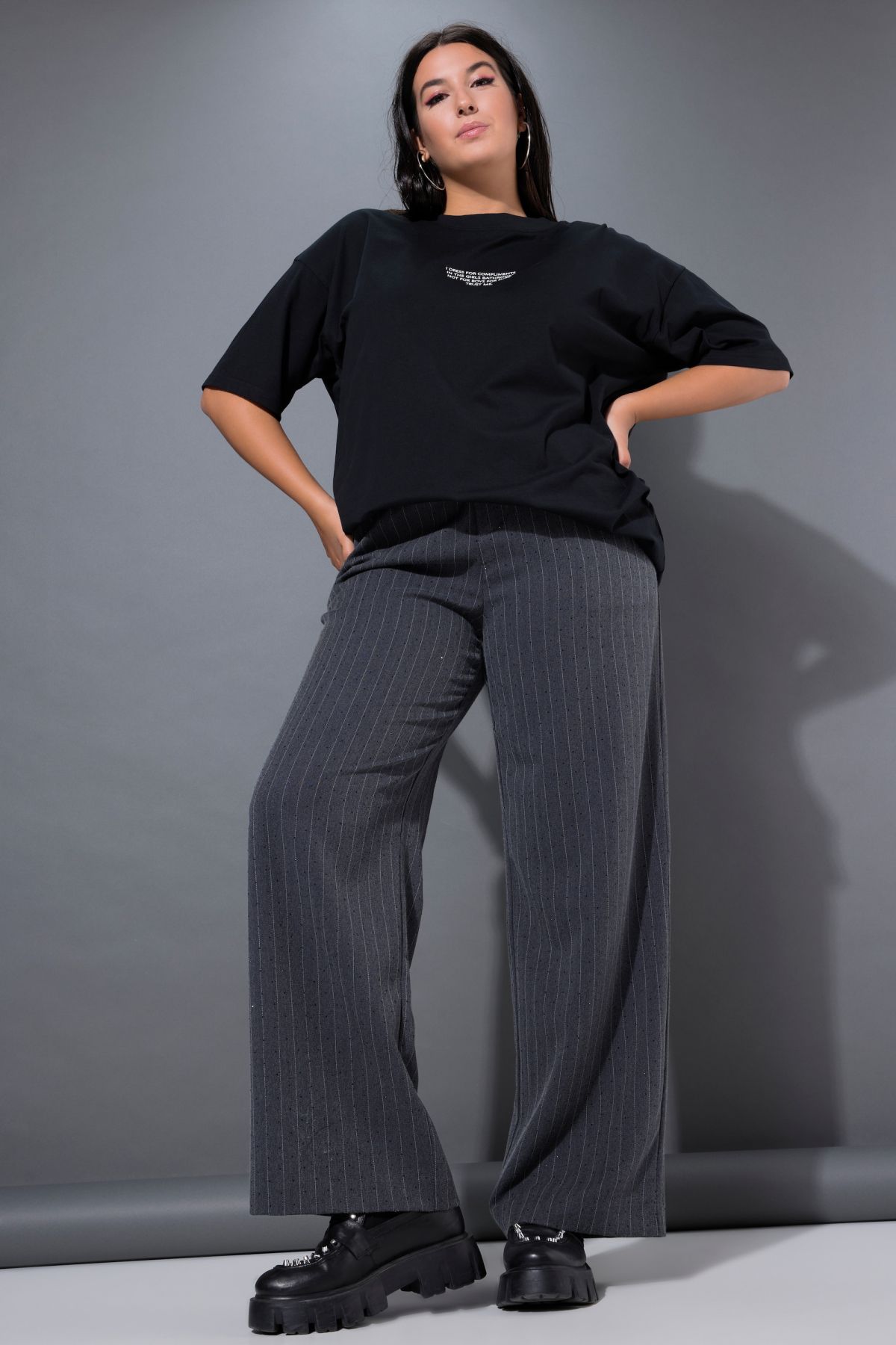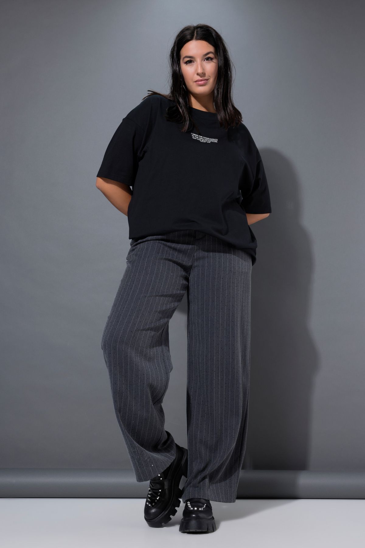 Широки крачоли, висока талия, кристали, тънки райета, частично еластичен колан, вътрешен шев приблизително 80 см.