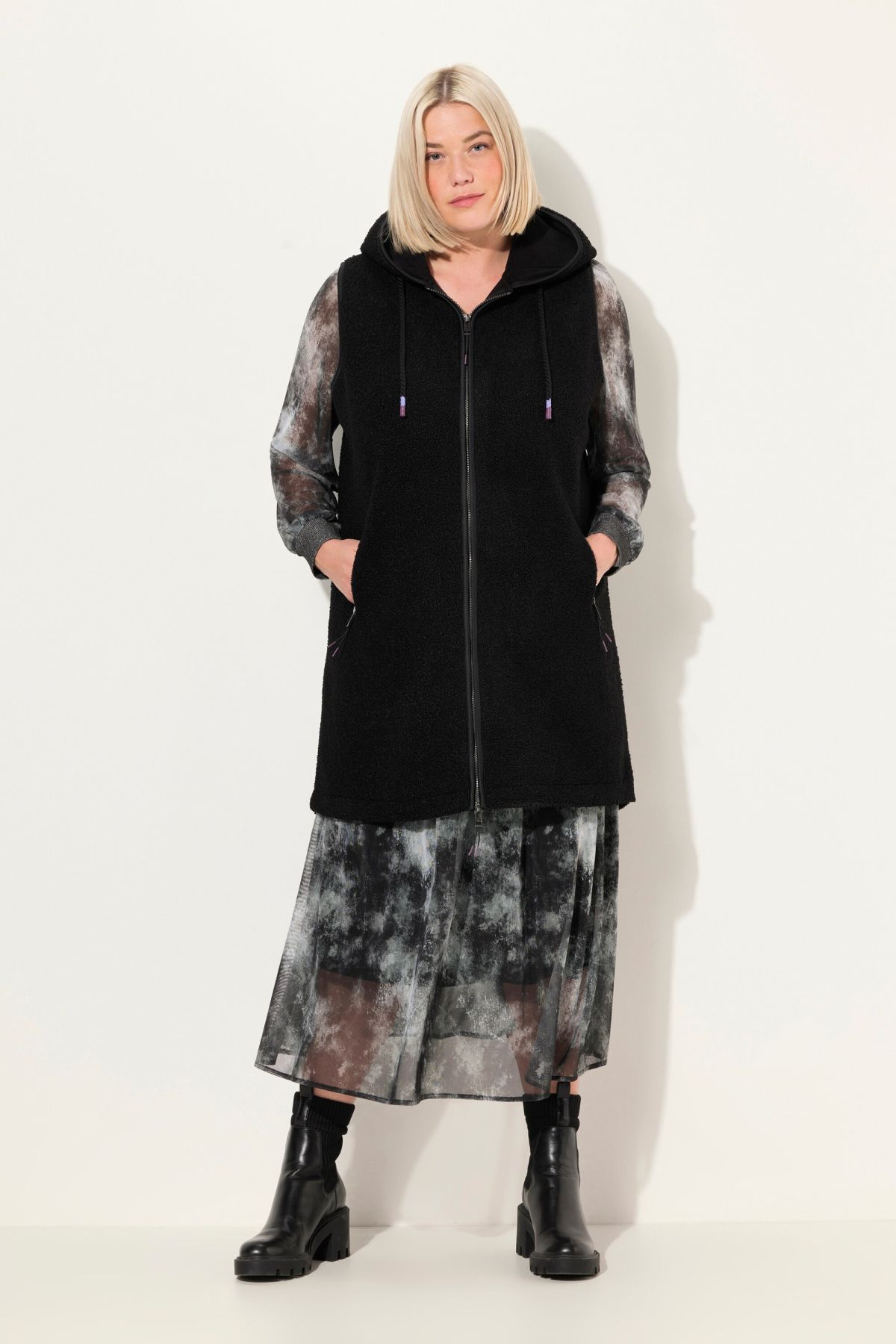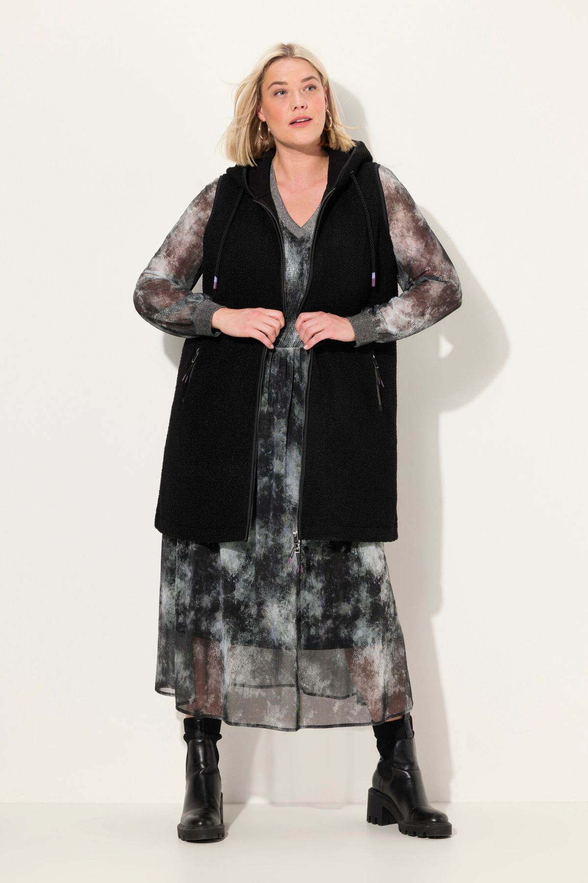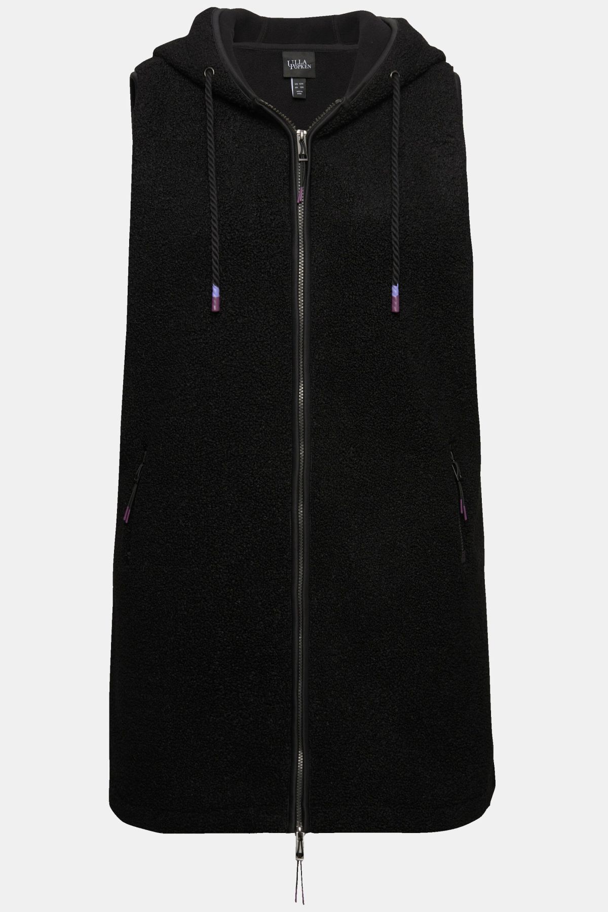Пухкав елек от плюшена материя. Луксозен и комфортен за ежедневието. Дълъг с копче отпред. С качулка с връзки.