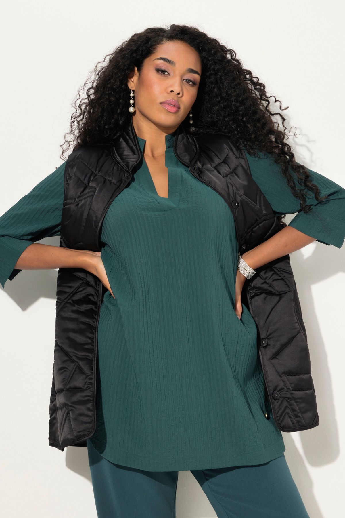 Кръшна вискоза с фина линия, стояща яка с V-образно деколте, дълги странични цепки за повече свобода на движение, 3/4 ръкави с цепка, леко заоблен подгъв, дължина около 86 см.