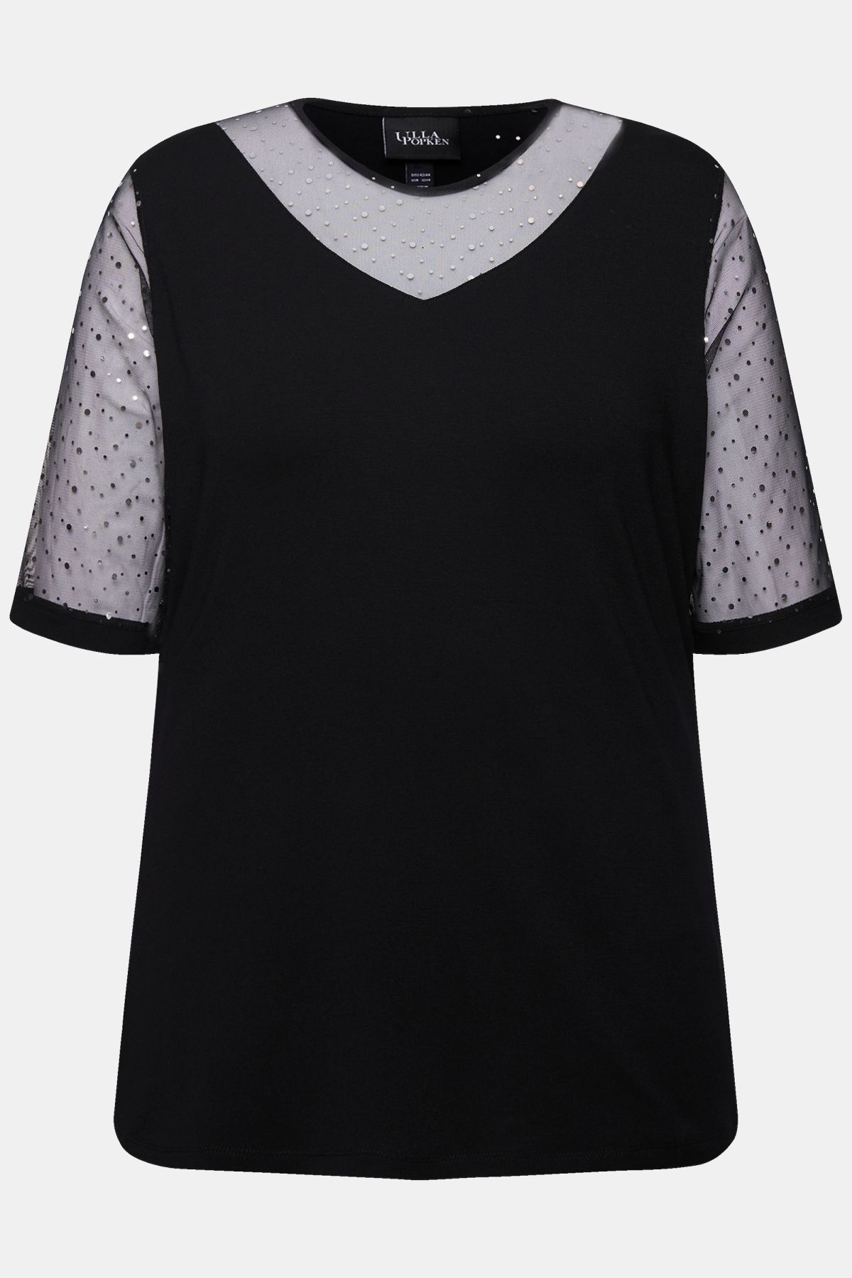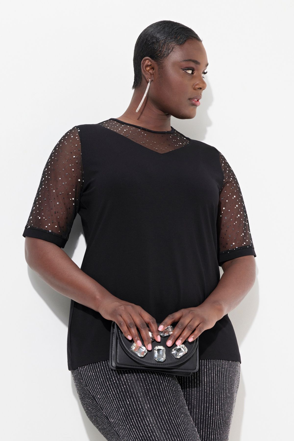Блуза с мрежа и пайети от прозрачна материя. С бляскави камъчета. В комфортен трикотажен стил.