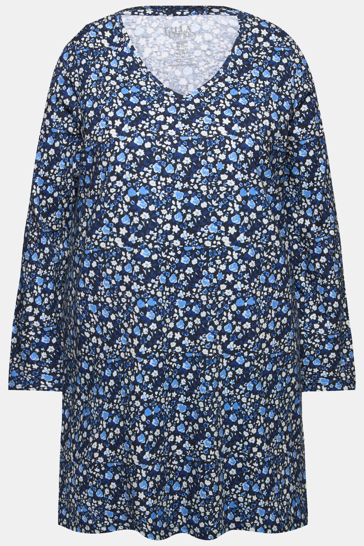модна щампа, V-образно деколте, дълга А-линия с удобен широк подгъв, дълги ръкави, чист памук, дължина около 86 см.