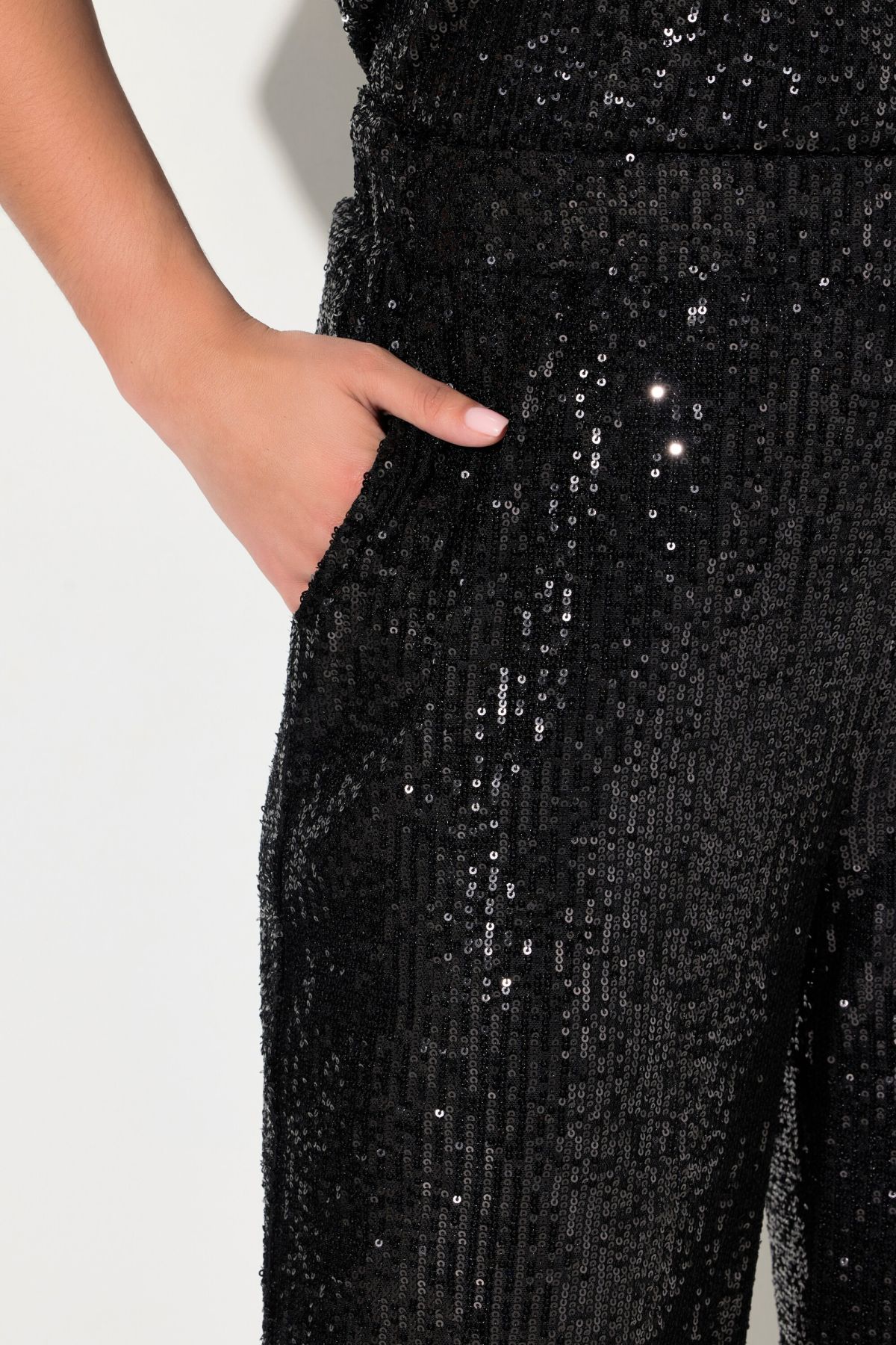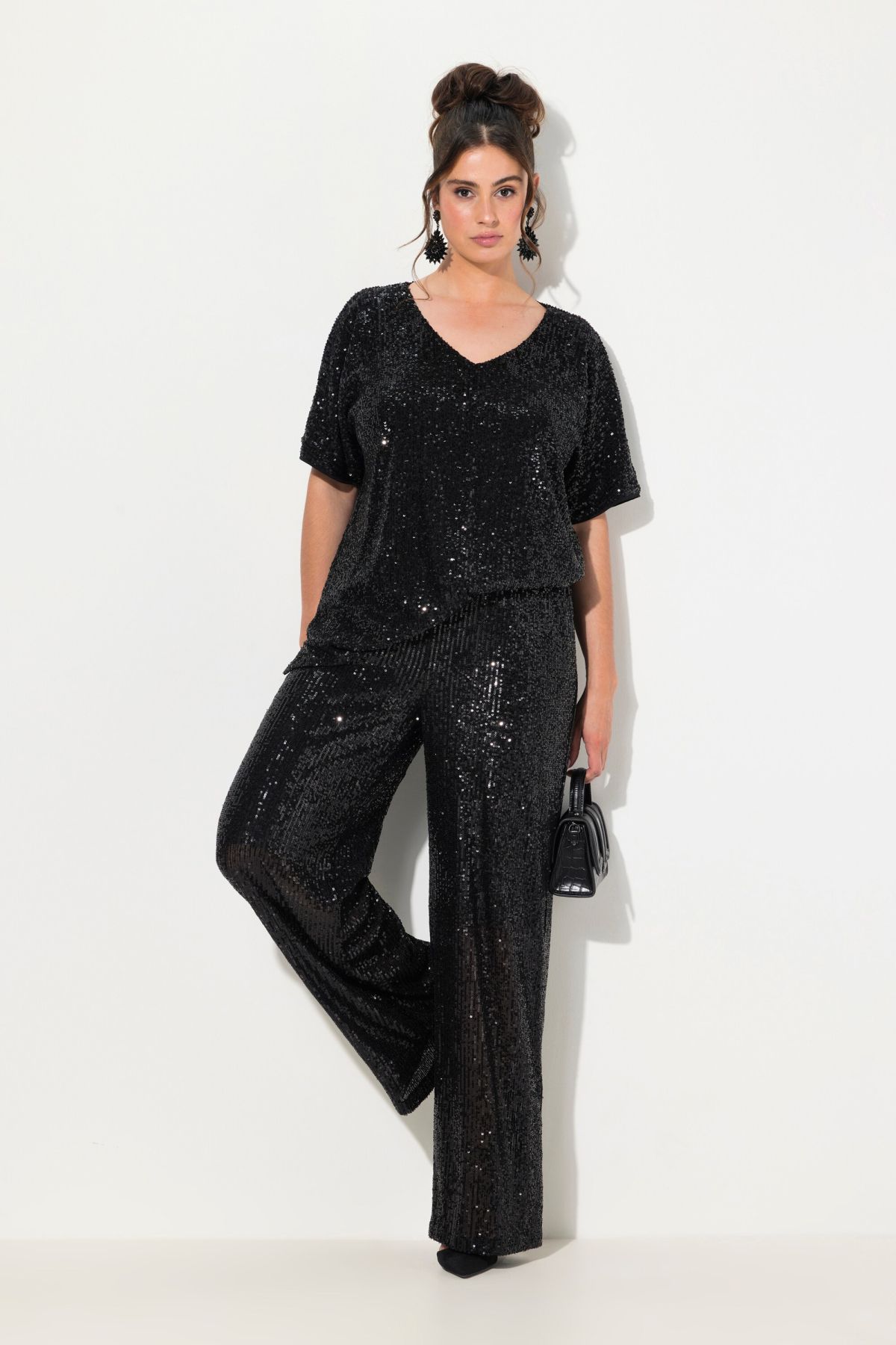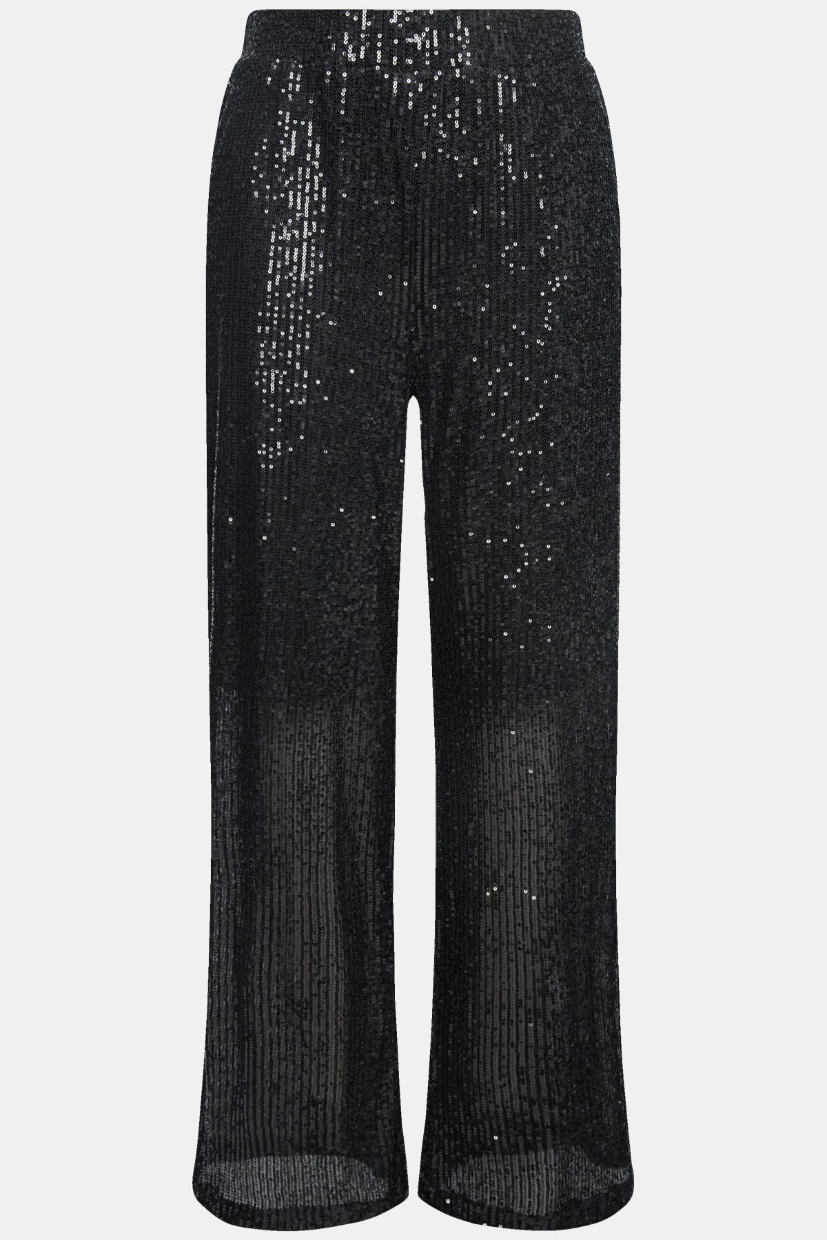 Панталон с пайети и модерни широки крачоли. Стилен и бляскав за всяко празнично събитие. С еластична талия и странични джобове.