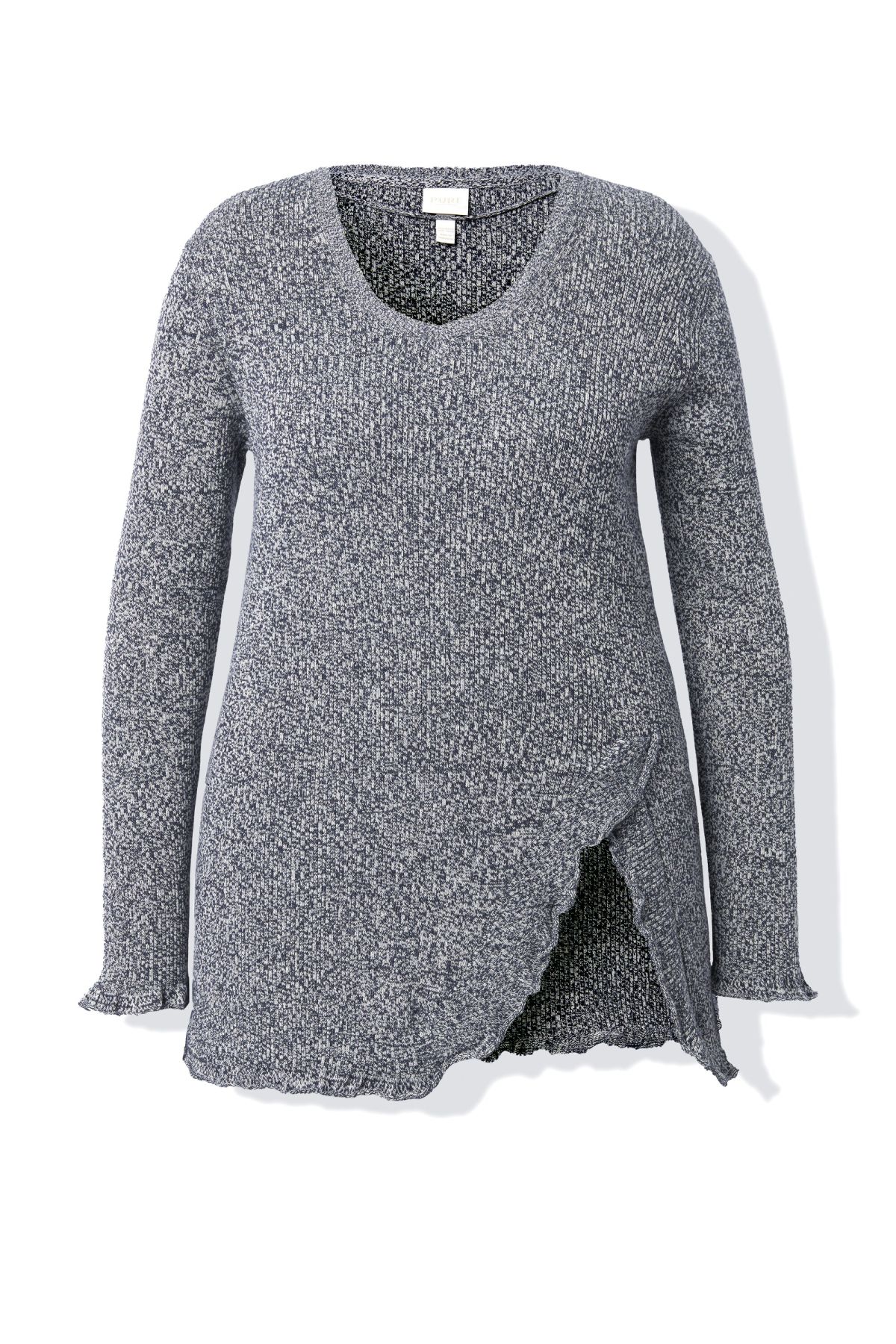 Пуловер от мека, памучна материя с асиметричен къдрав подгъв, С кръгло деколте и дълги ръкави. Идеален за студените, зимни дни.
