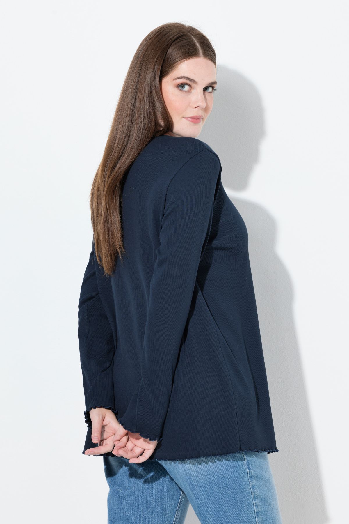 Блуза с асиметрична цепка отпред на подгъва с къдрави акценти. С дълбоко кръгло деколте и дълги ръкави. От мека, памучна материя.