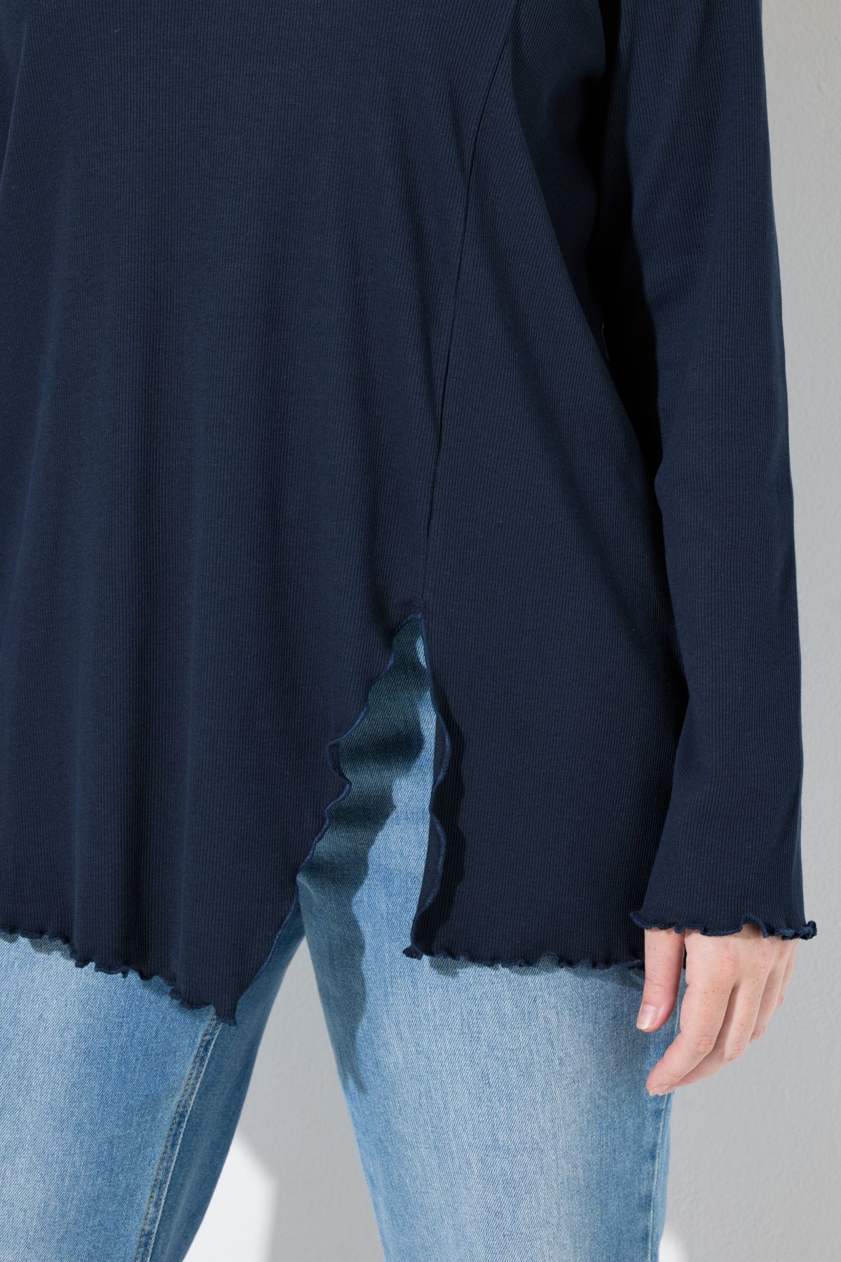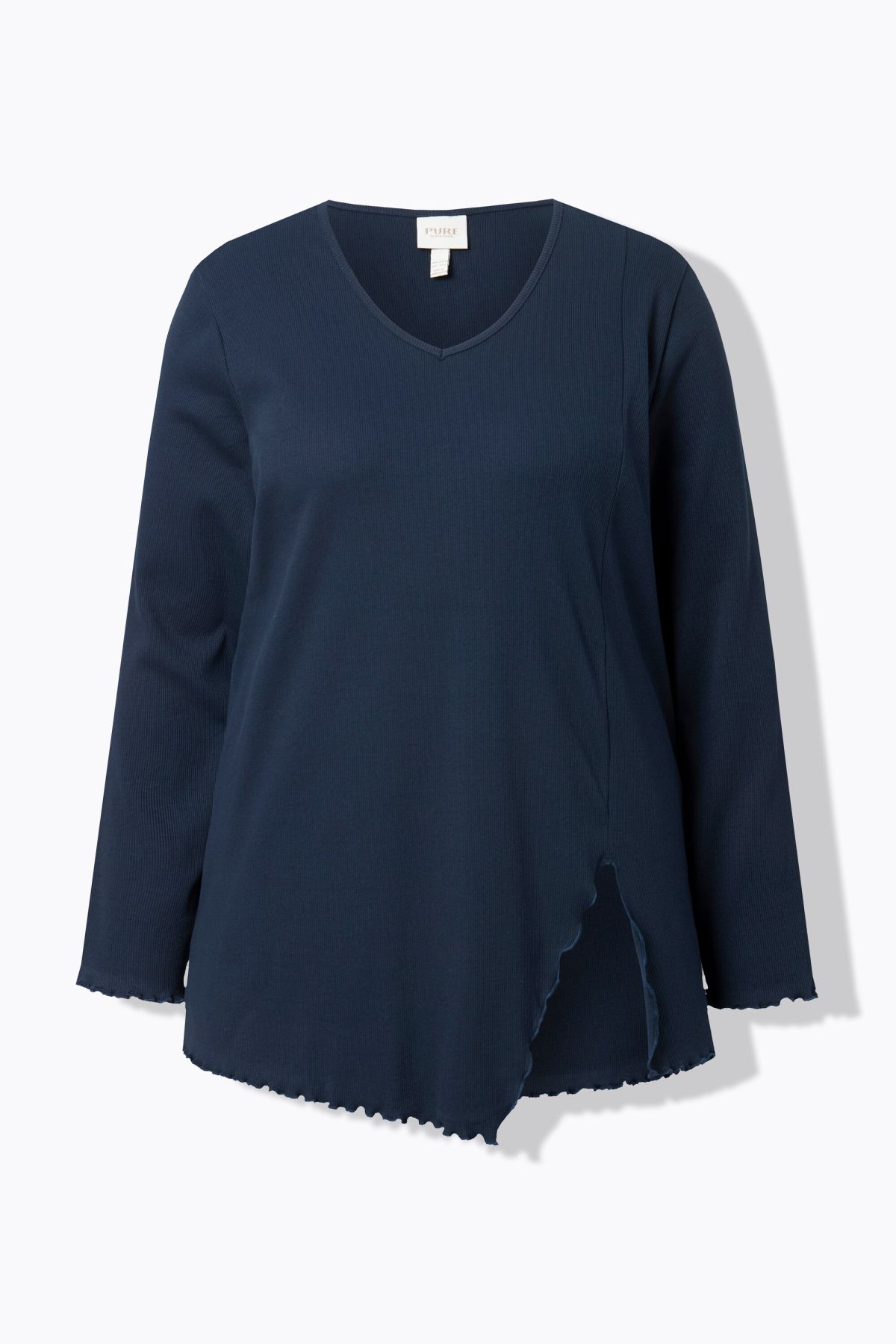 Приятно еластично оребрено трико, заоблено V-образно деколте, асиметричен подгъв с диагонална цепка, тесни волани в краищата, устойчив органичен памук с еластан, дължина, регулирана по размер, приблизително 72-76 см.