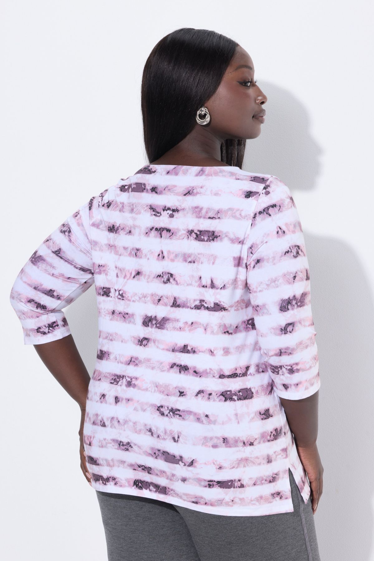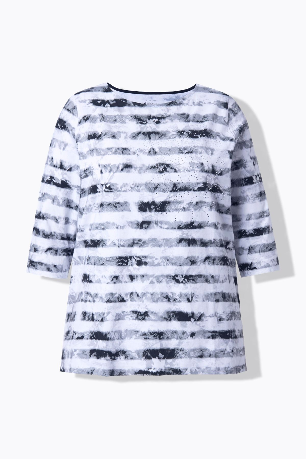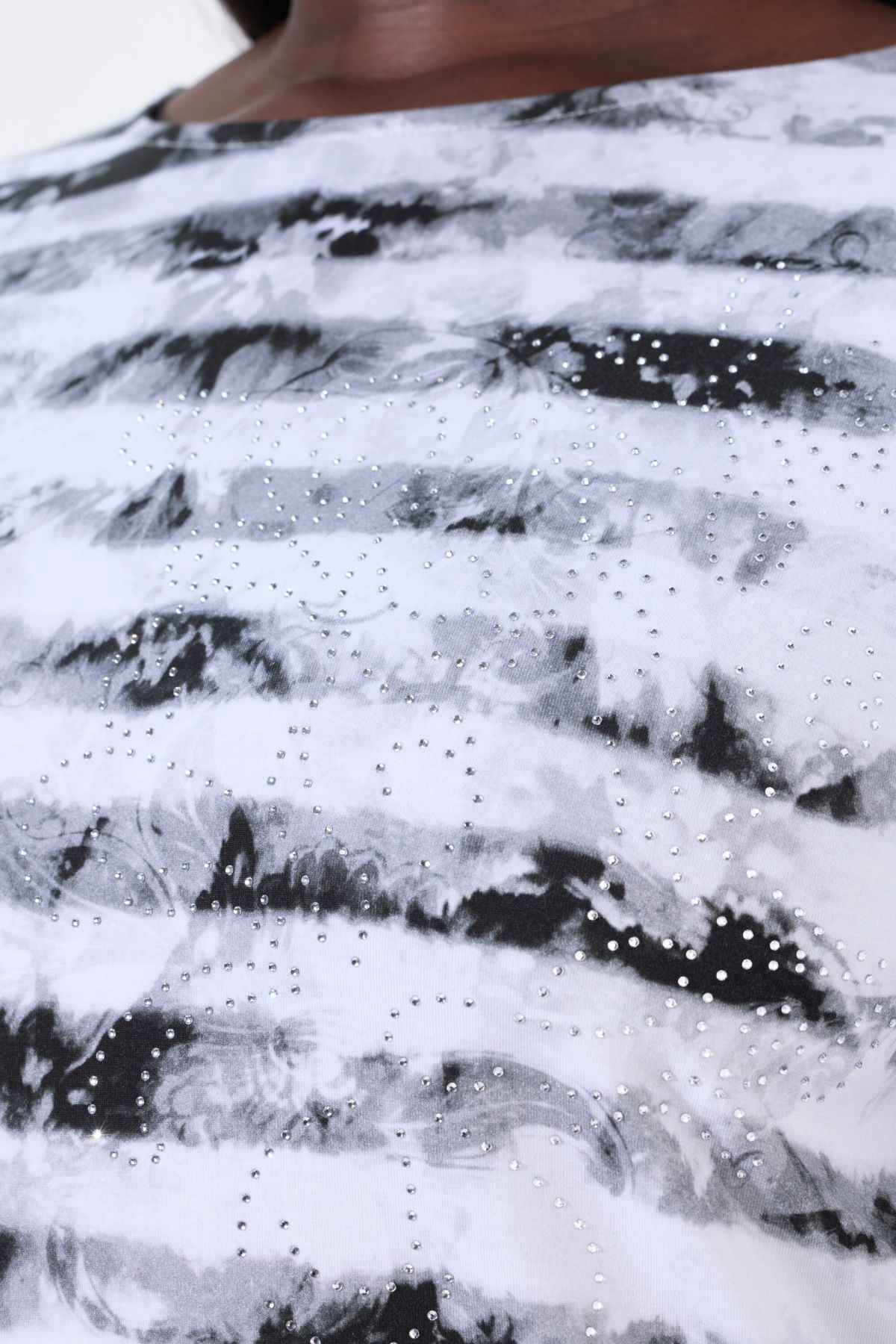 Тениска с модерни батикови райета с акцент от бляскави камъчета. С кръгло деколте и 3/4 ръкави. От мека, еластична материя.