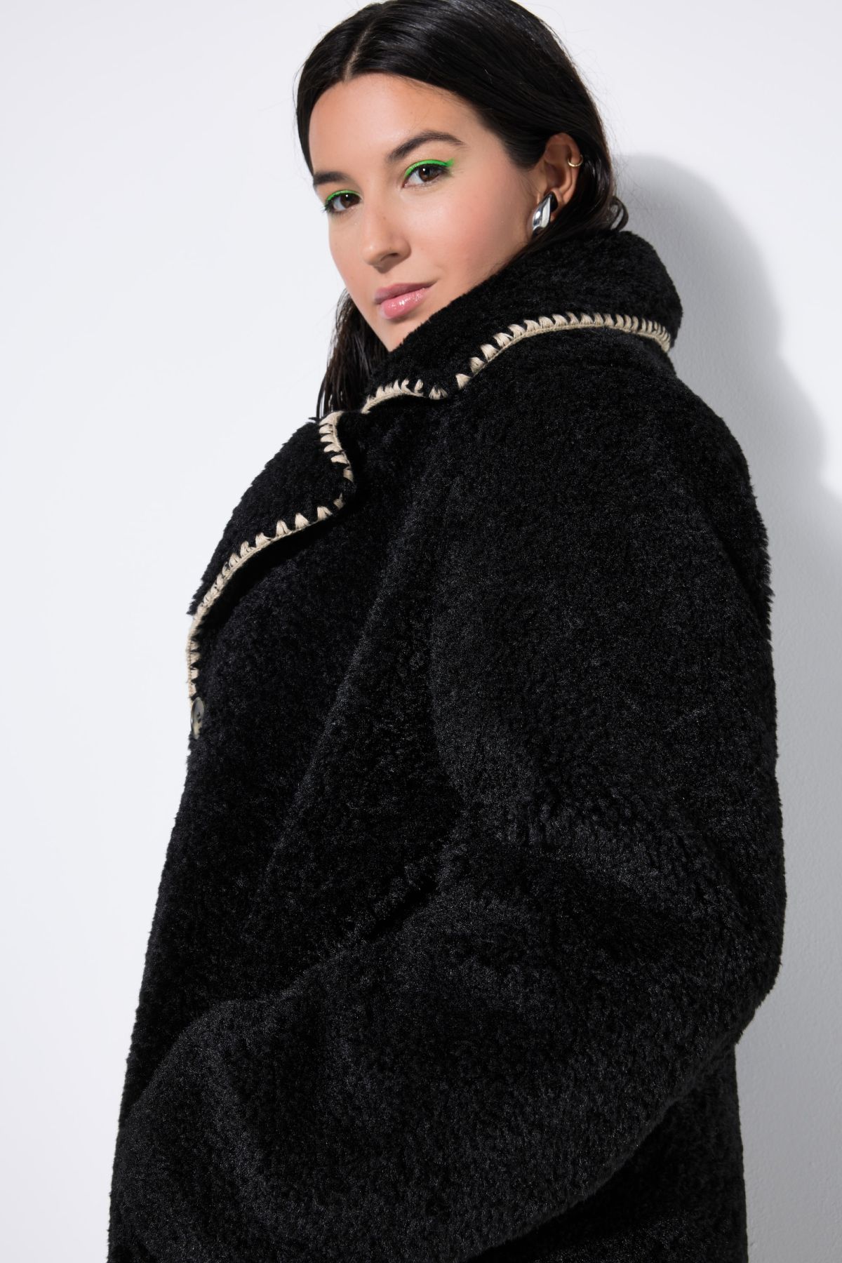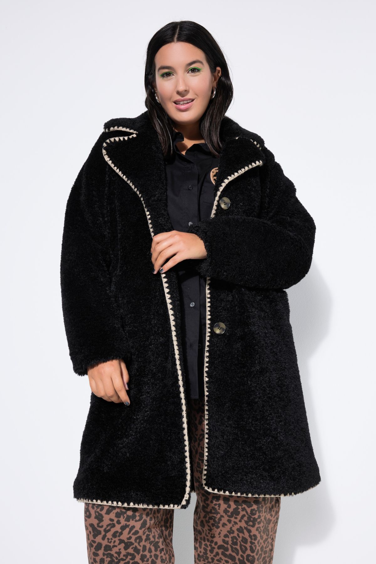 Палто от мека, плюшена материя с декоративни шевови акценти. С копчета отпред, ревери на яката и странични шевови джобове. С подплата.