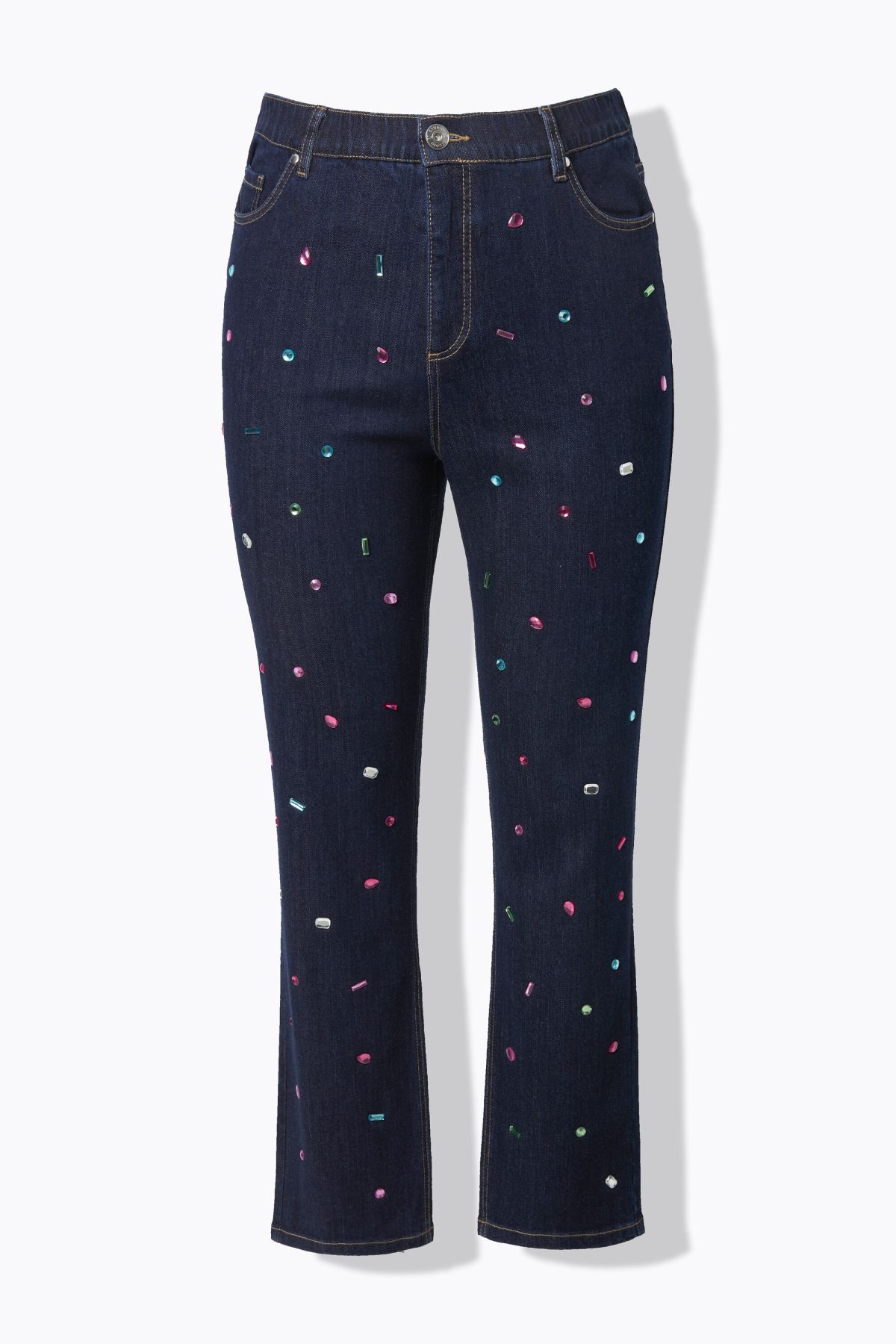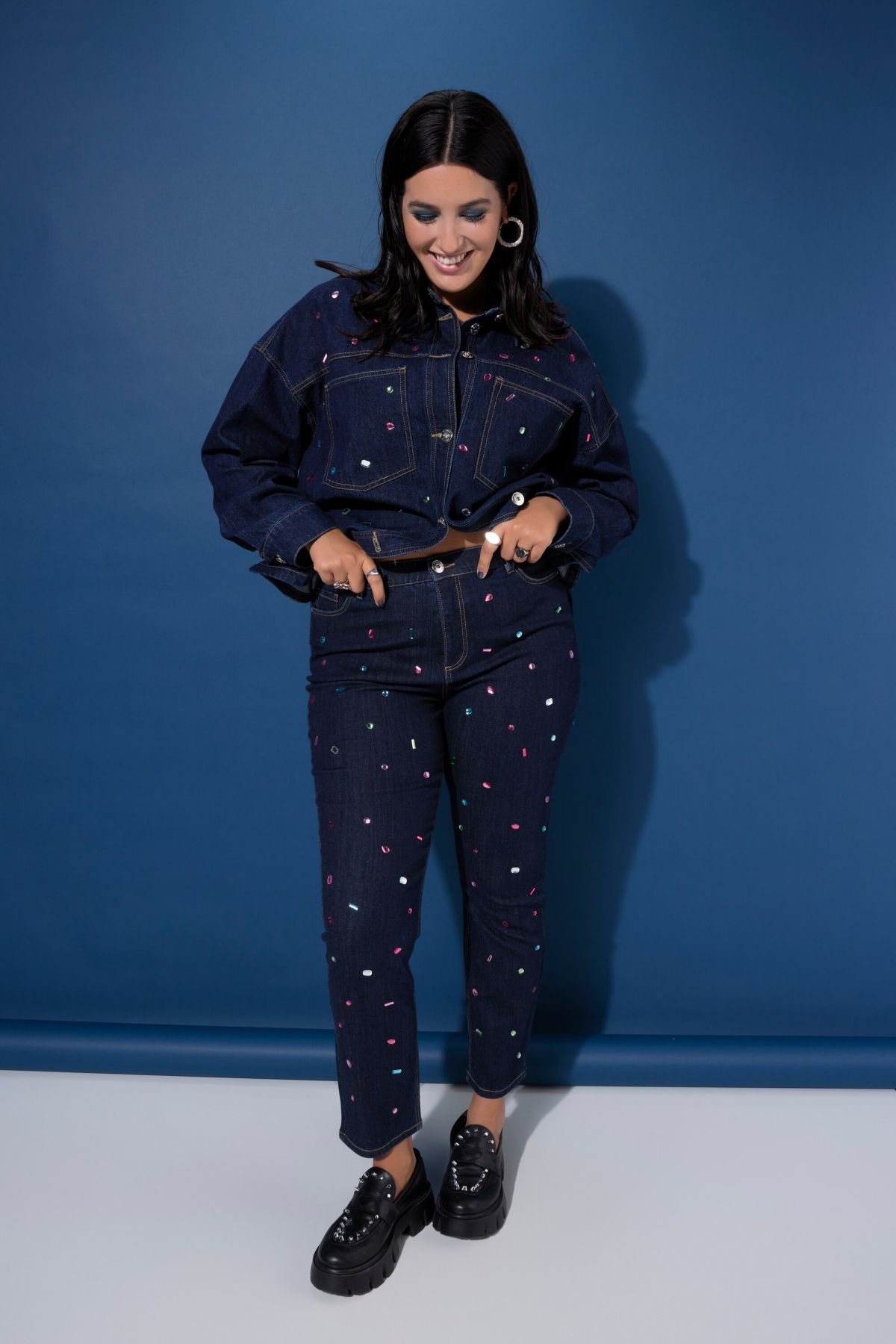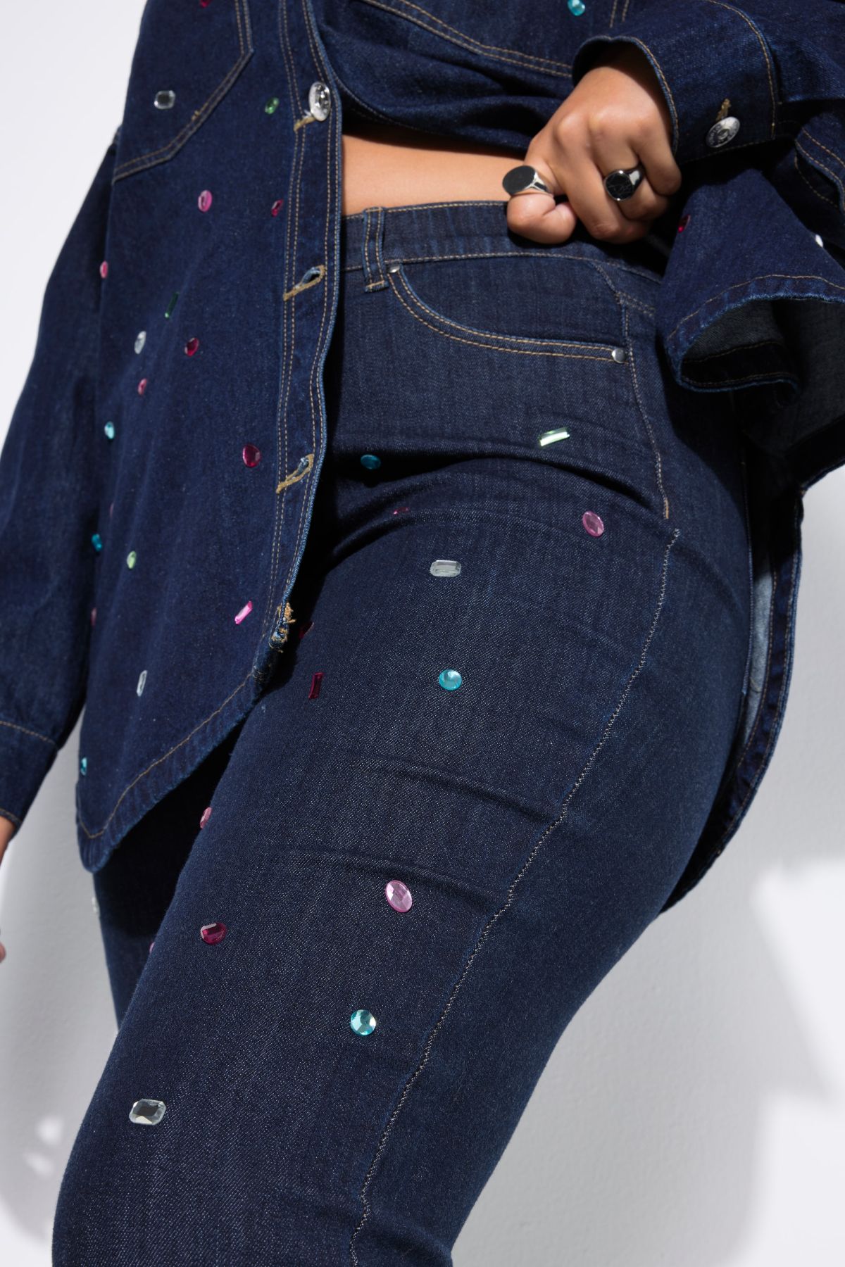 Дънки тип Mom с камъчета. Дизайн с фиксирана талия с гайки за колан, копче и цип отпред и 5 джоба. С широки крачоли и комфортна кройка.