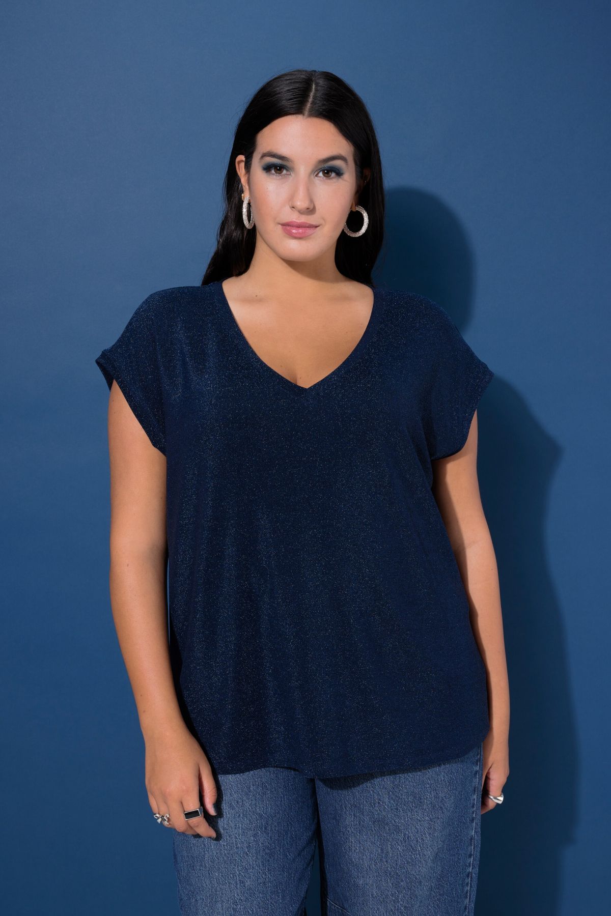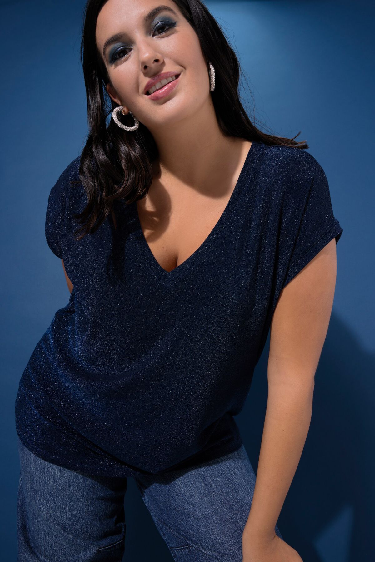 Тениска с бляскави принт от мека, трикотажна материя. С V - образно деколте, къси ръкави тип шапка и А - линия на силуета.