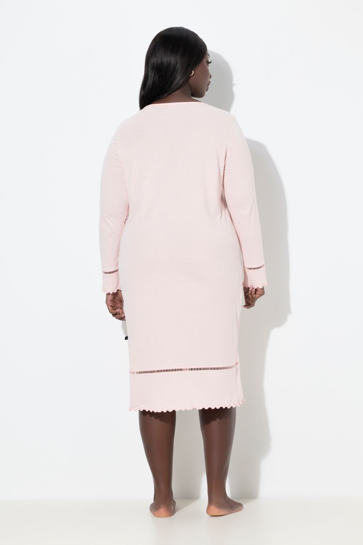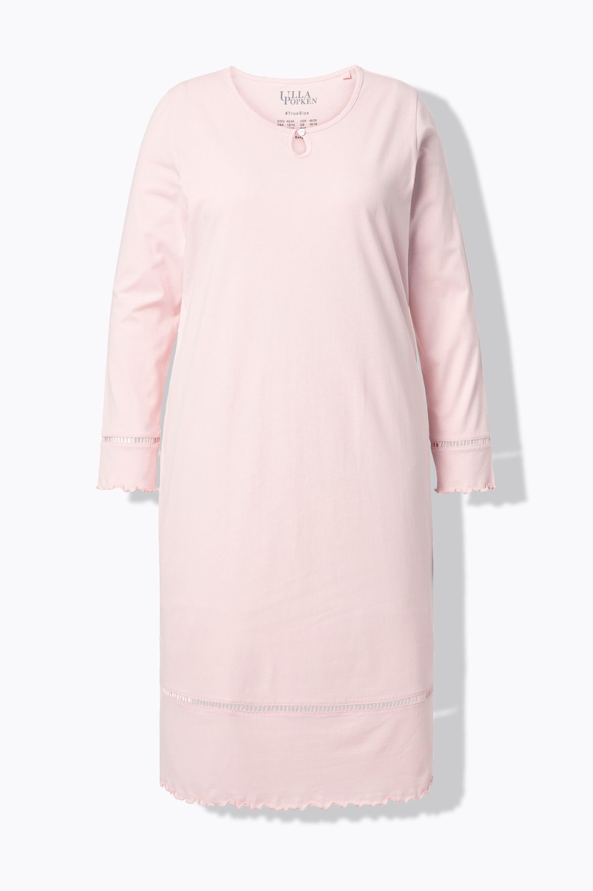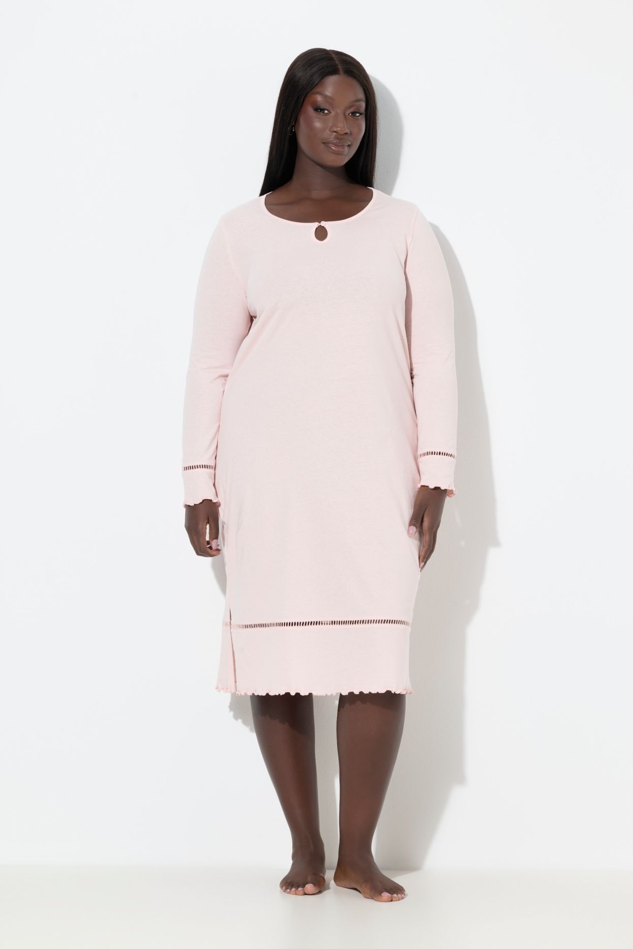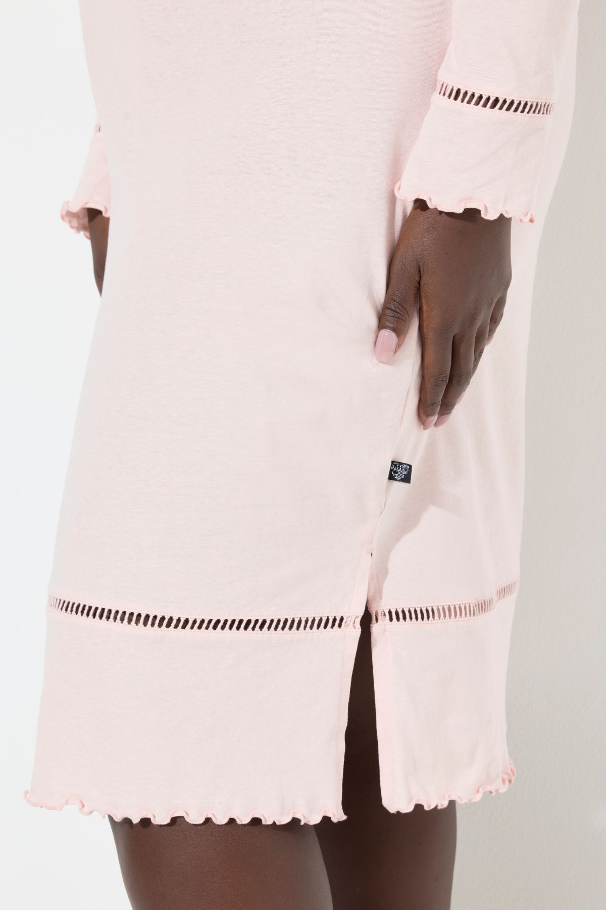 Нощница с дантела на подгъва. С дълги ръкави и подгъв с разкроения. С кръгло деколте, малка цепка с копче и странични цепки.