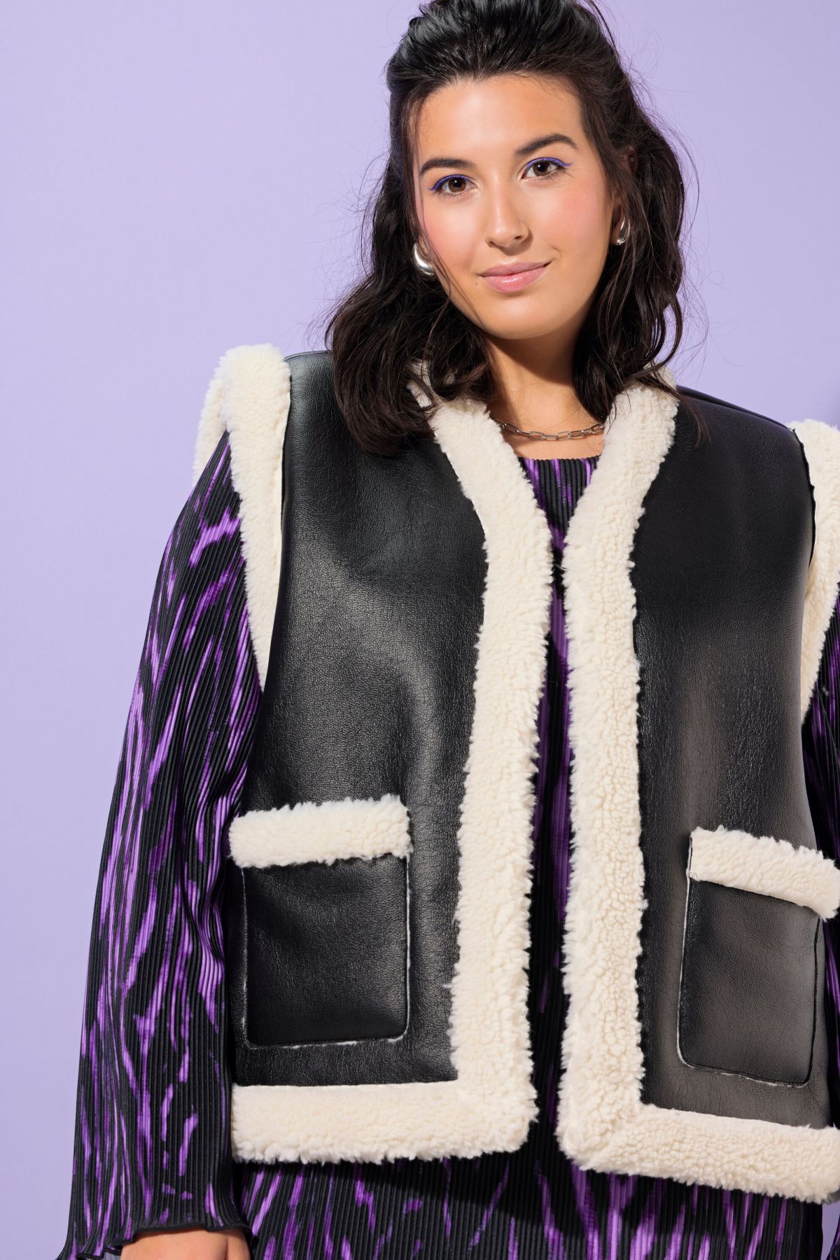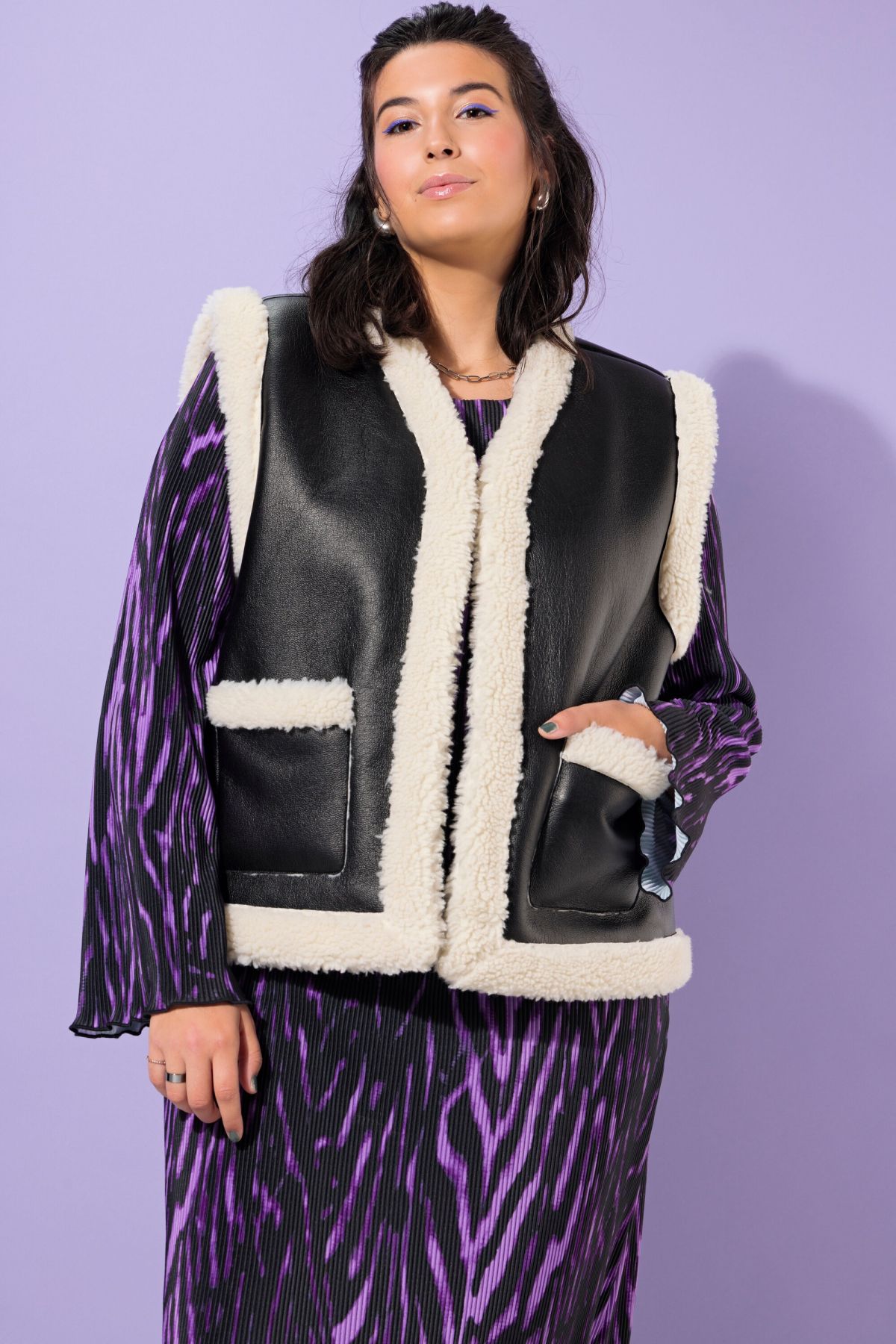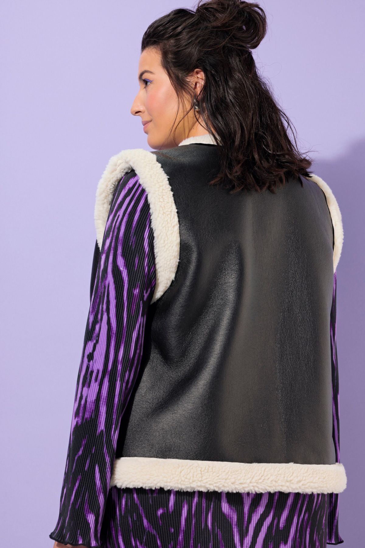 Елек с кожена визия и каракул. С А - линия на силуета. С V - образно деколте и 2 джоба. С външни, странични джобове.