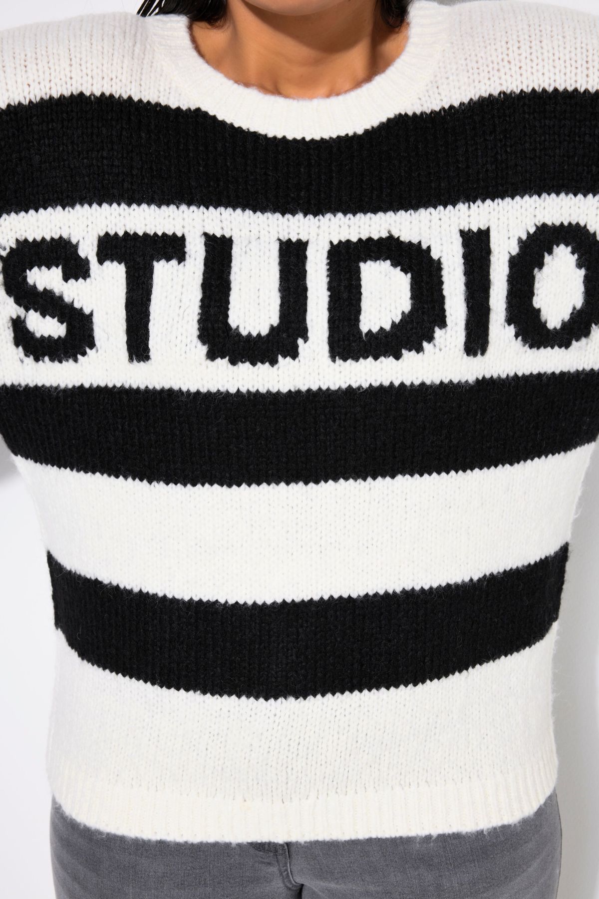 Пуловер с разкроен силует от мека, плетена материя с декоративни мъниста отпред. С кръгло деколте, паднали рамене и дълги ръкави с рипсени маншети.