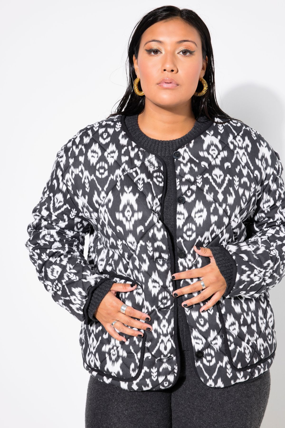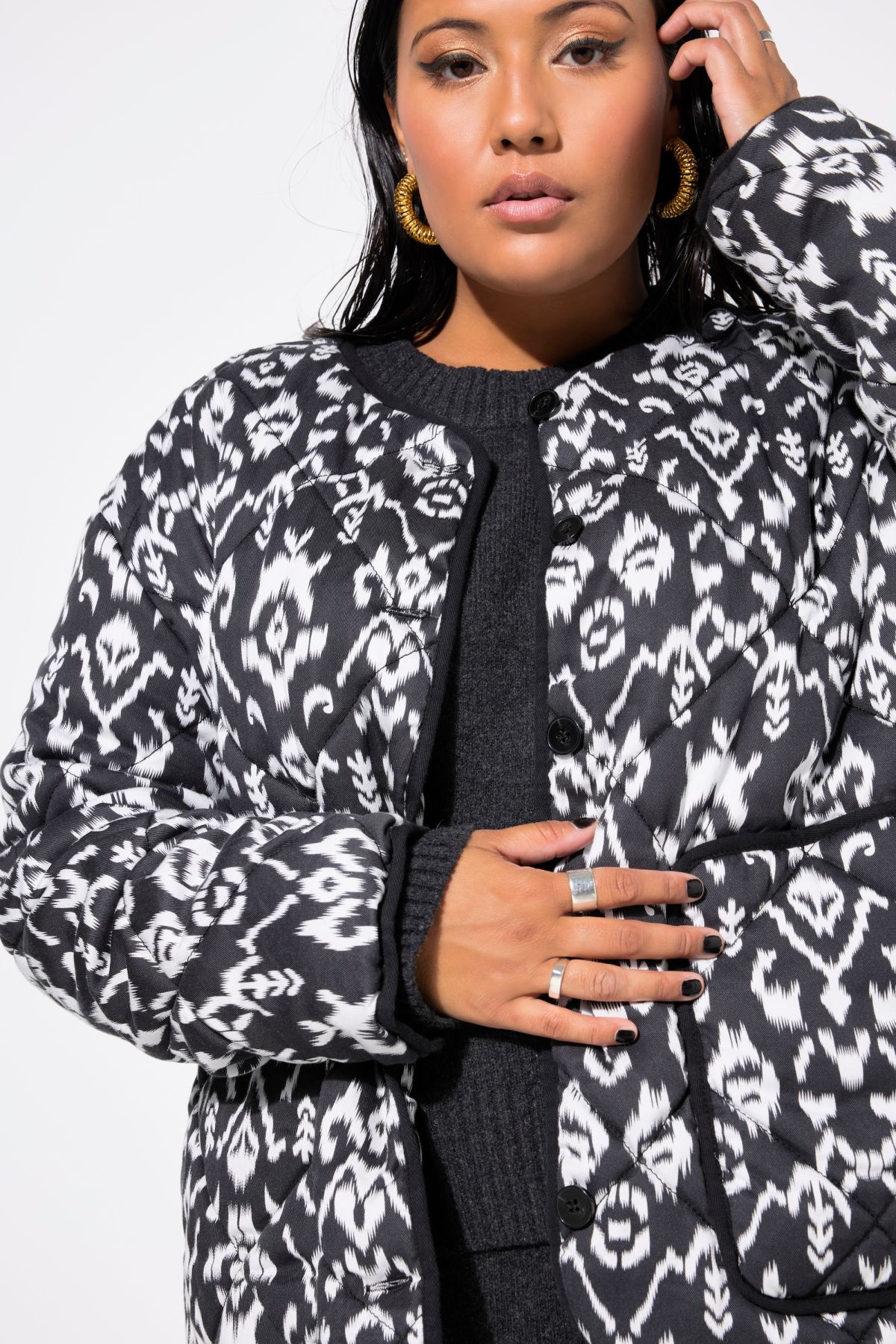 Яке с принт икат и къс силует. С външни странични джобове, копчета отпред и без яка. Леко и ватирано.