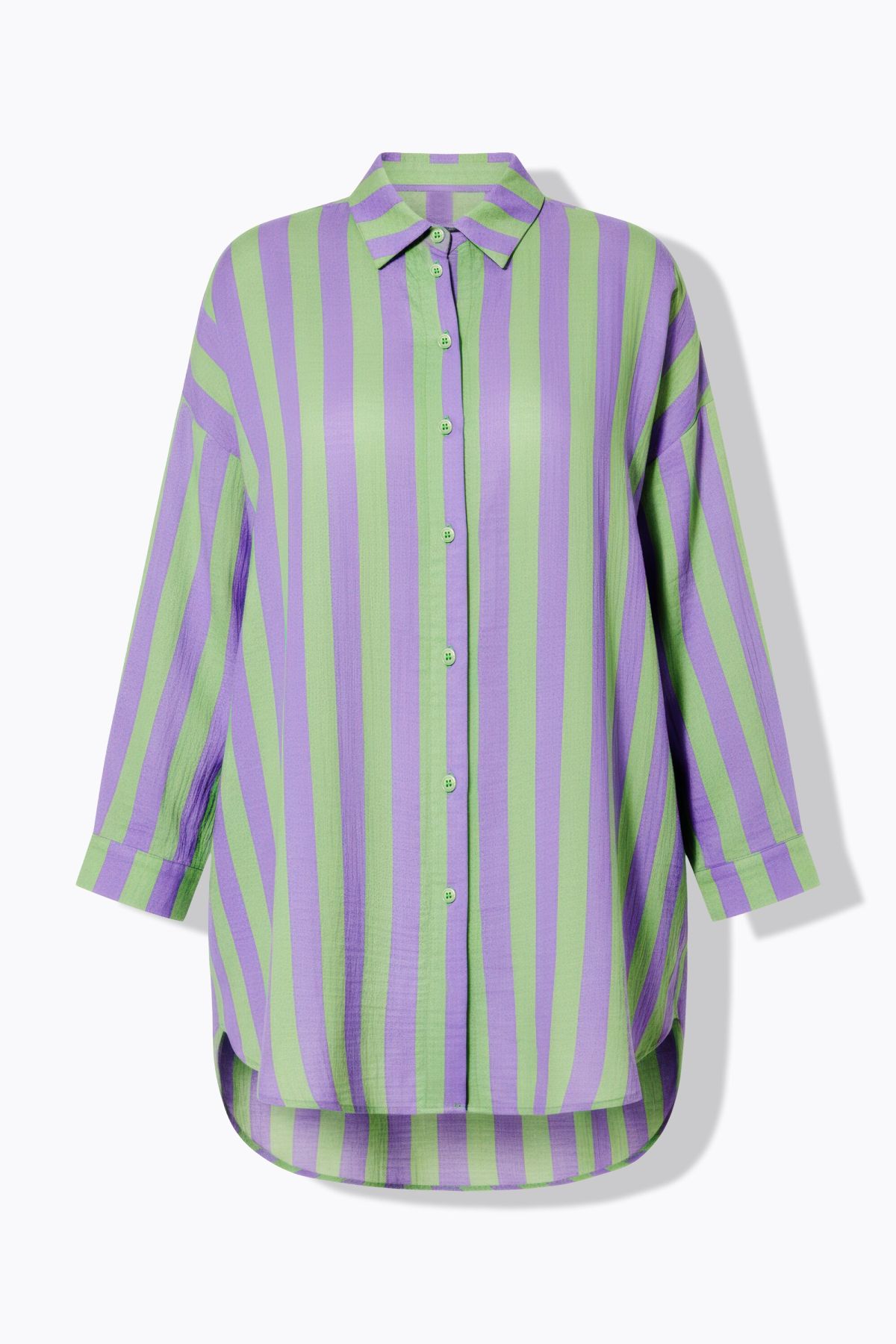 Риза от муселин с модерни райета. С яка, паднали рамене и дълги ръкави с маншет с копче. С подгъв със странични цепки, по - дълъг отзад.
