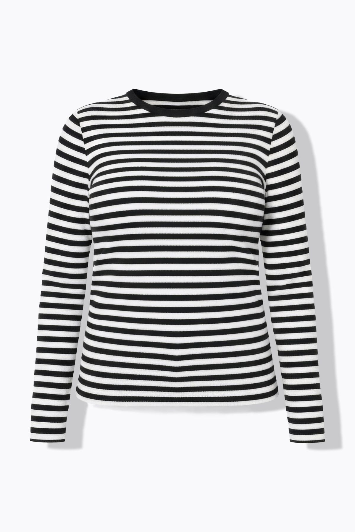Тениска с райета и кръгло, контрастно деколте. От еластична материя с тесен силует. С дълги ръкави.