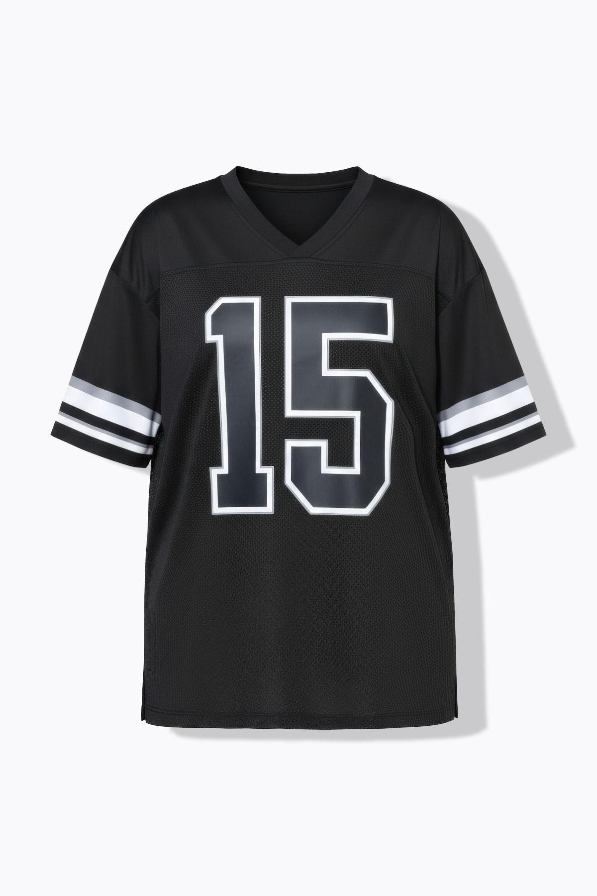 Тениска с мрежа и надпис. В спортен силует с разкроена визия. С V - образно деколте и къси ръкави с райета.