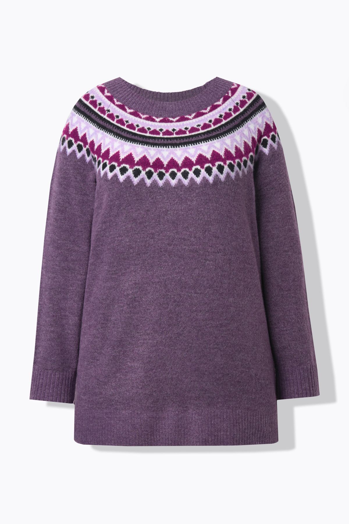 Пуловер с принт на алпийски райета - пухкав, мек и разкроен, с който ще сте готови за зимните дни. С кръгло деколте и дълги ръкави.
