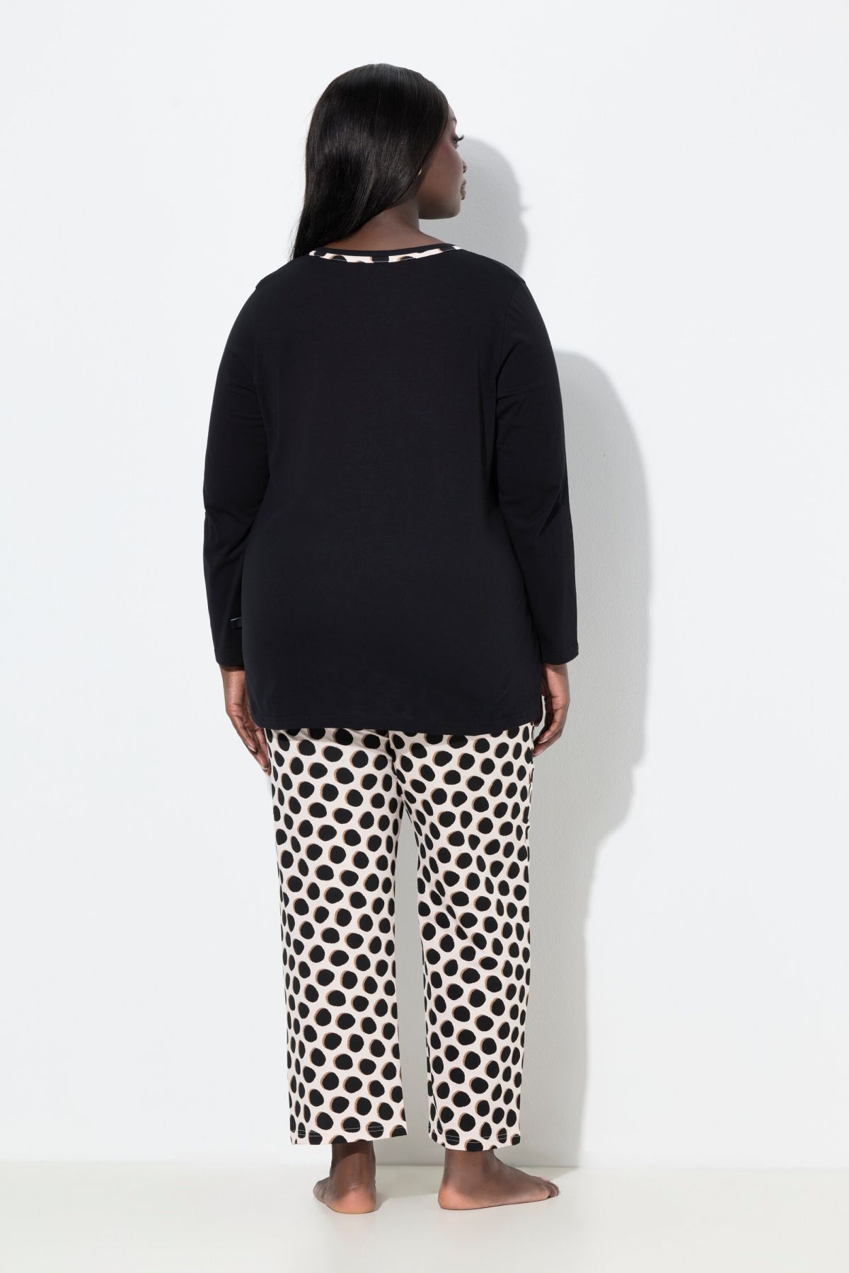 Пижама с принт на точки. С едноцветно долнище с акцент на кръглото деколте и дълги ръкави. С долнище с еластична талия и странични шевови джобове.