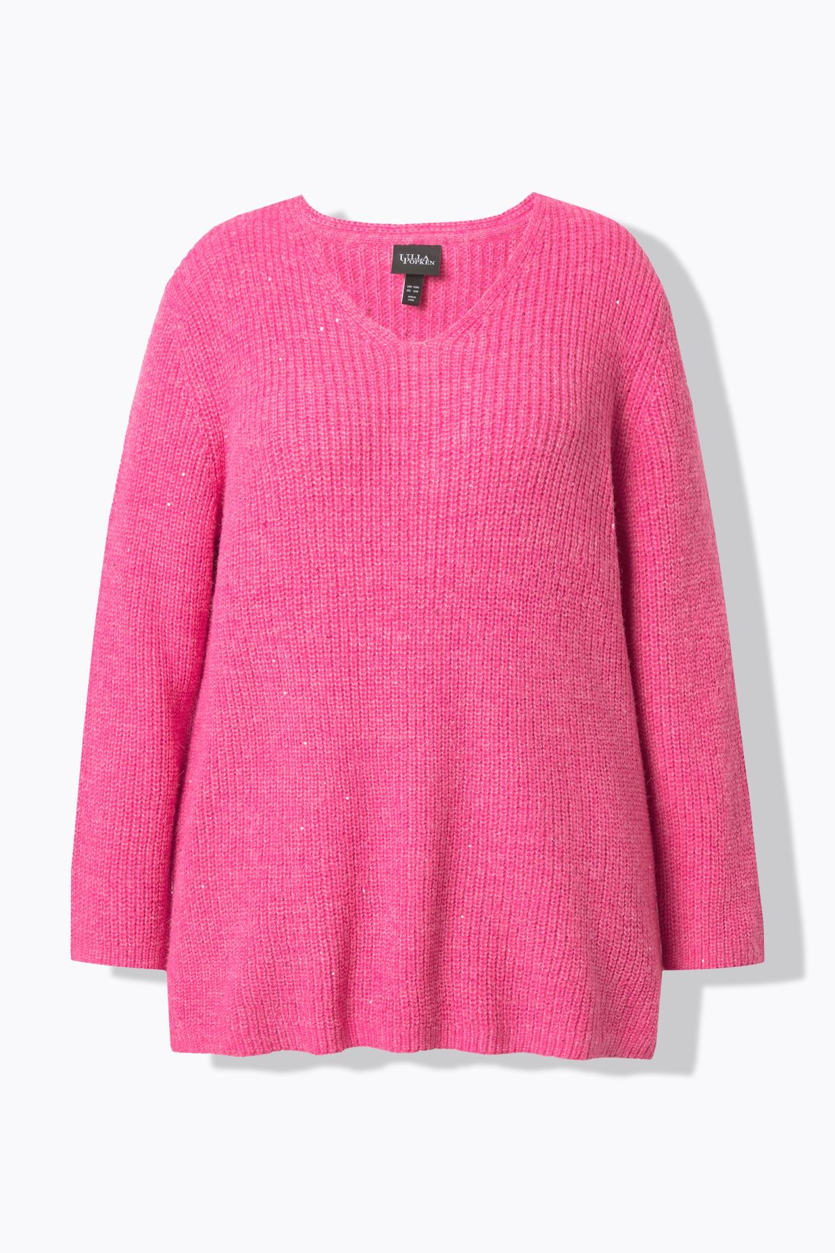 Пуловер с пайети от мека, плетена материя. С дълбоко V - образно деколте и дълги ръкави. Стилен и елегантен завършек на всяка визия.
