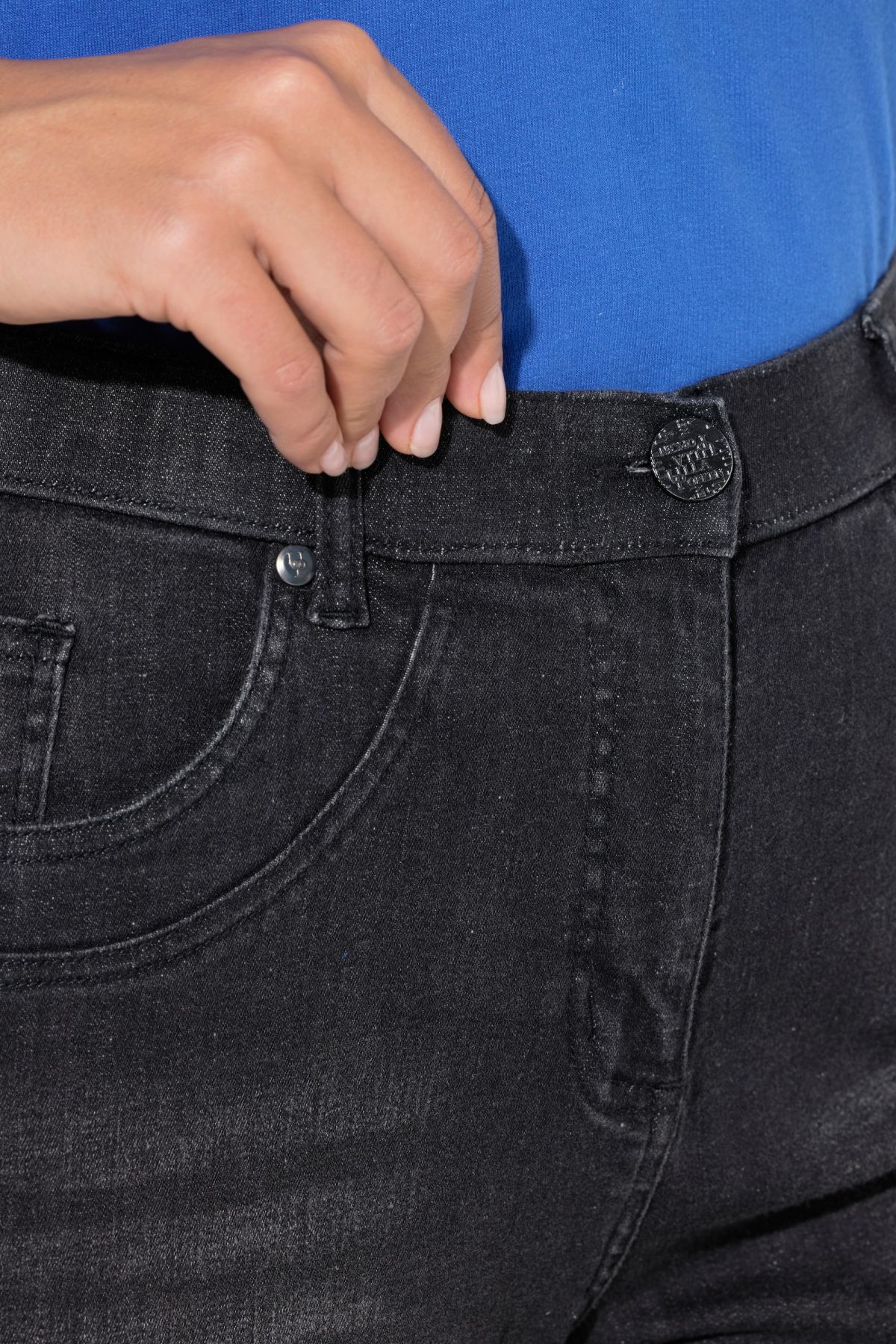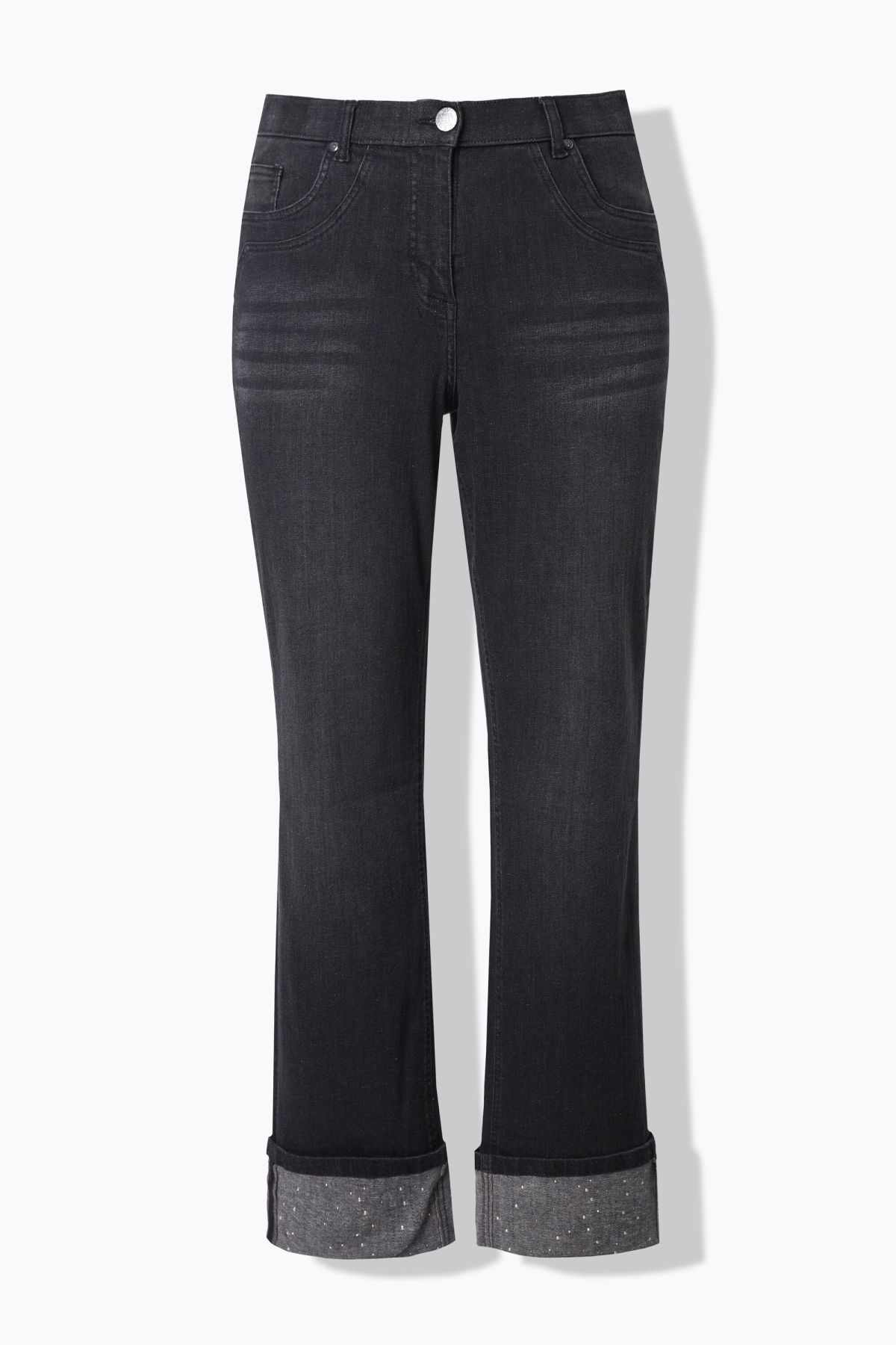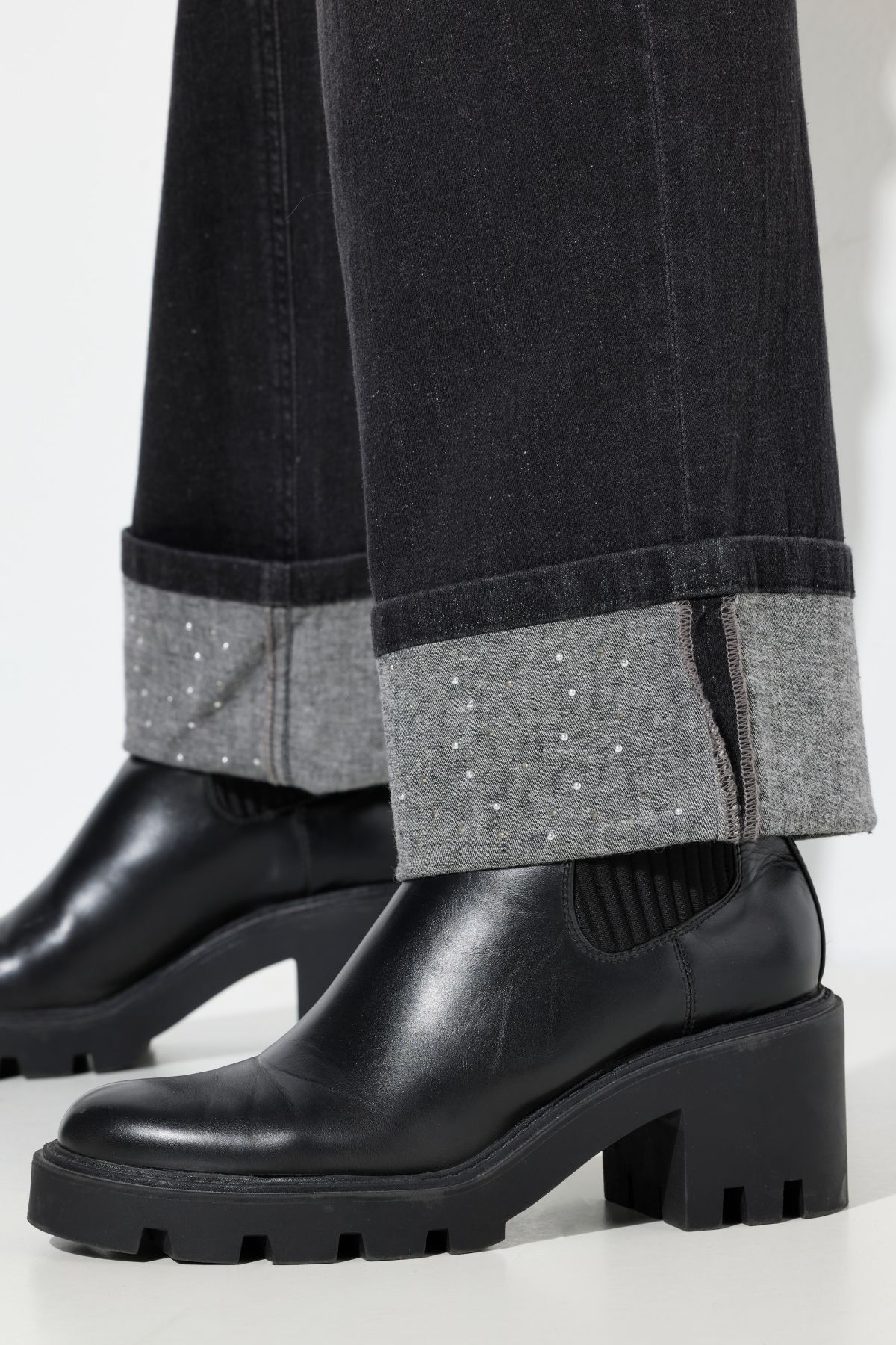 Дънки с акцент от бляскави камъчета с широк маншет на подгъва. С фиксирана талия с гайки за колан, копче и цип отпред. Дизайн с 5 джоба.