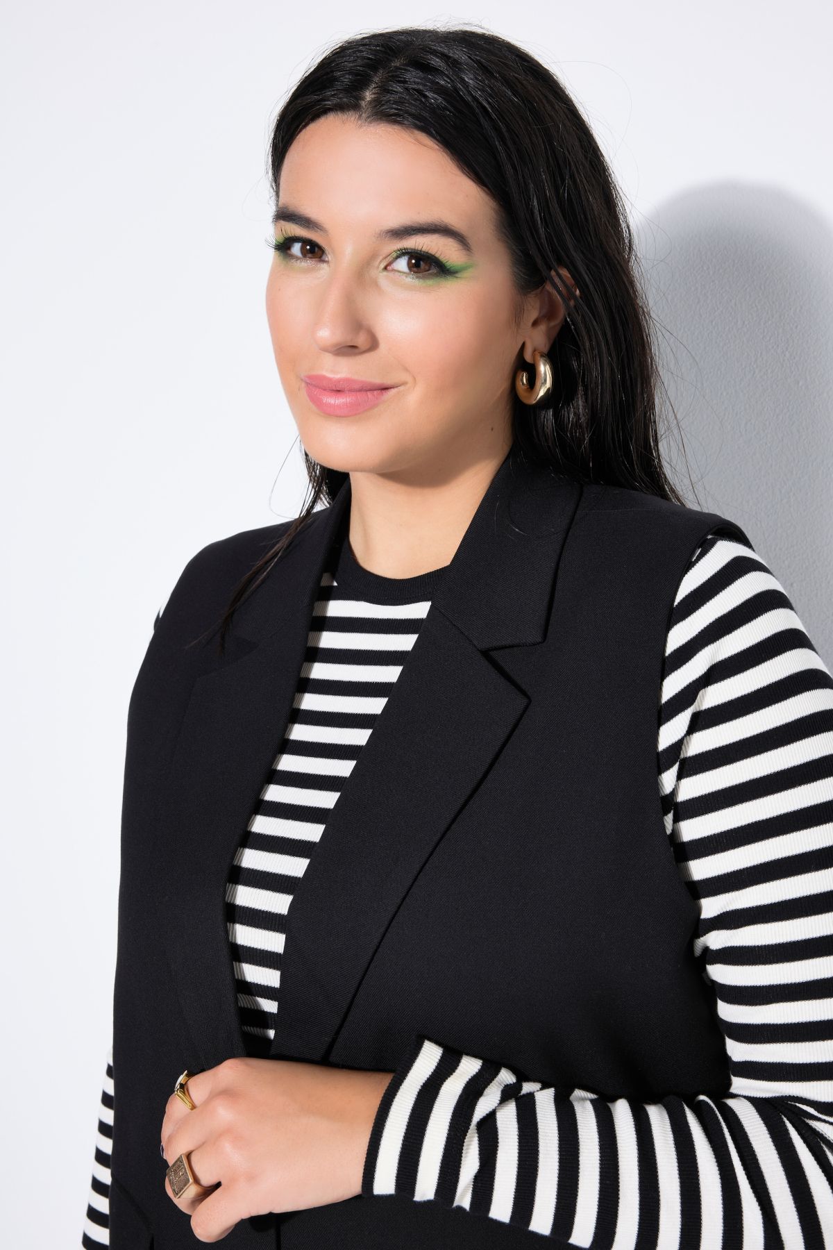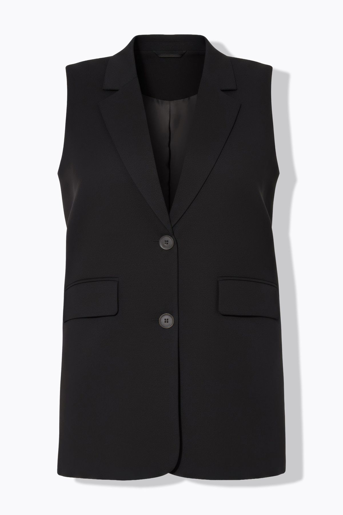 Елек тип блейзър с ревери на яката. С разкроена кройка и модерно усещане. С копчета отпред и странични джобове с капак.
