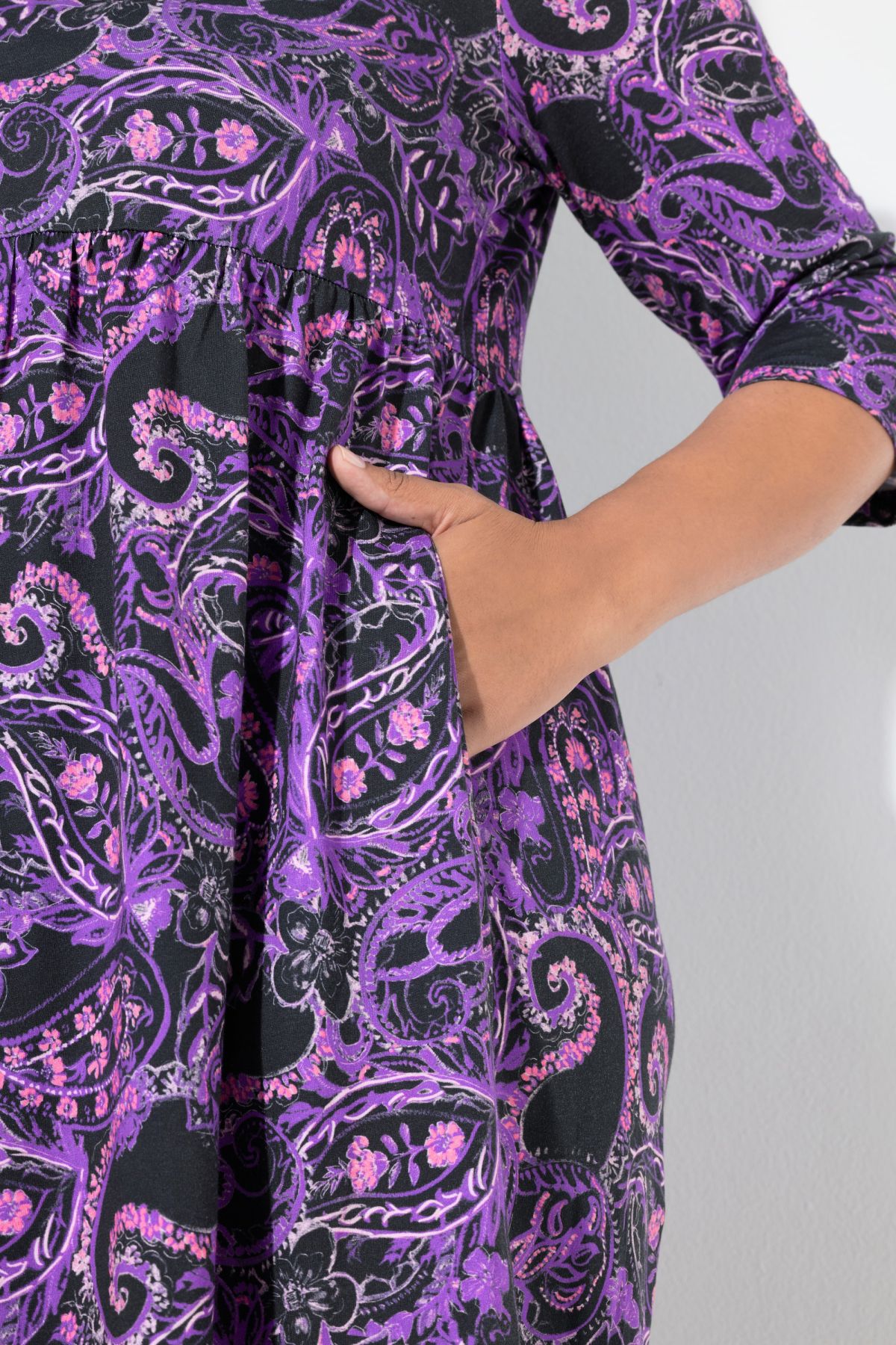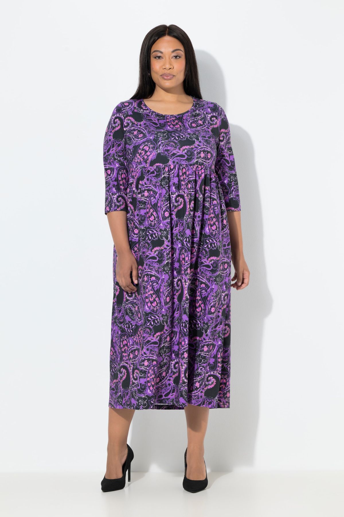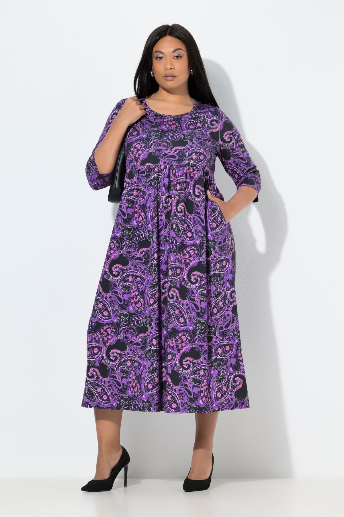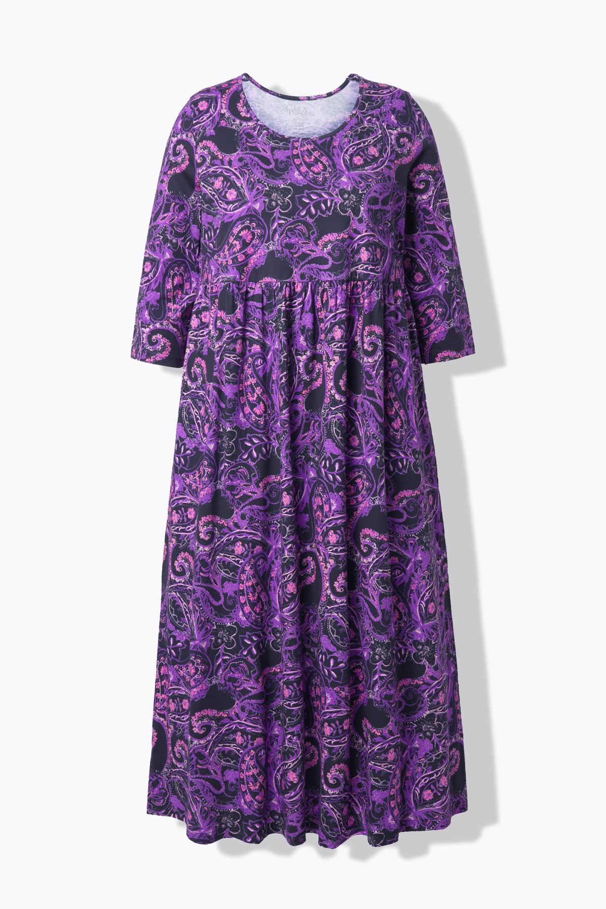 Рокля с неонов пейзли принт. Дизайн с А - линия на силуета, кръгло деколте, 3/4 ръкави, еластична лента под бюста за набиране. От мека, памучна материя.