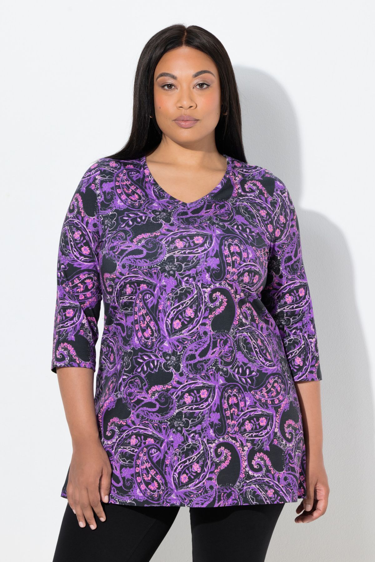 Атрактивен пейсли мотив, V-образно деколте, по-дълъг А-силует с удобна ширина на подгъва, 3/4 ръкави, чист памук, дължина, регулирана по размер, приблизително 81-85 см.