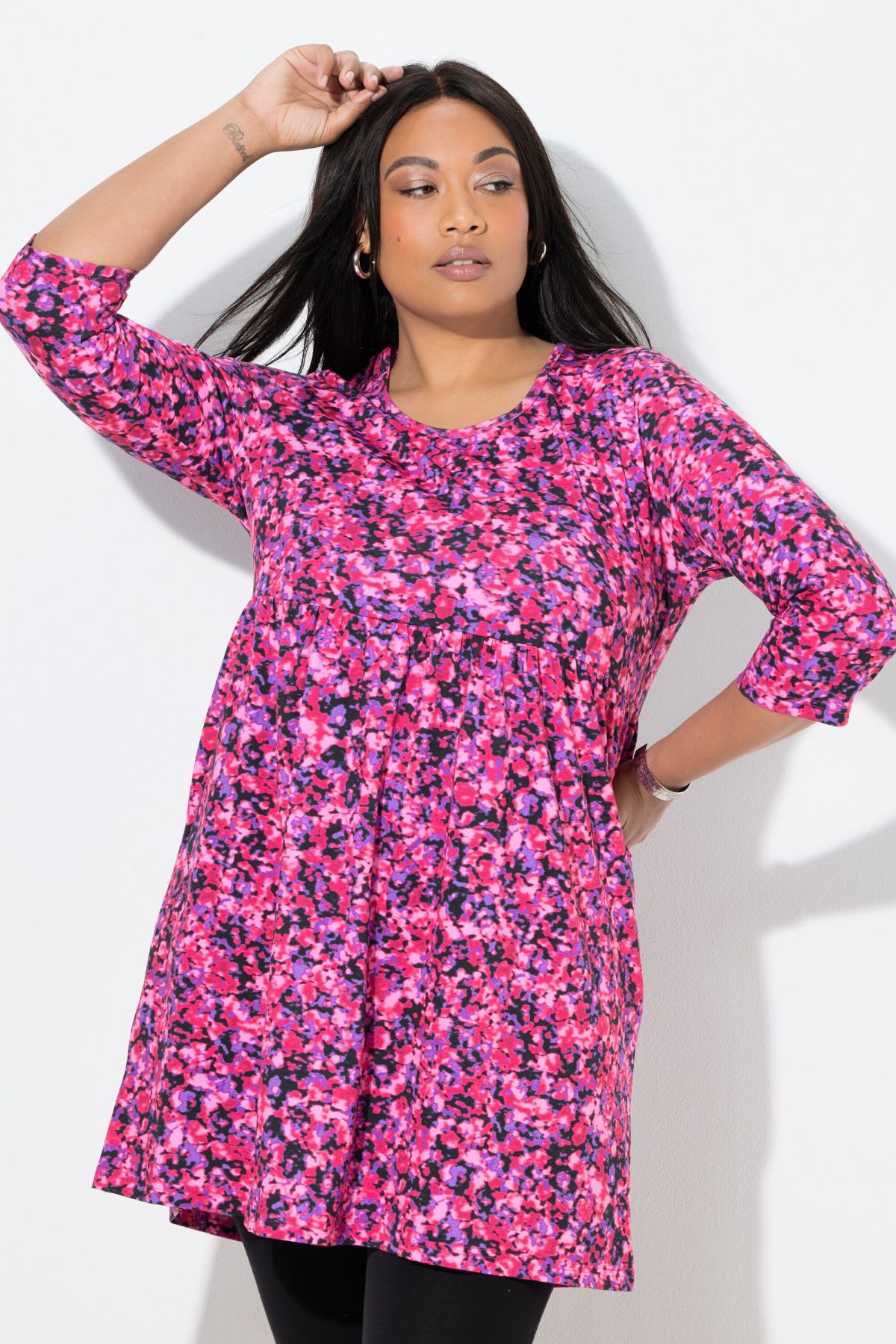 модерен флорален мотив, кръгло деколте, удобен А-силует с ластик и кръстосан шев, 3/4 ръкави, чист памук.