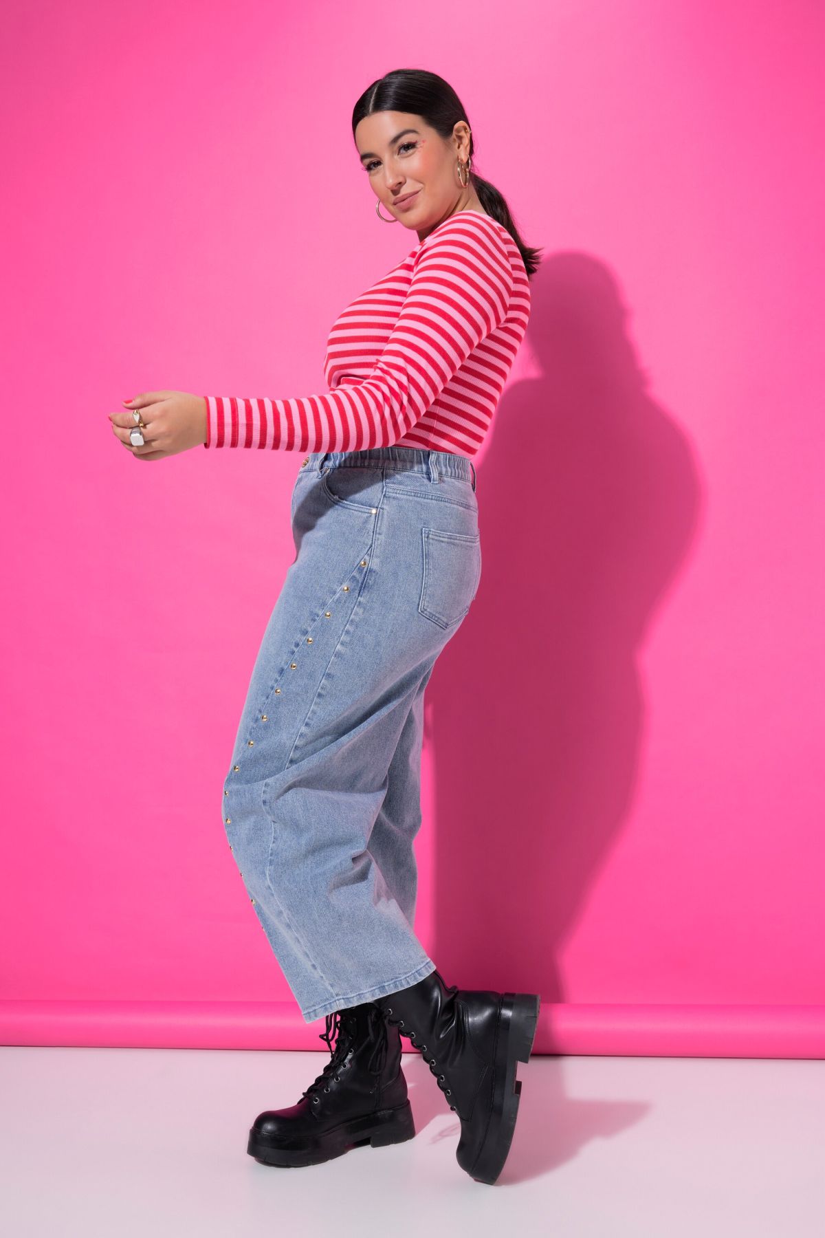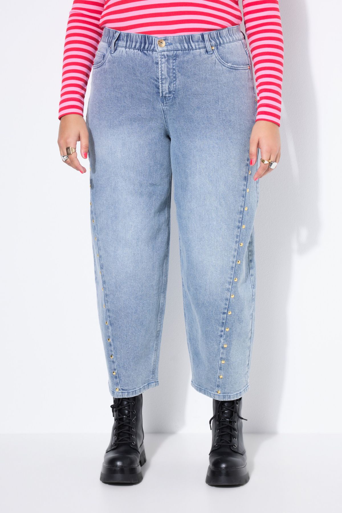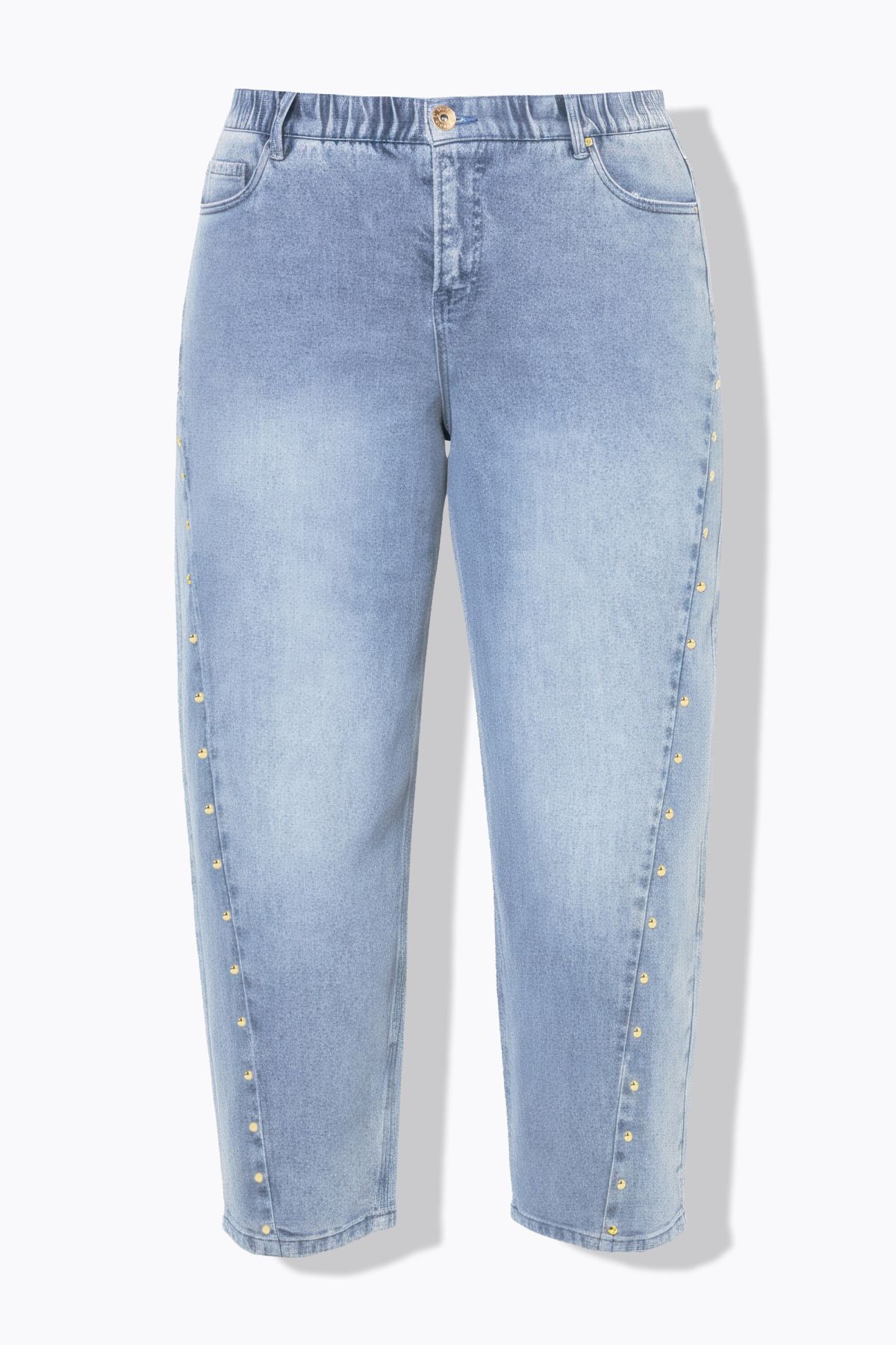 Дънки тип балон с декоративни капси. С висока фиксирана талия с гайки за колан, копче и цип отпред. Дизайн с 5 джоба и по - къса дължина