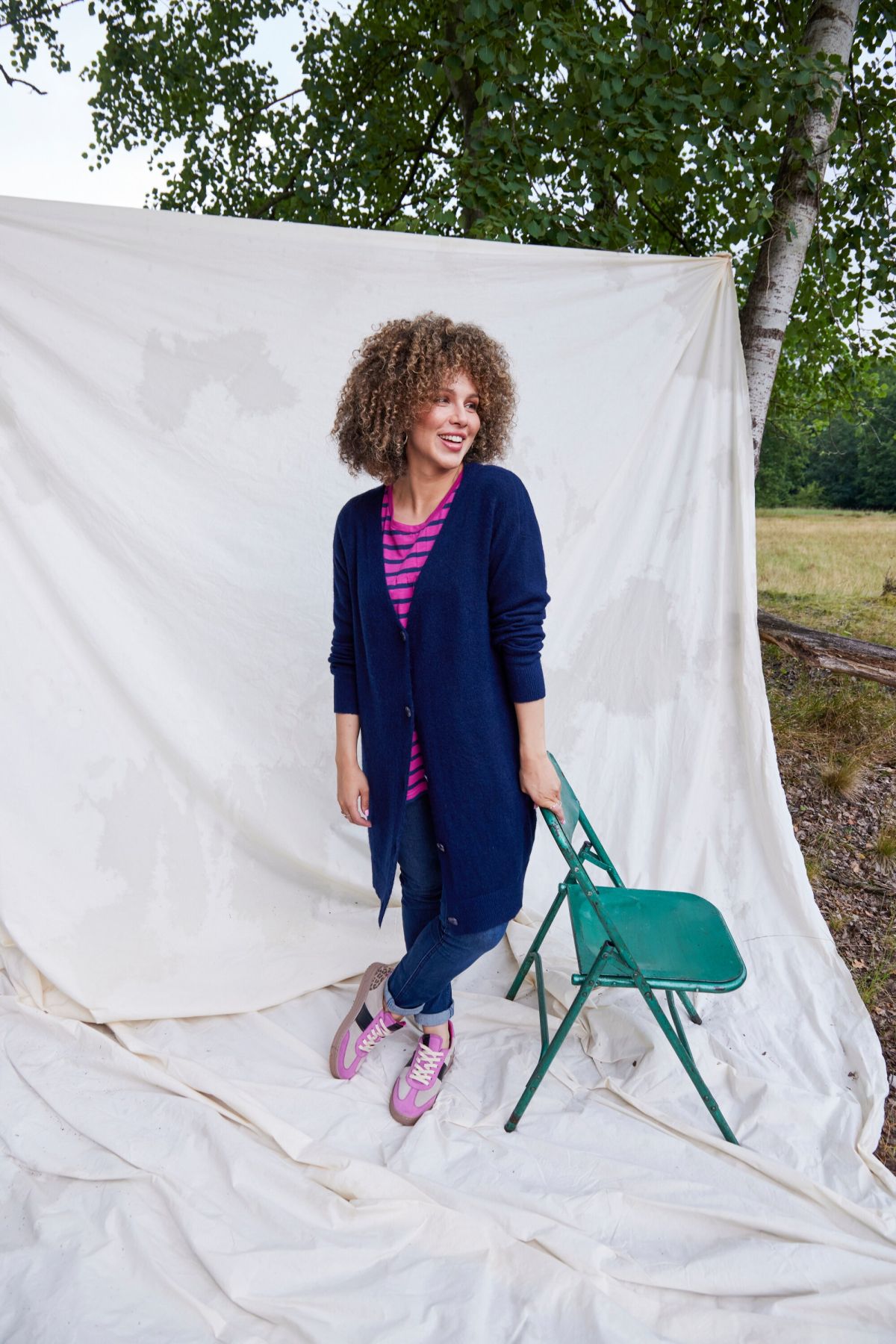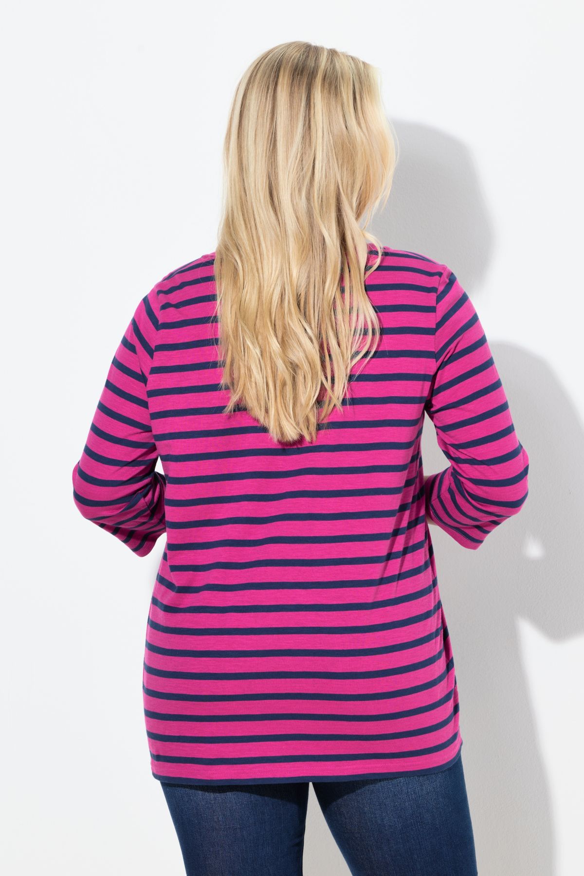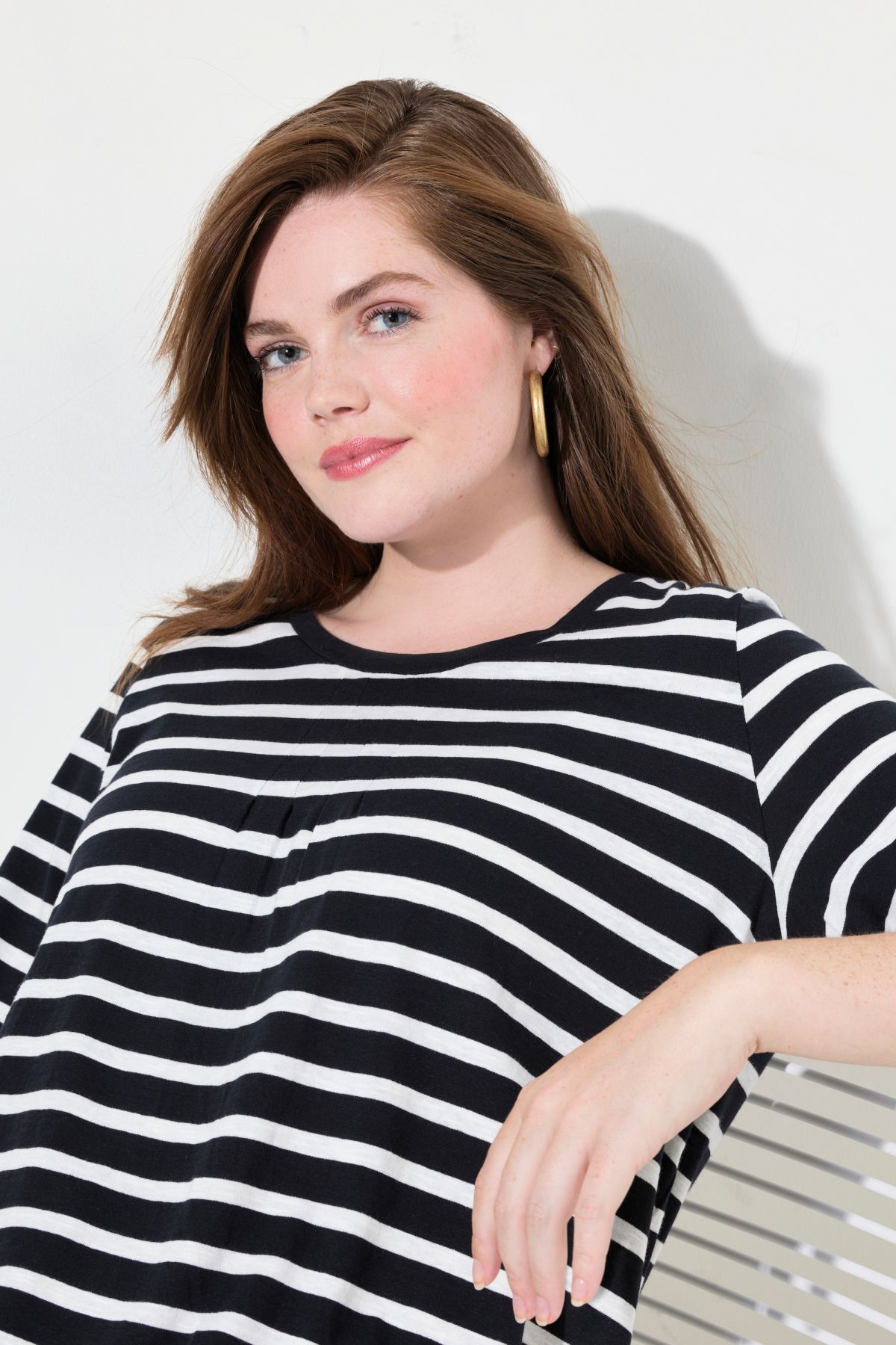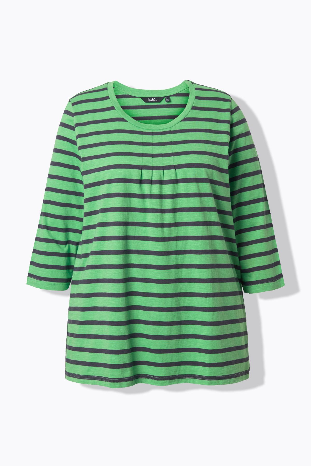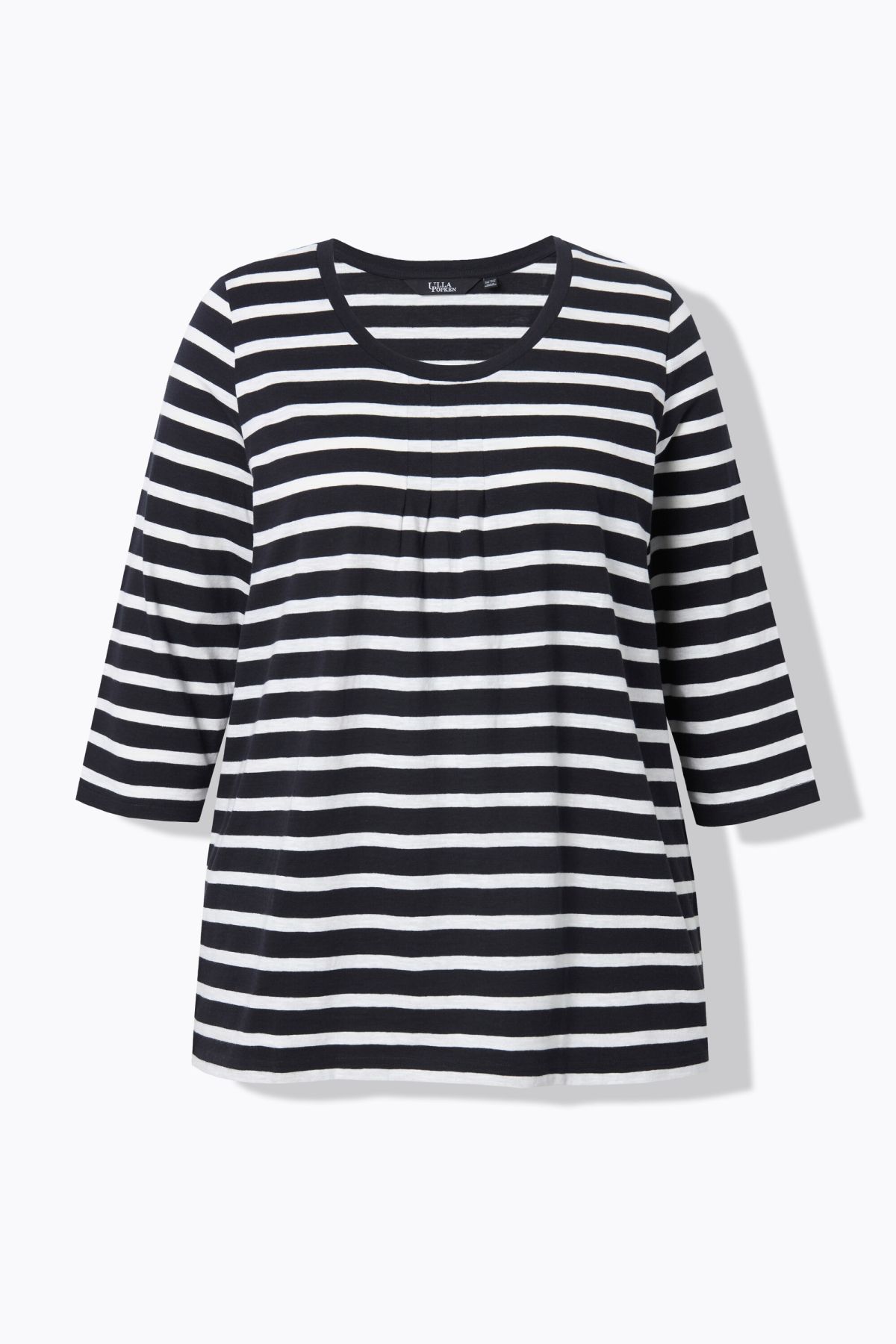 Тениска с райета с плисирано деколте с модерен разкроен силует. С кръгло деколте и 3/4 ръкави. Модерна А - линия.