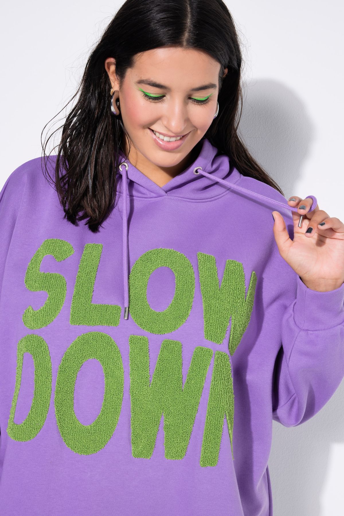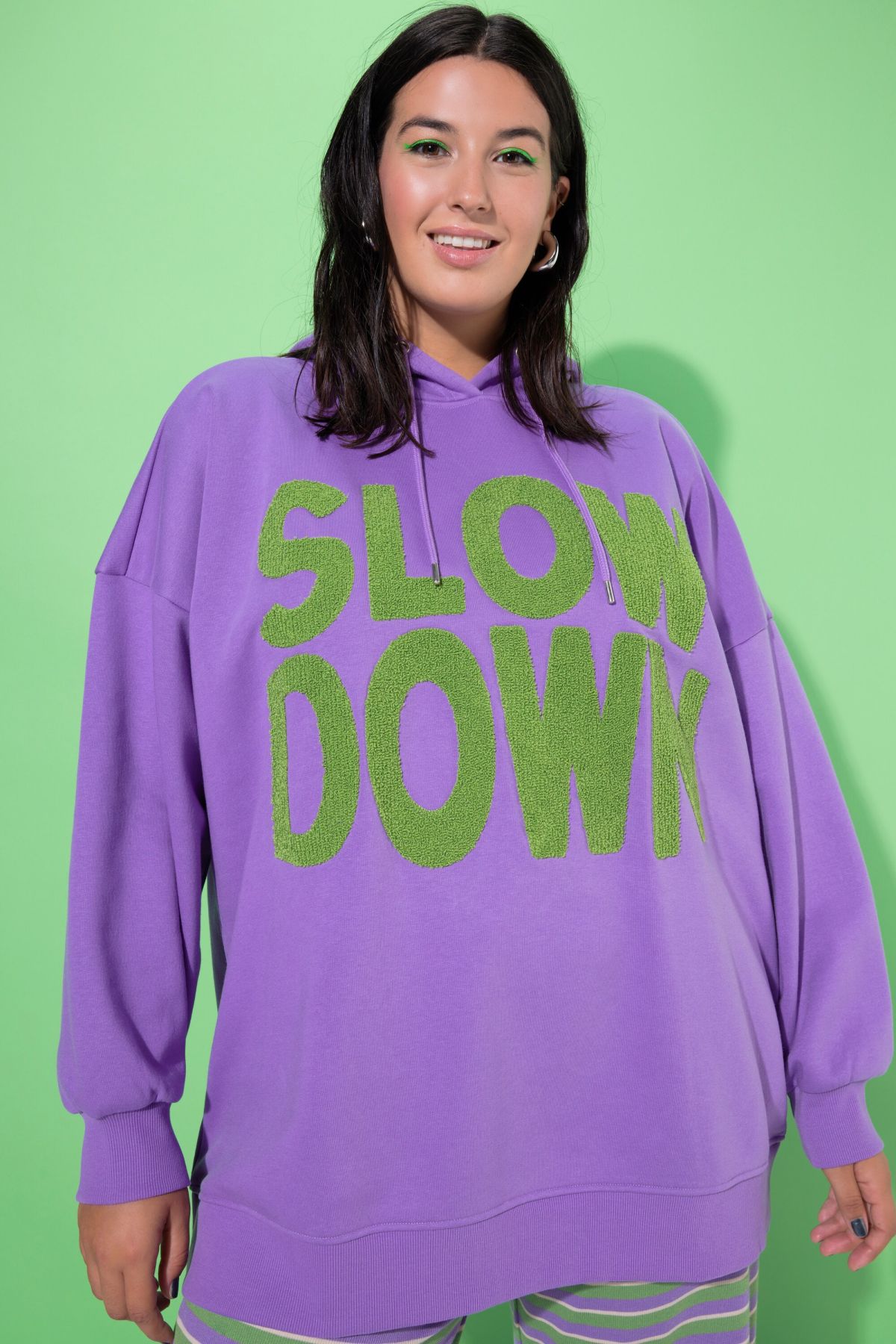 Суитчър с голям надпис отпред от различна пухкава материя. С разкроен силует. С качулка с връзка и дълги ръкави. С рипсени маншети ръкавите и подгъва.