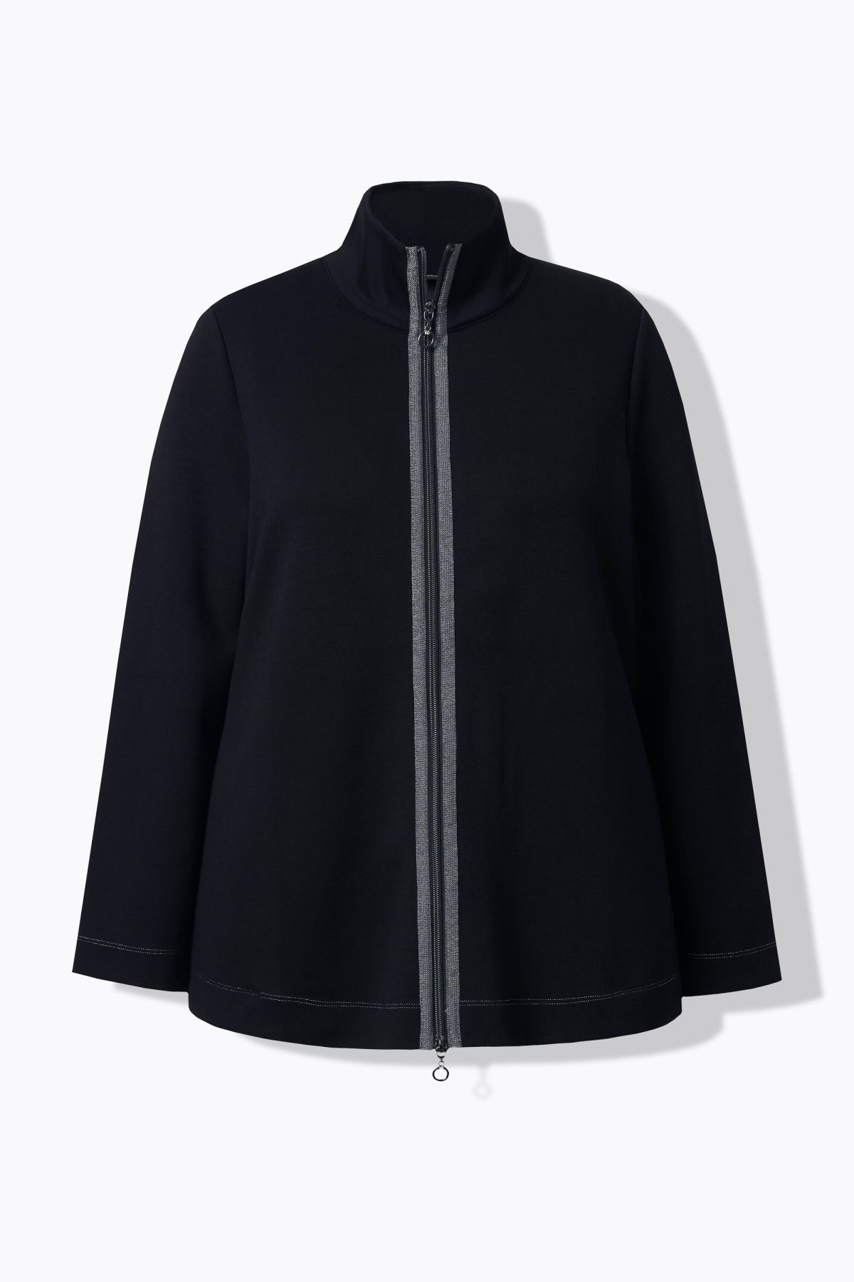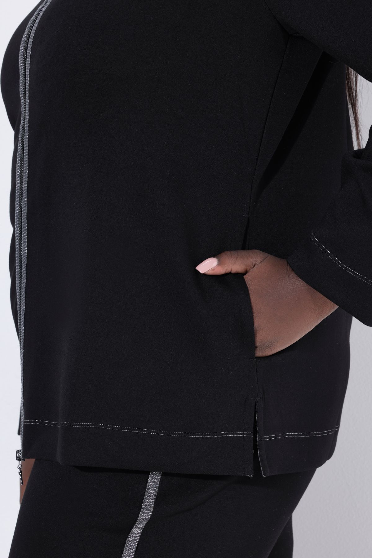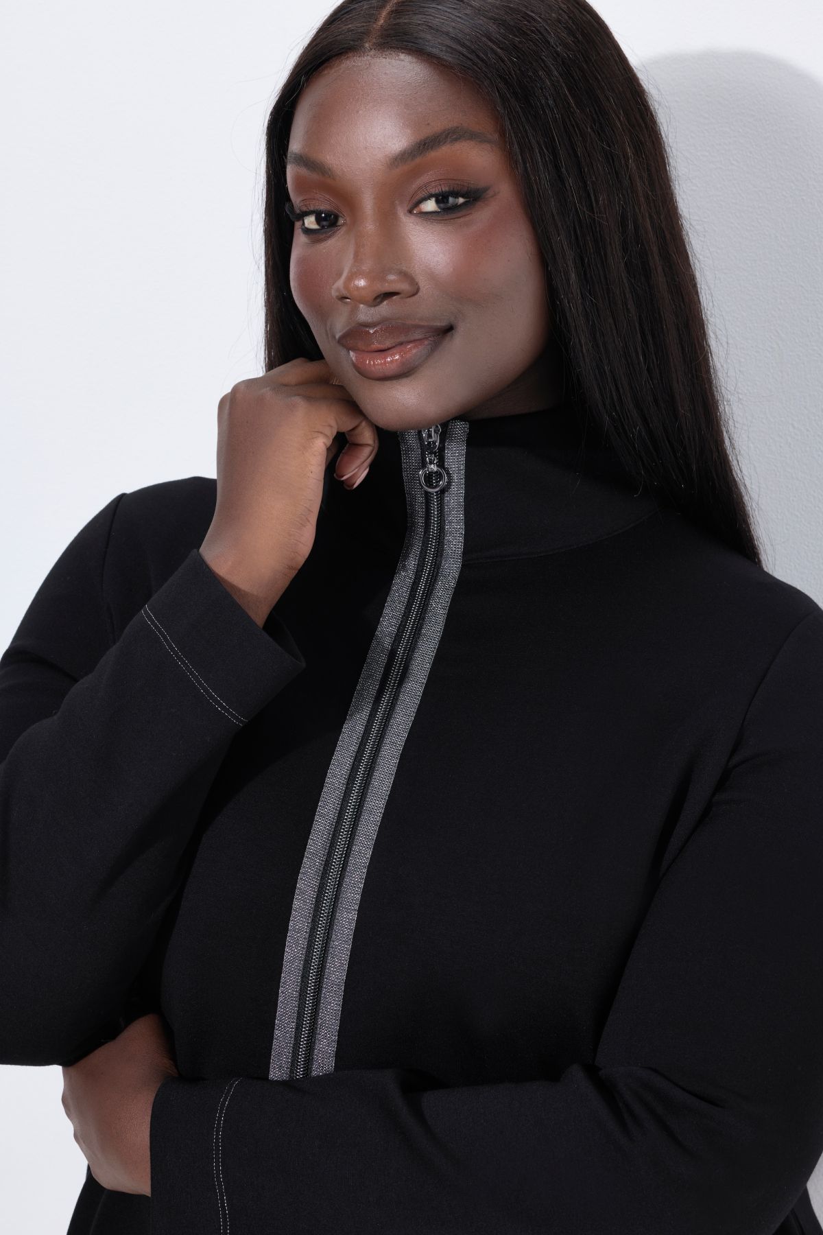 Суитчър с класическа кройка и права яка. Двупосочен цип с брокатени кантове. Дълги ръкави, странични джобове и странични цепки. От мека еластична материя.