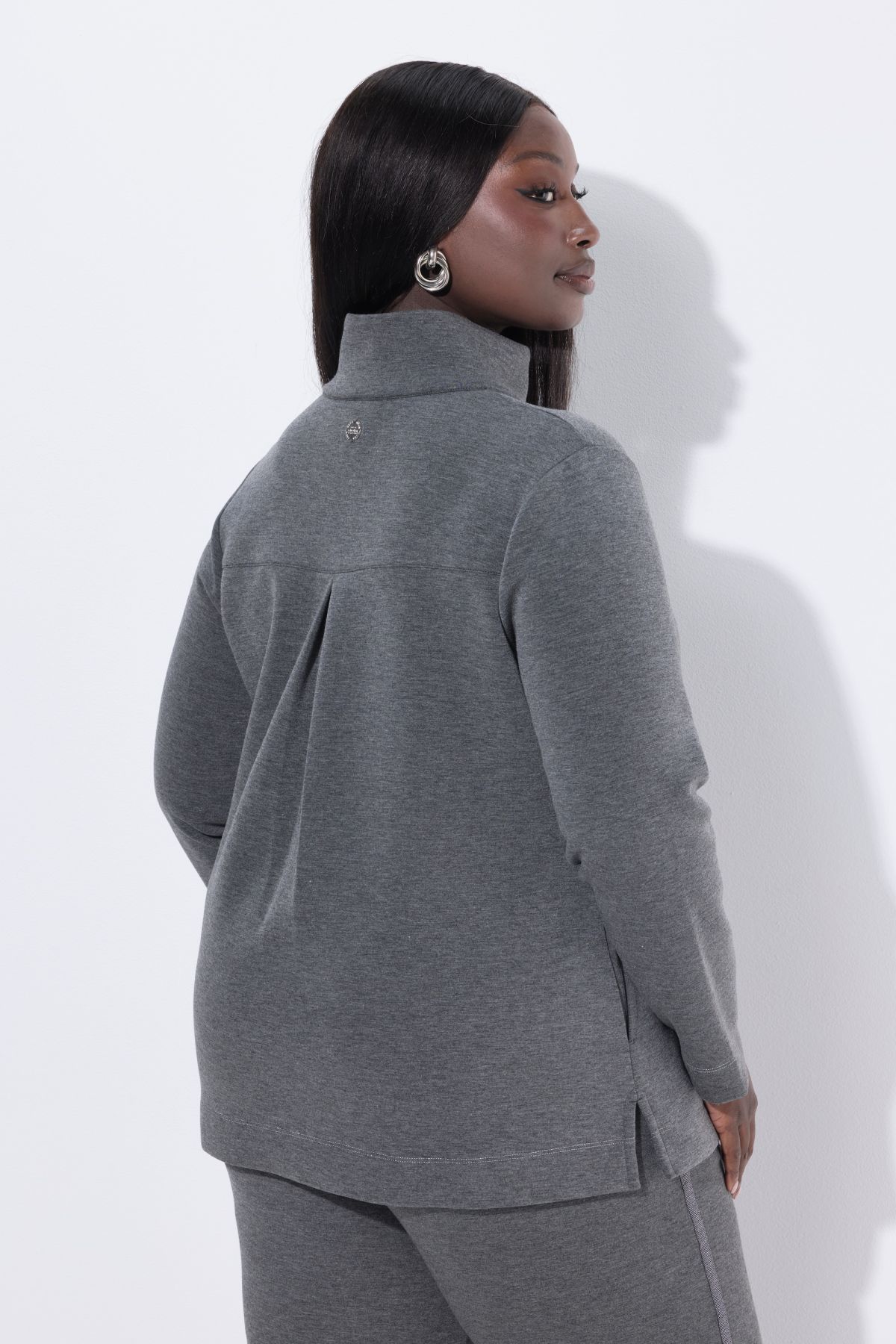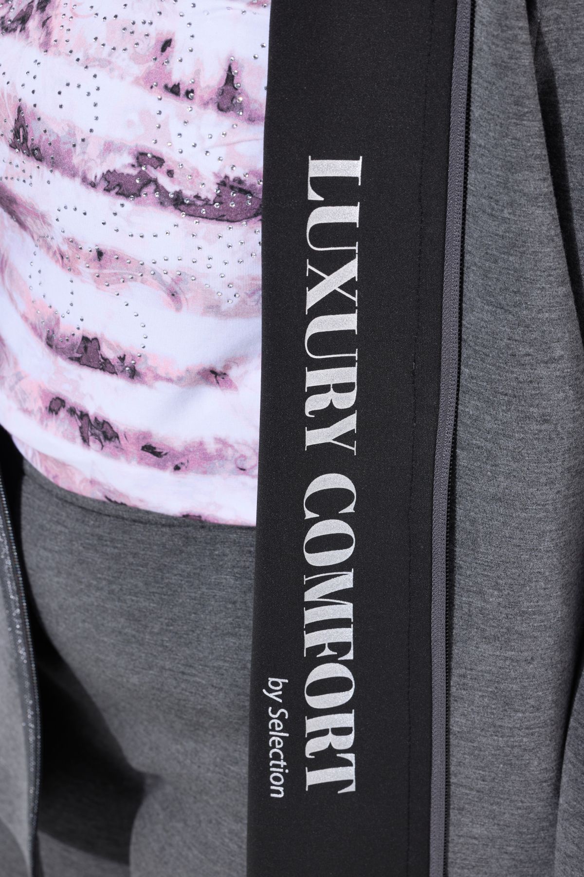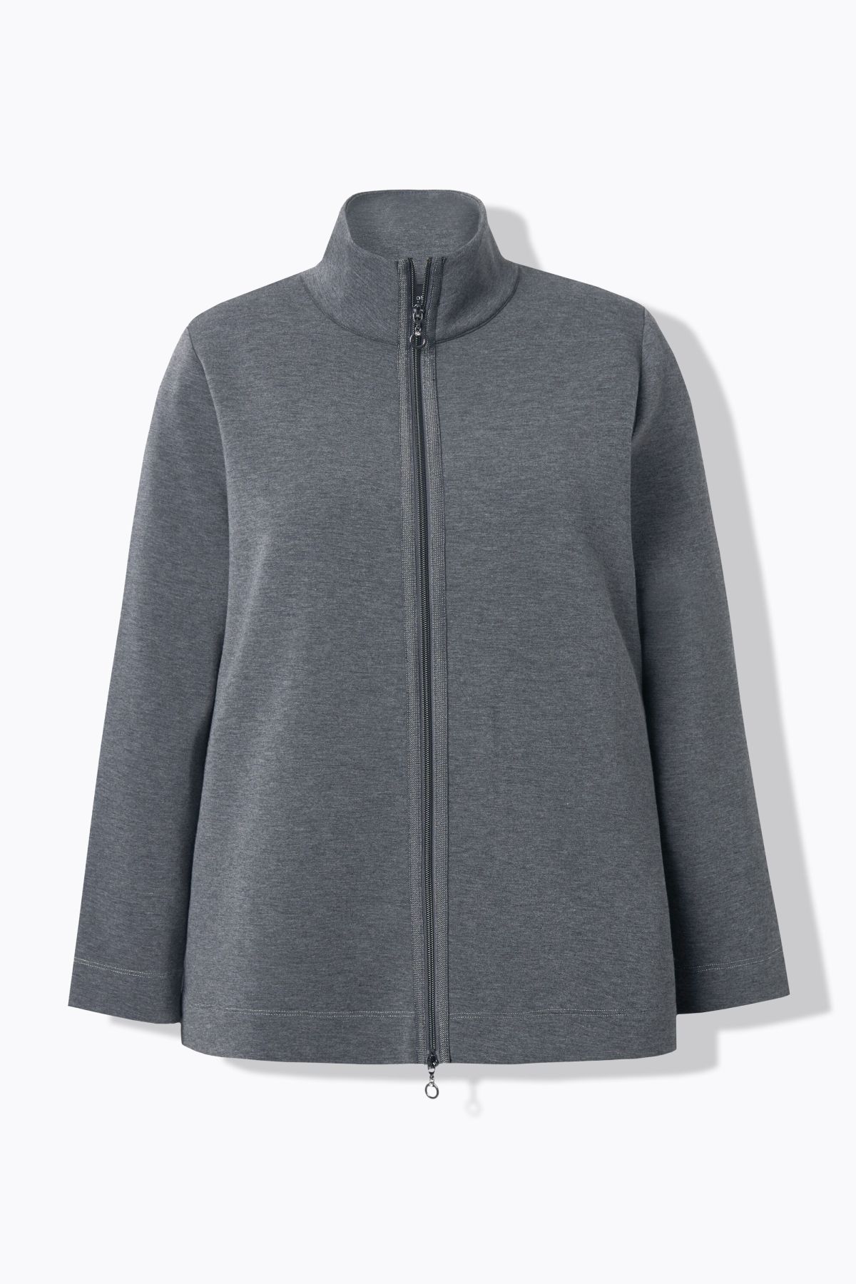 Суитчър с класическа кройка и права яка. Двупосочен цип с брокатени кантове. Дълги ръкави, странични джобове и странични цепки. От мека еластична материя.