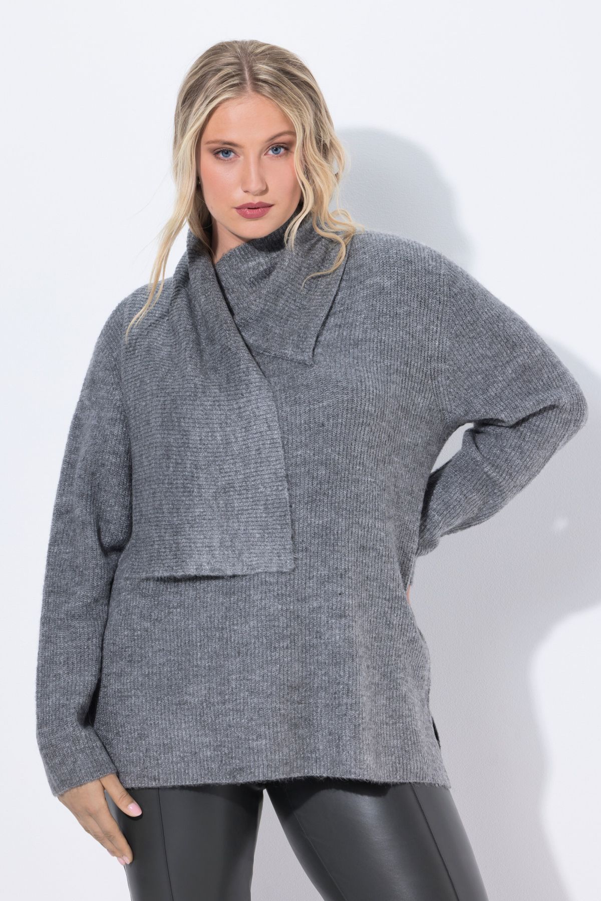 Пуловер с акцент от добавен шал. С дълги ръкави и стилна визия. От мека, фина плетка.