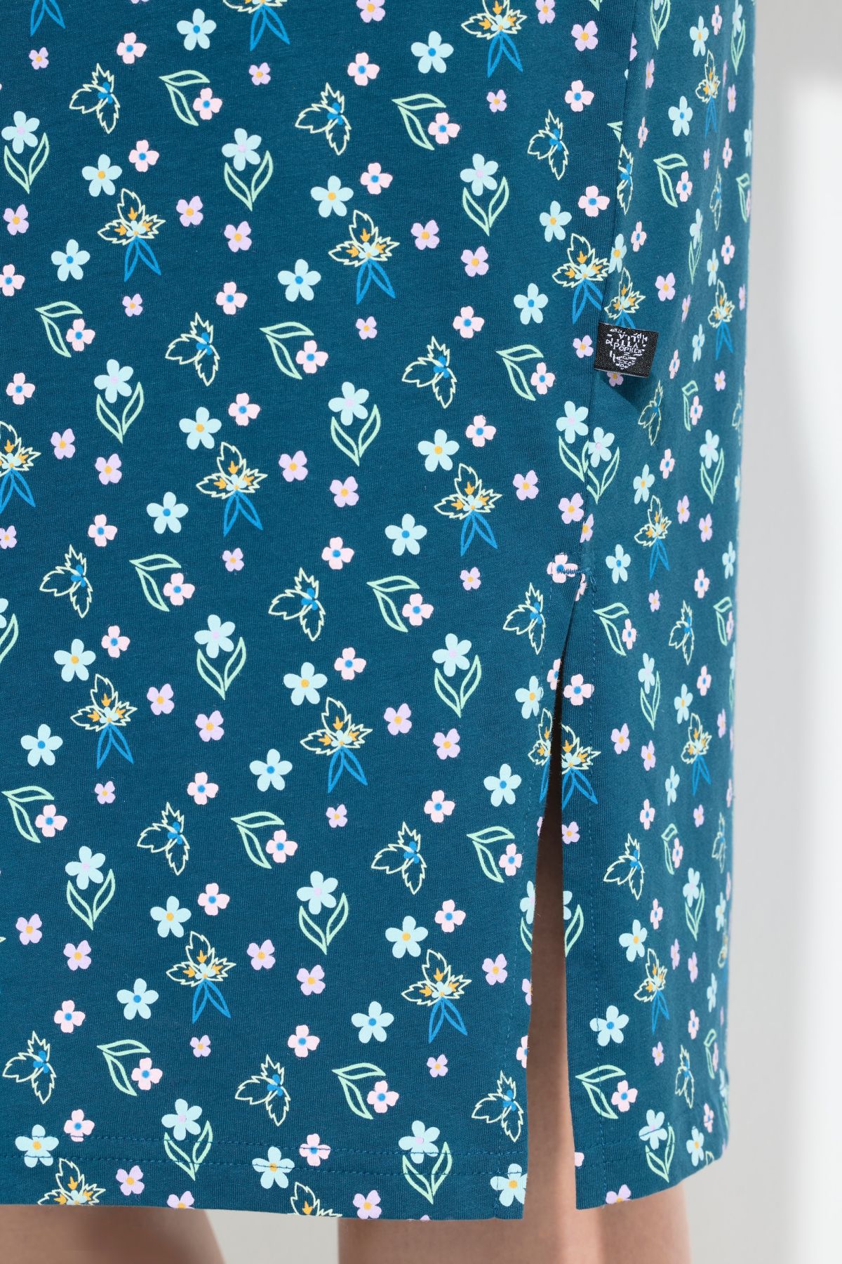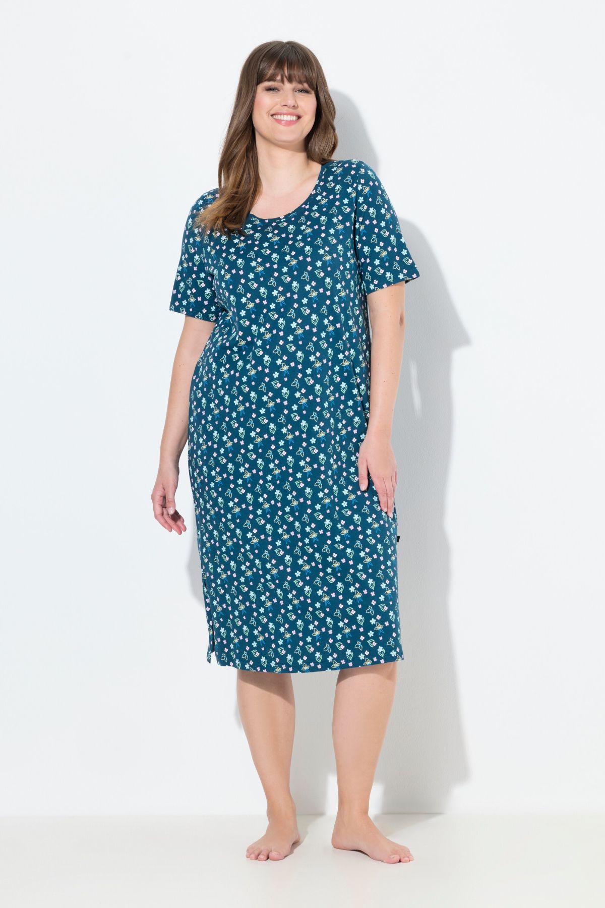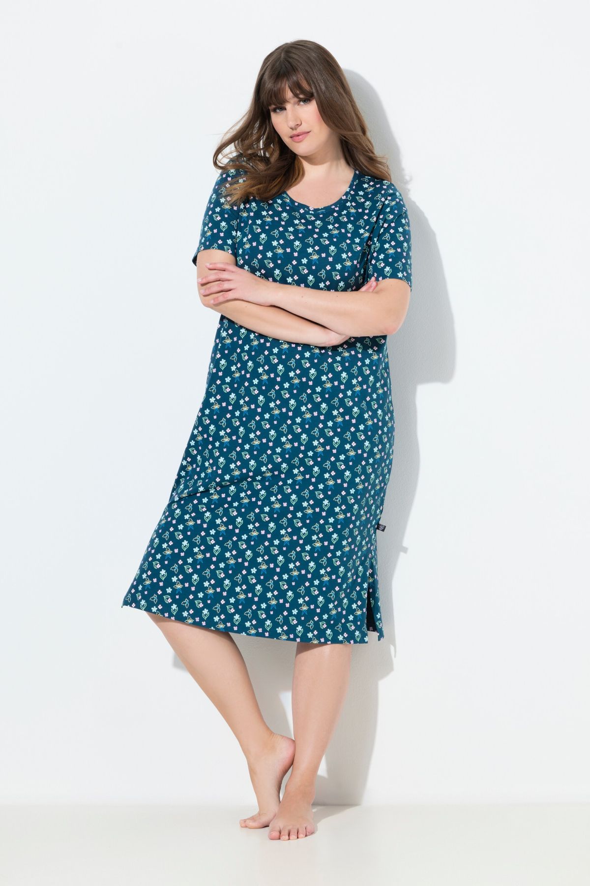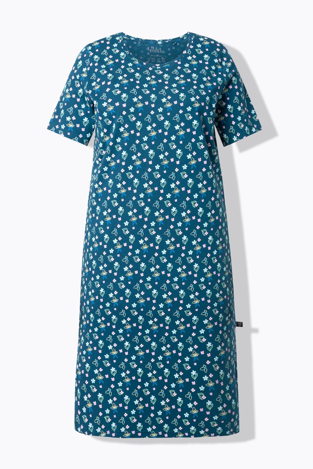Нощница с принт на маргаритки от мек, дишащ памук в пастелни цветове. С кръгло деколте, къси ръкави и странични цепки на подгъвите.