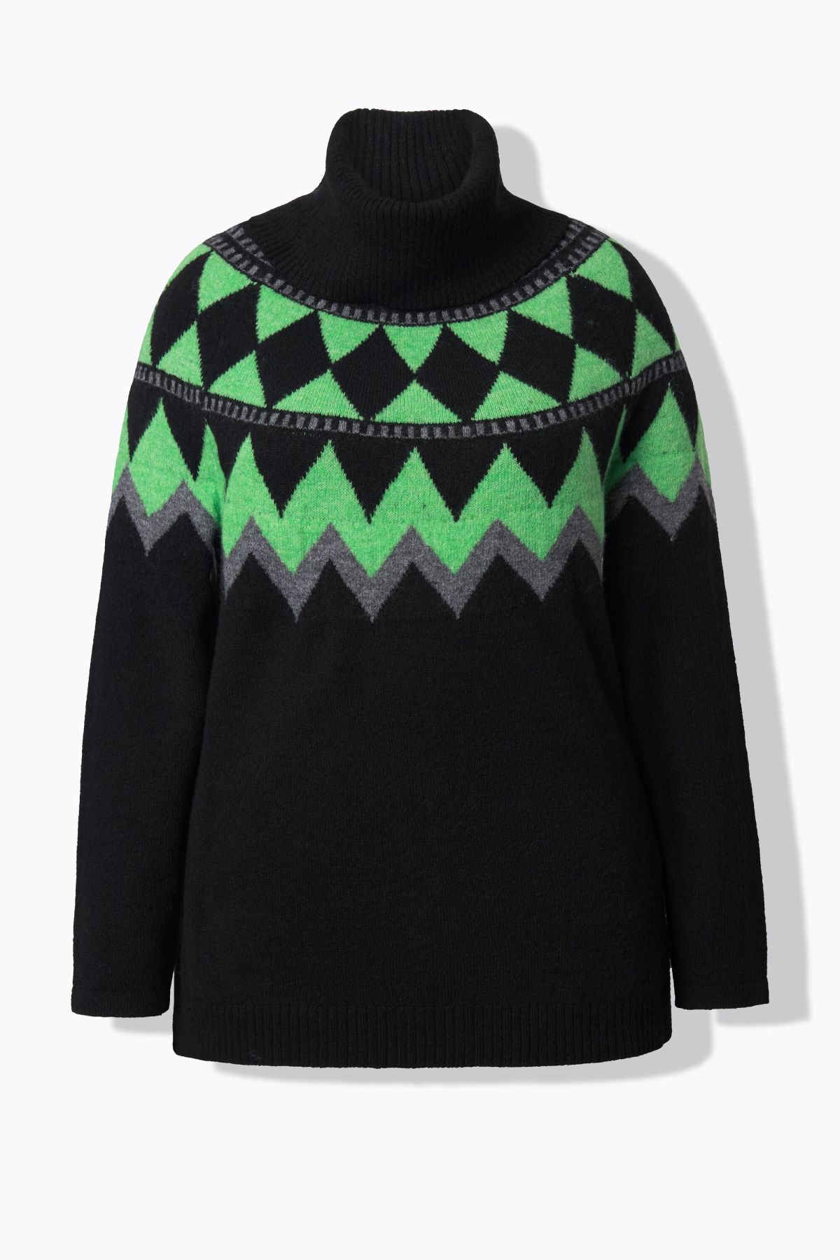 Пуловер с неонов алпийско принт. С висока изправена яка тип поло, дълги ръкави с рипсени маншети и рипсен подгъв. Перфектният избор за хладните дни