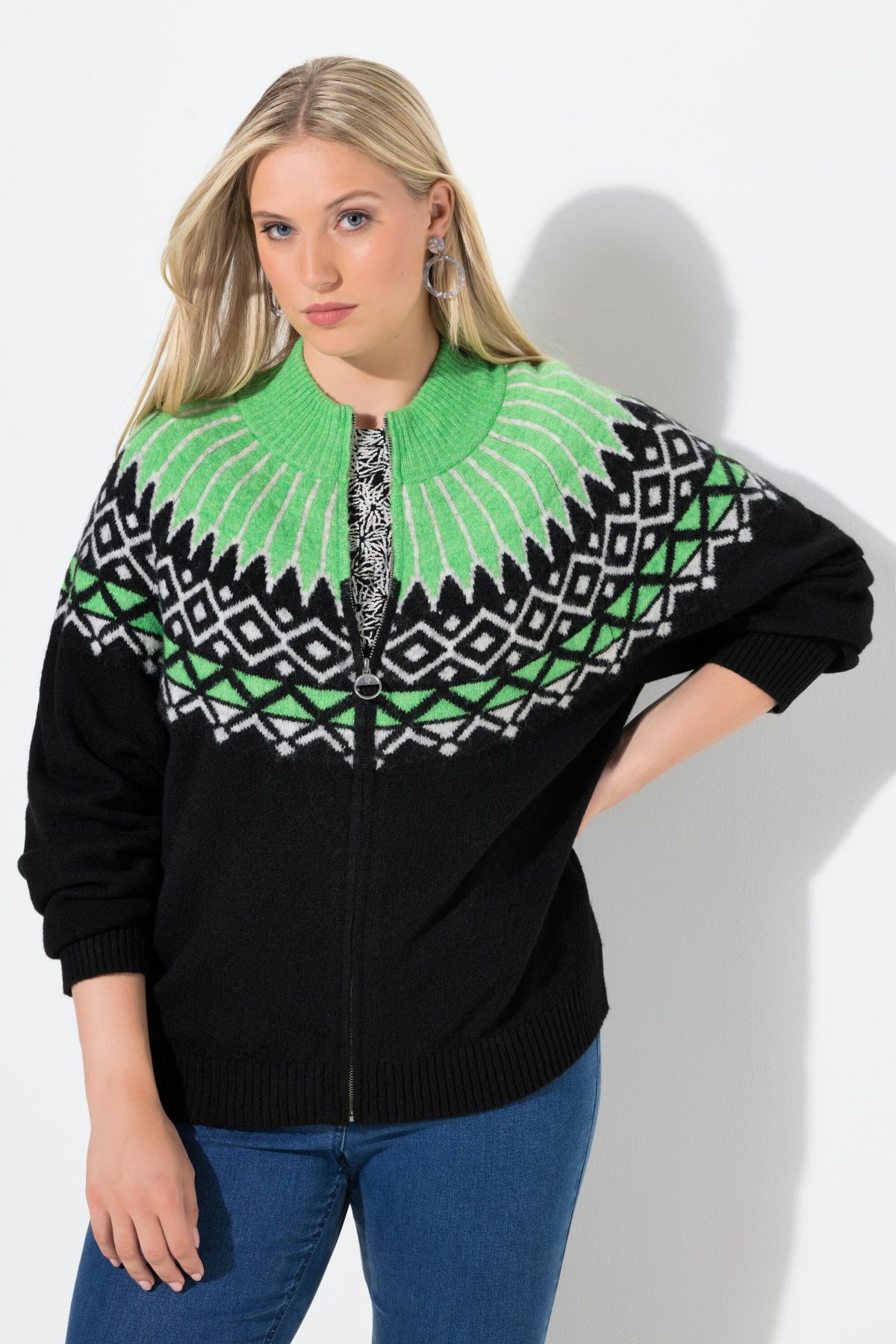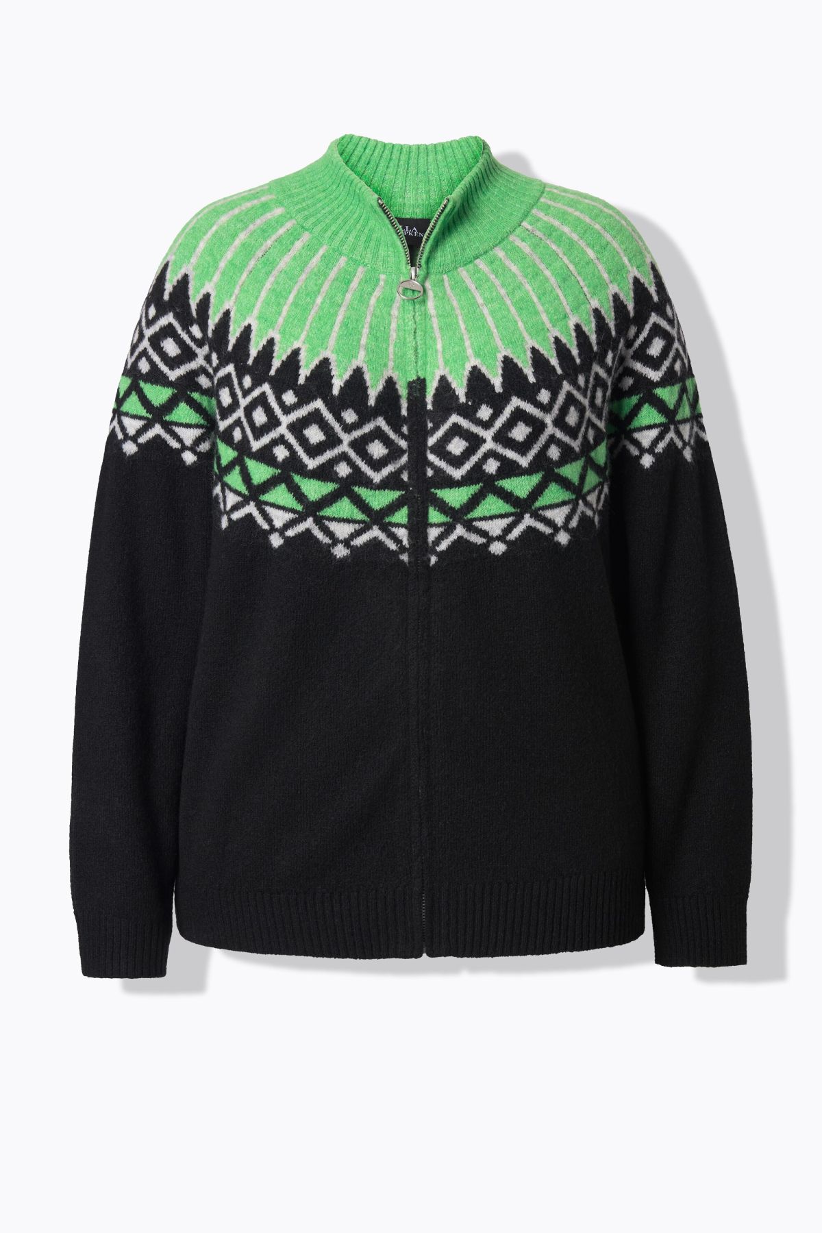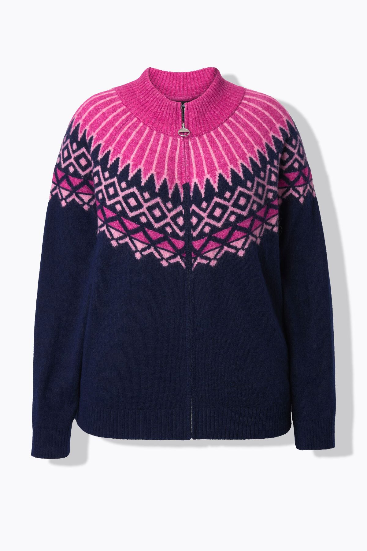 Плетена жилетка с принт на алпийски райета. Класическа визия с модерно усещане. С цип отпред, висока яка и дълги ръкави. Перфектна за ежедневието.