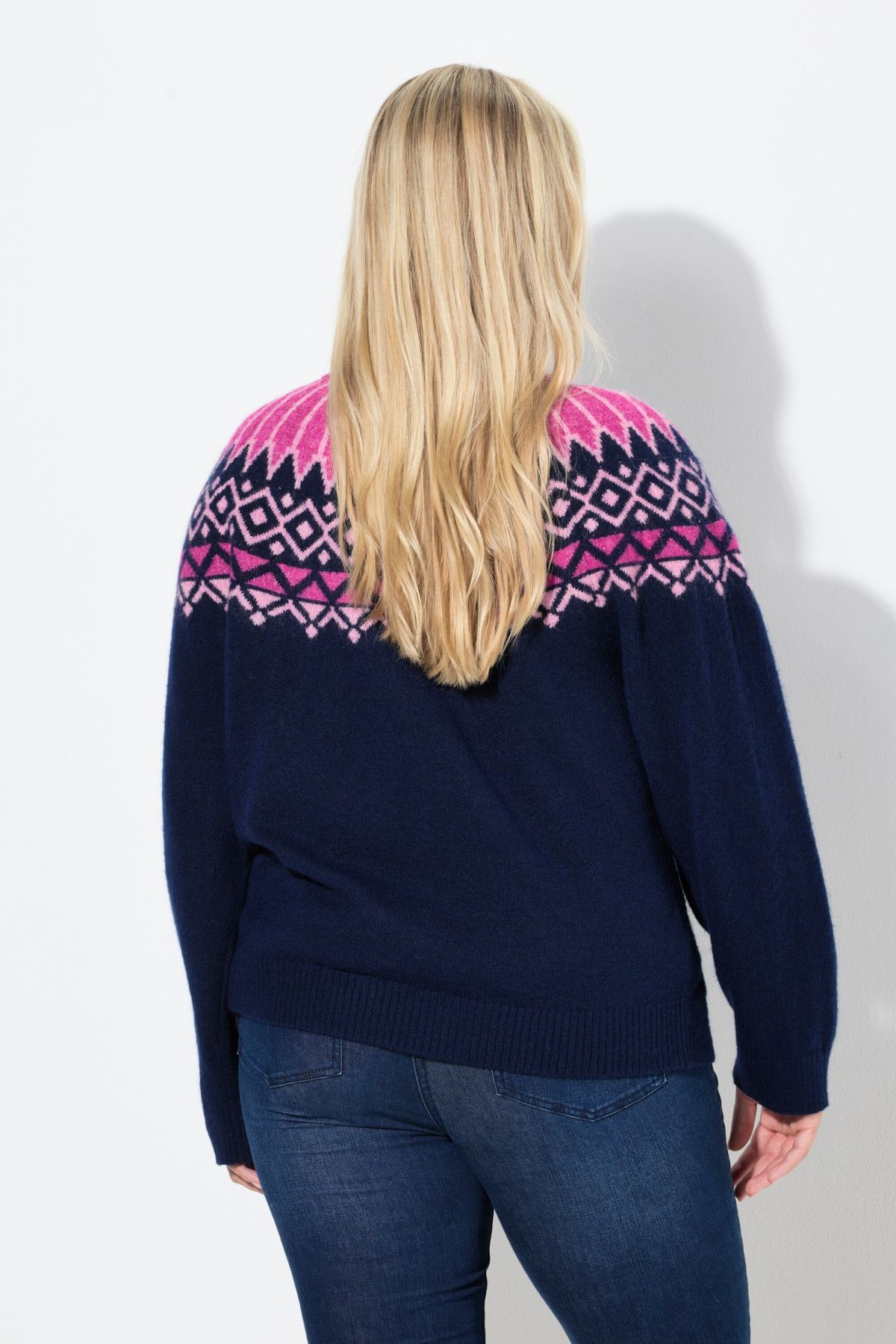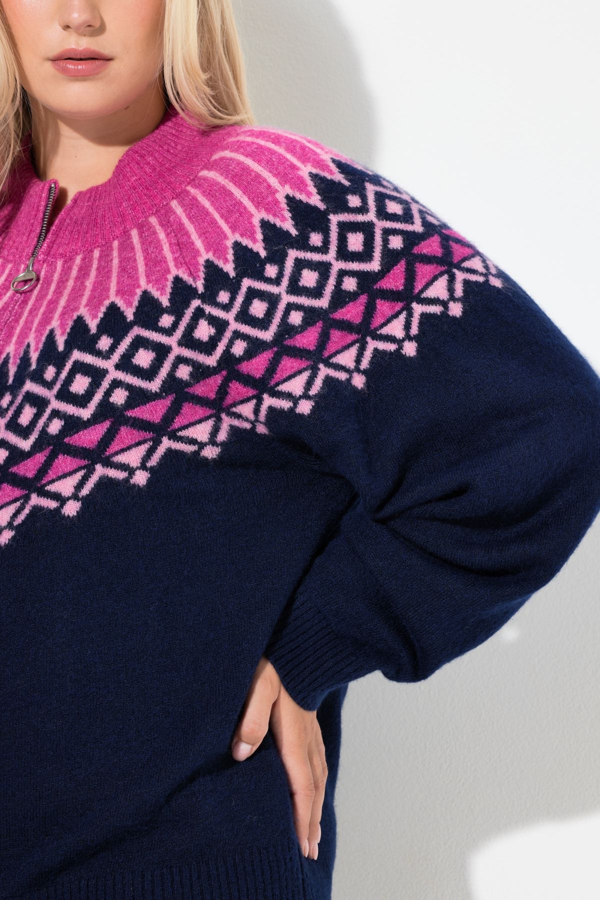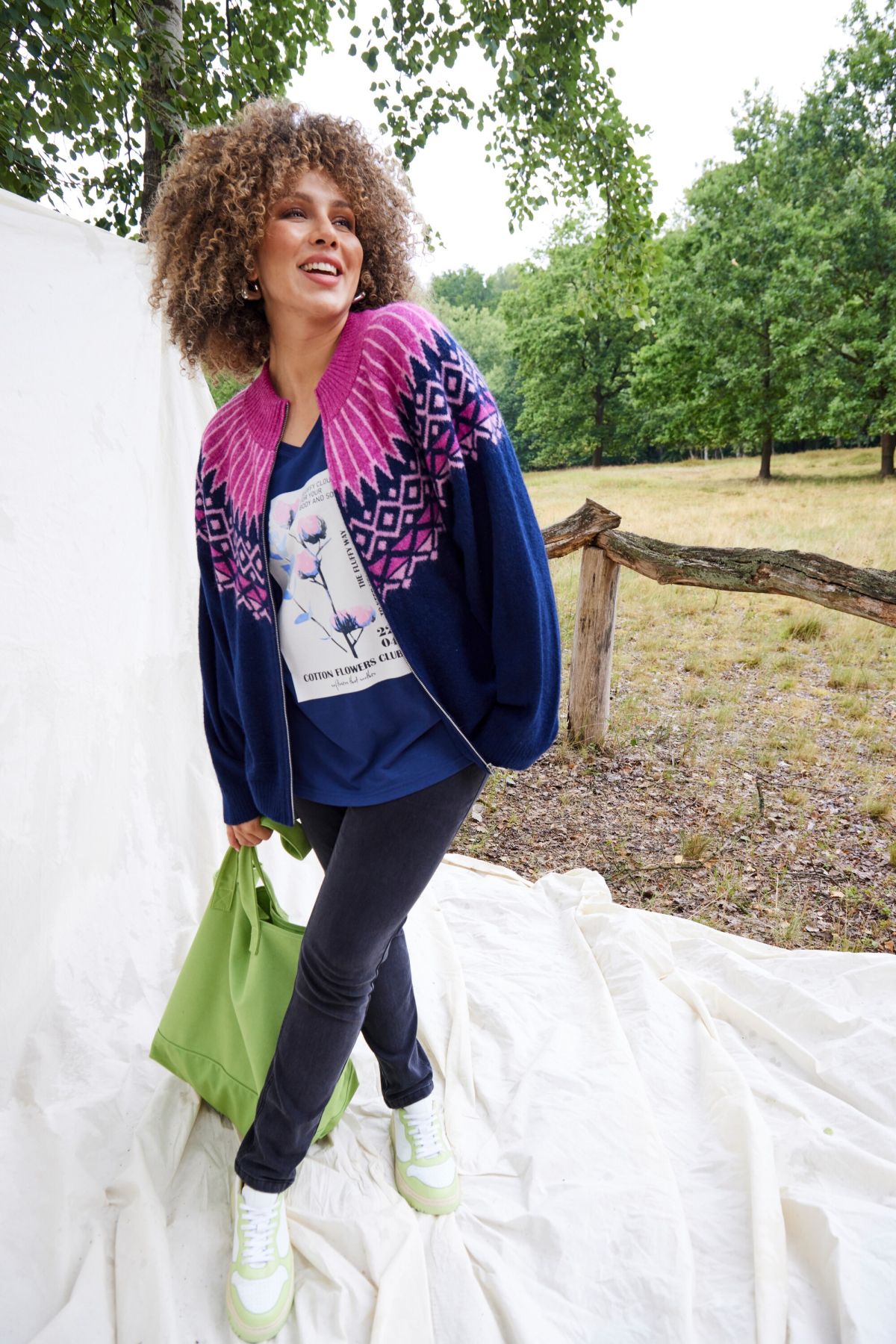 Плетена жилетка с принт на алпийски райета. Класическа визия с модерно усещане. С цип отпред, висока яка и дълги ръкави. Перфектна за ежедневието.