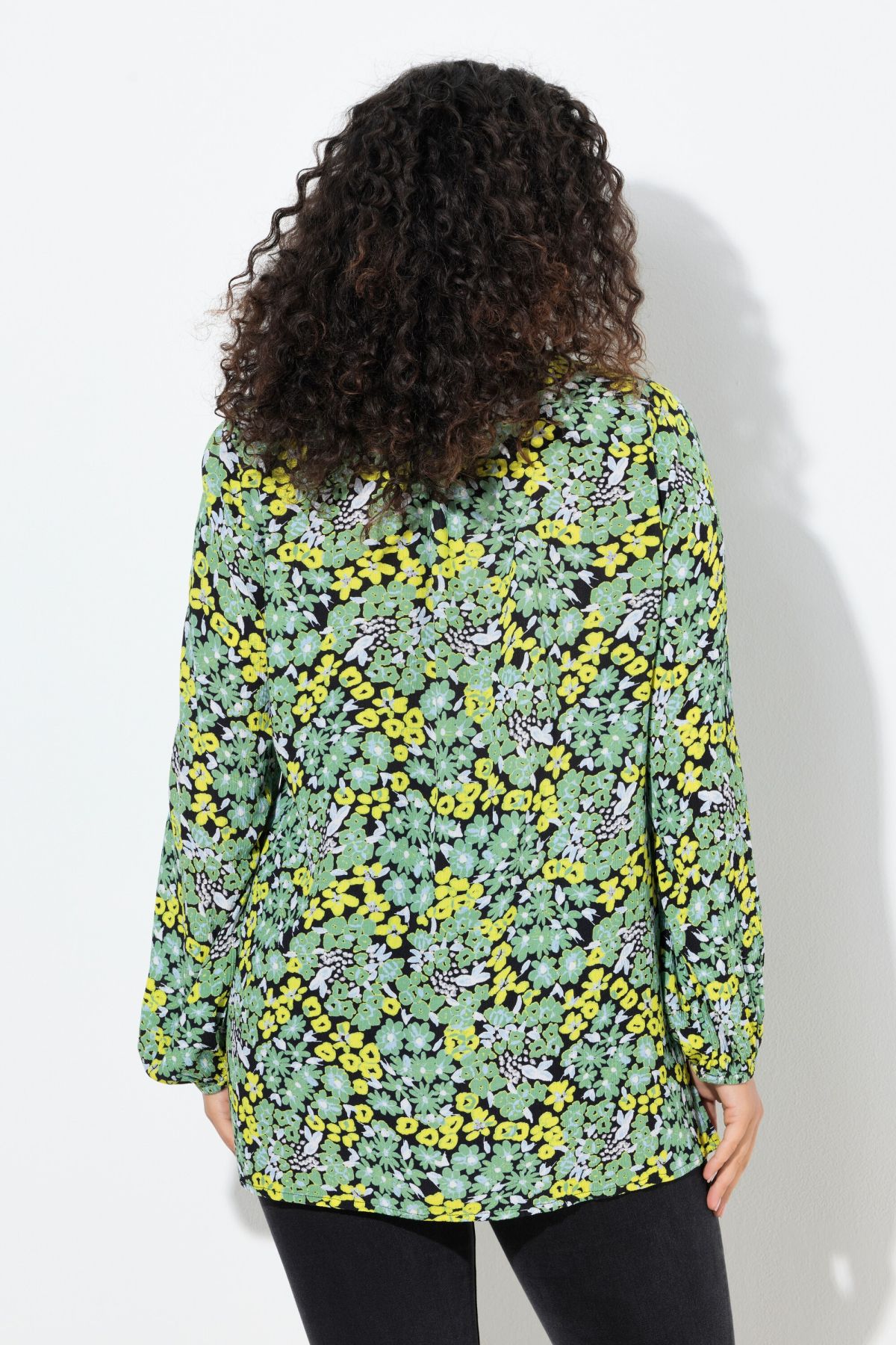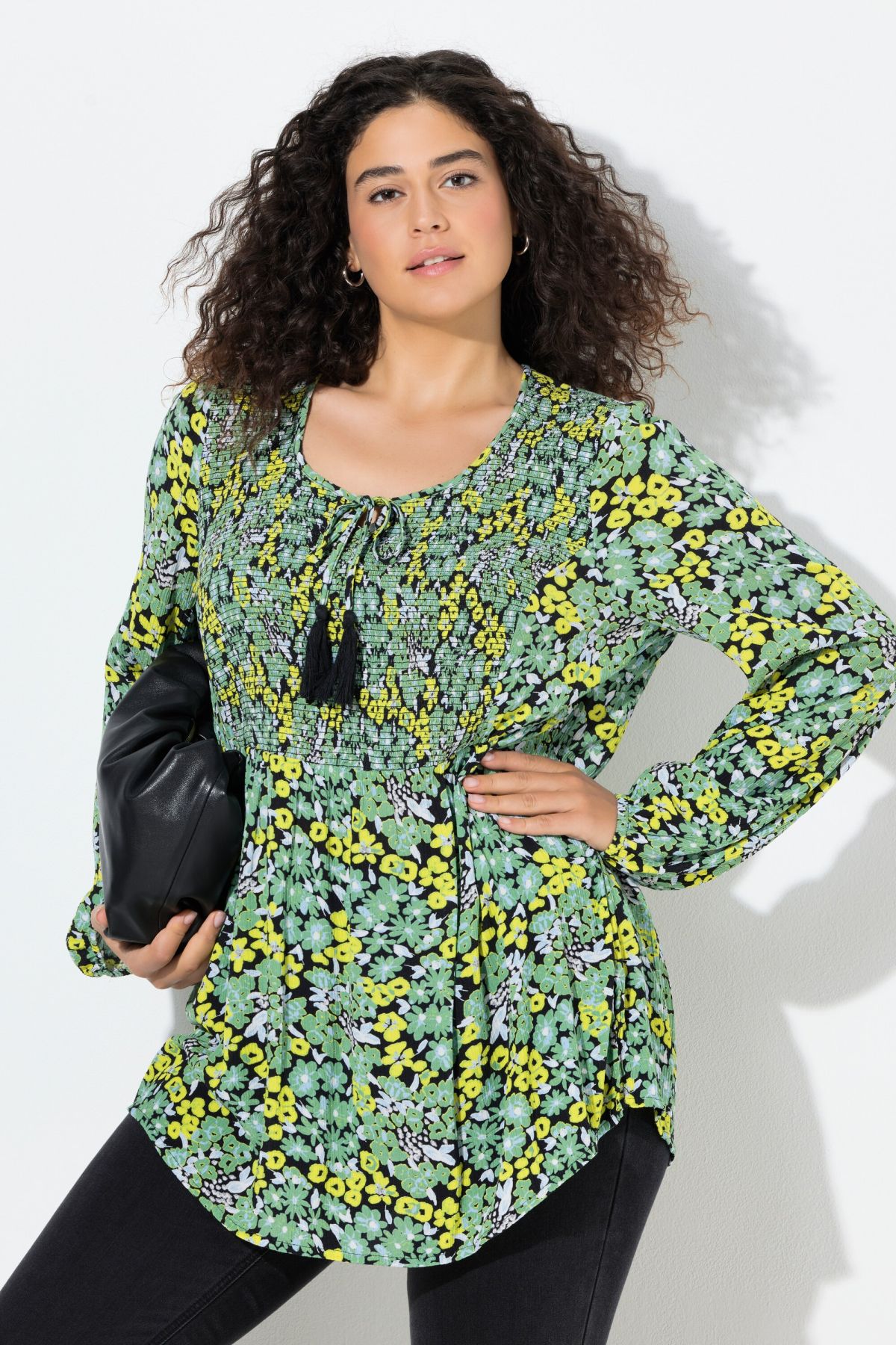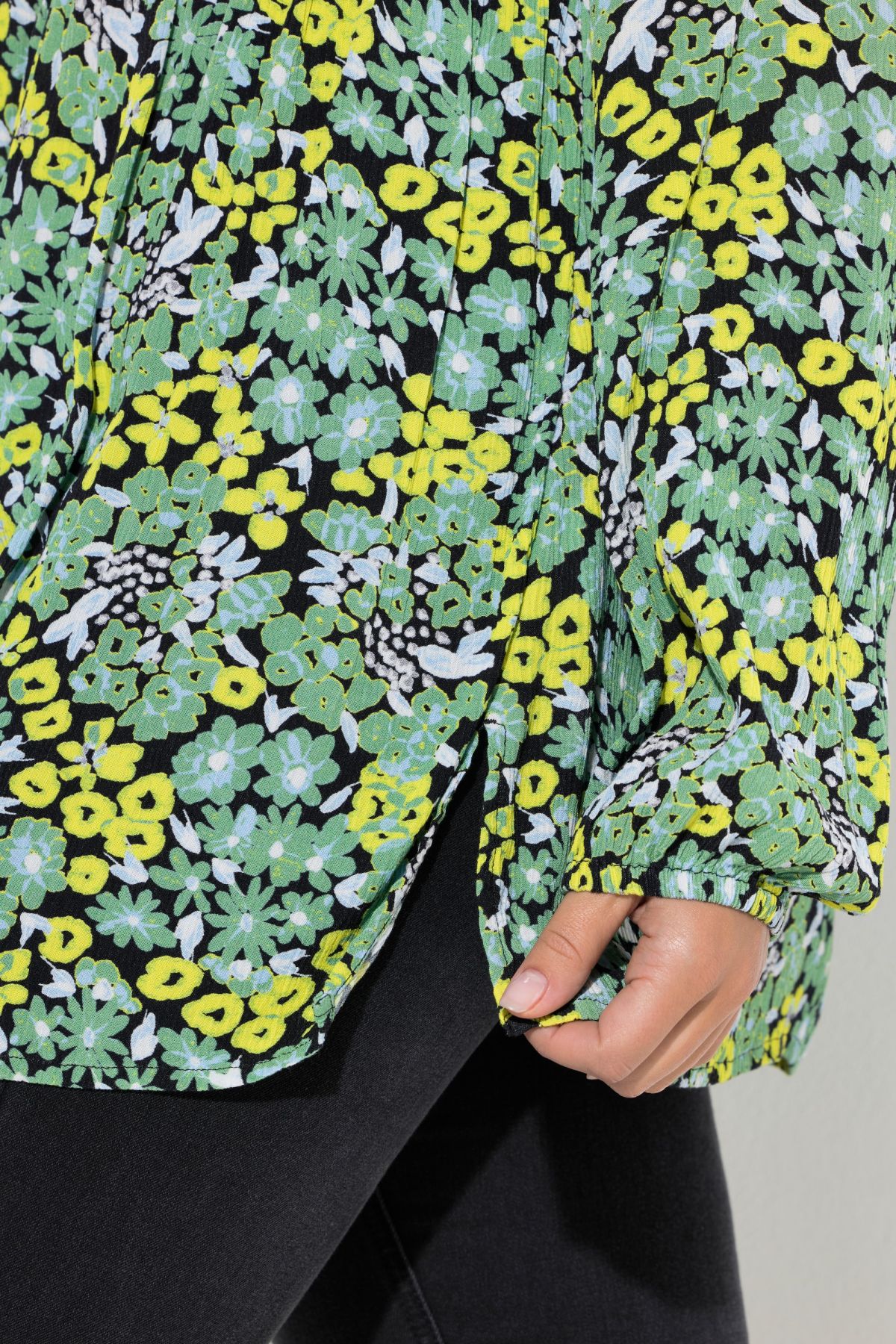 Блуза с принт на маргаритки с набран акцент на гърдите отпред. С кръгло деколте с връзка и дълги ръкави с еластичен маншет. От мека, вискозна материя.