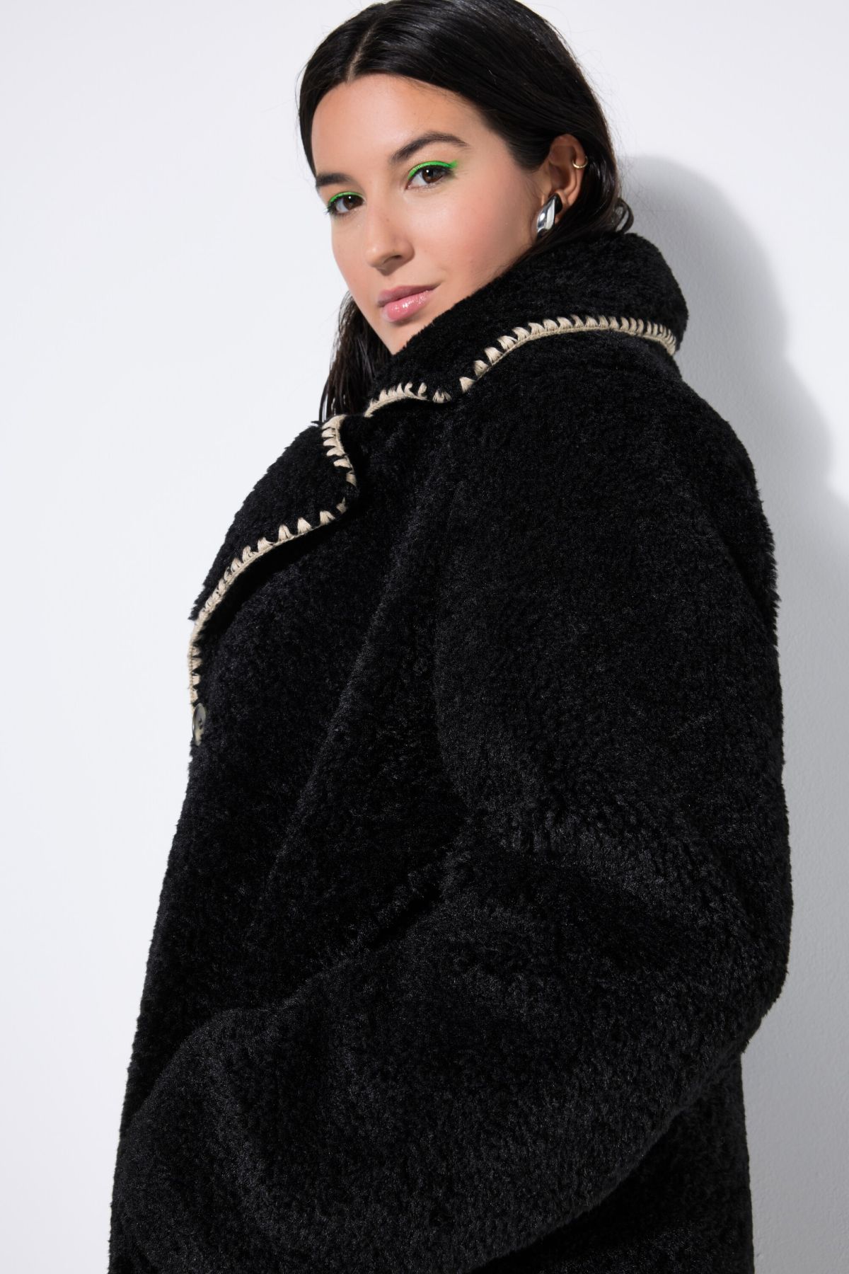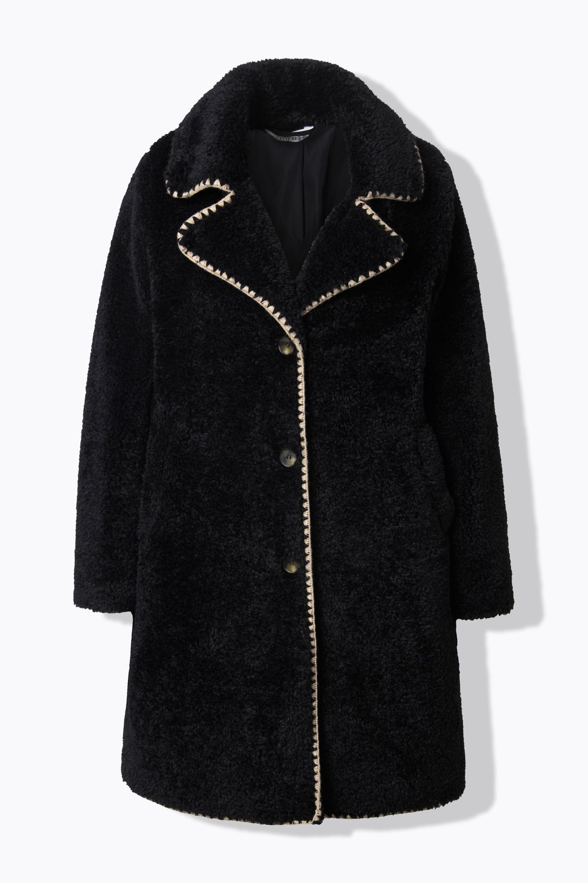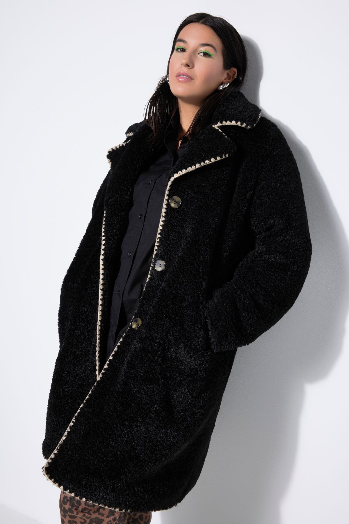 Палто от мека, плюшена материя с декоративни шевови акценти. С копчета отпред, ревери на яката и странични шевови джобове. С подплата.