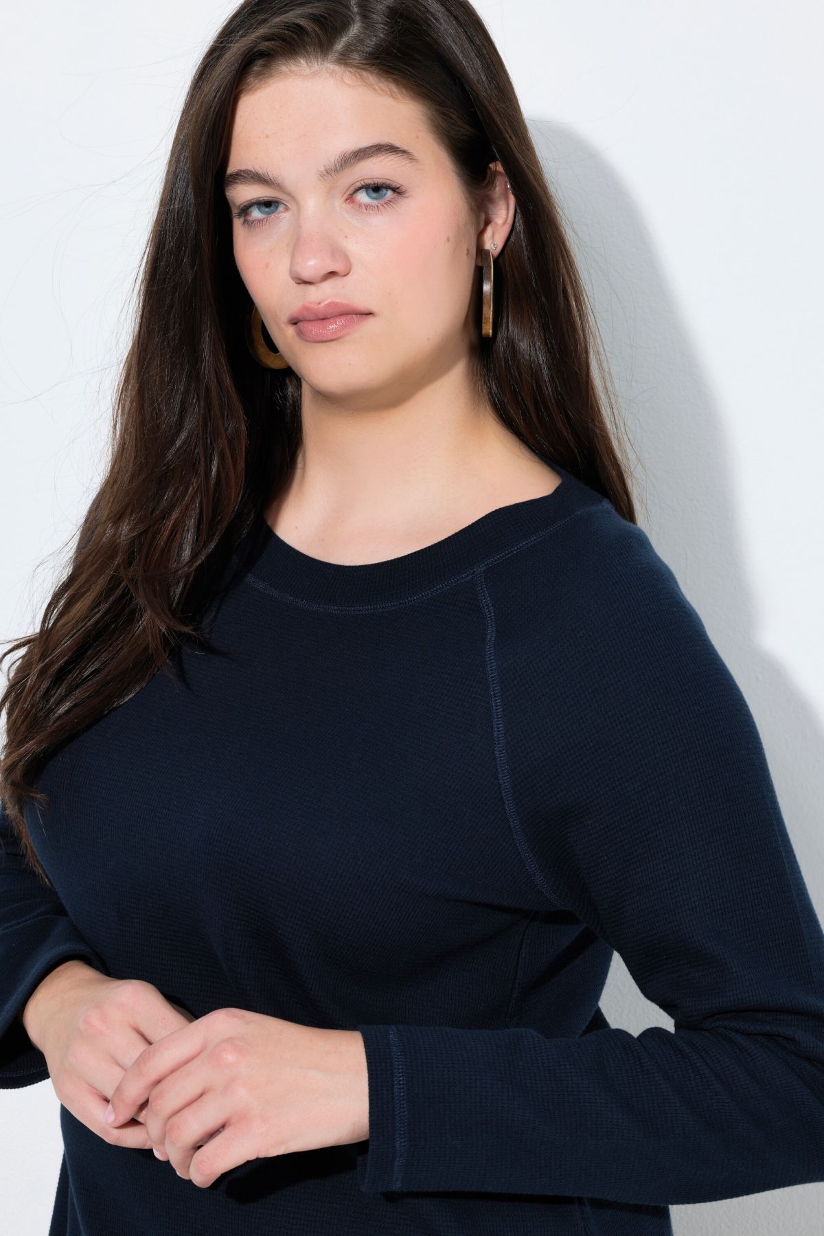 Туника от органичен памук с А-силует. Дълги реглан ръкави и свободно кръгло деколте с рипсен мотив. Издължен и заострен страничен подгъв.