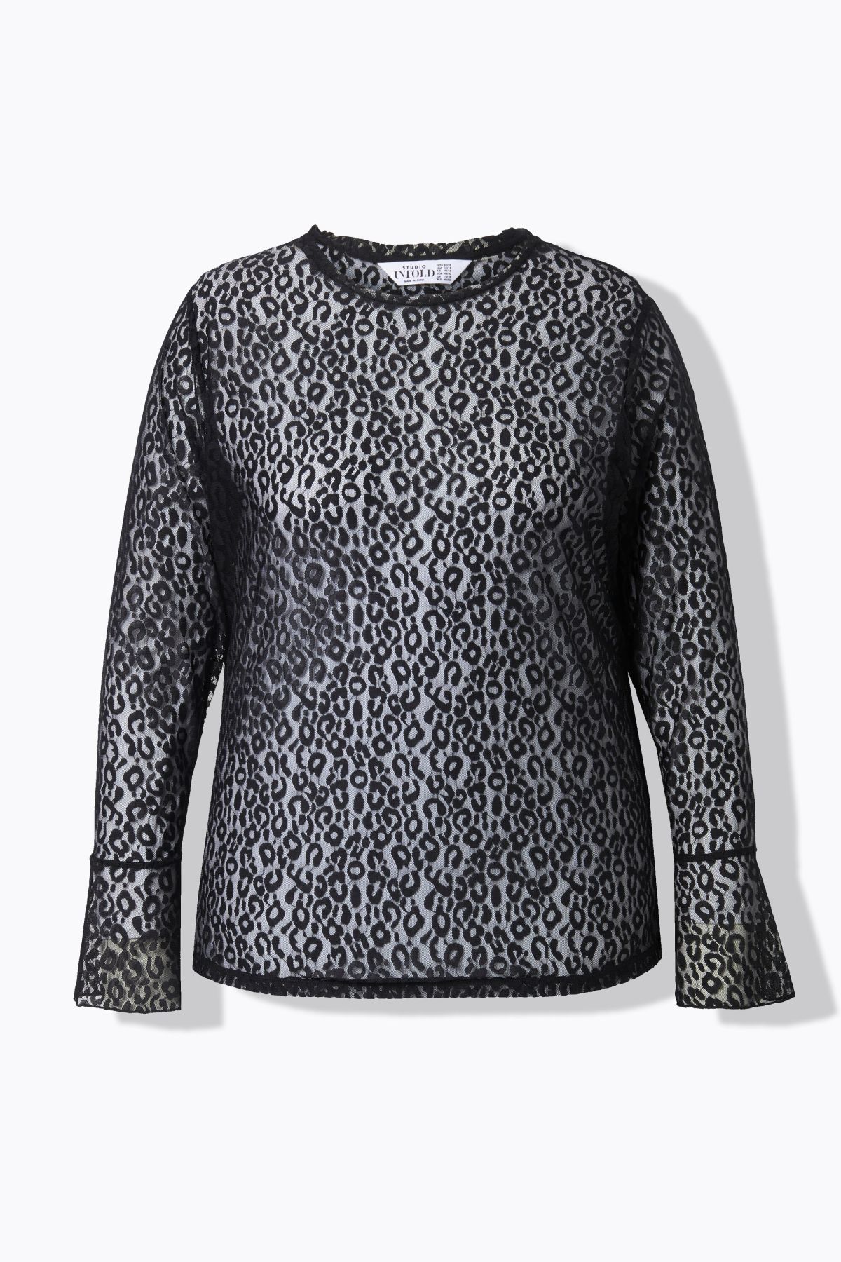 Блуза с дантела с леопардова визия. С втален силует, кръгло деколте по врата и дълги ръкави. Прозрачна и комфортна.