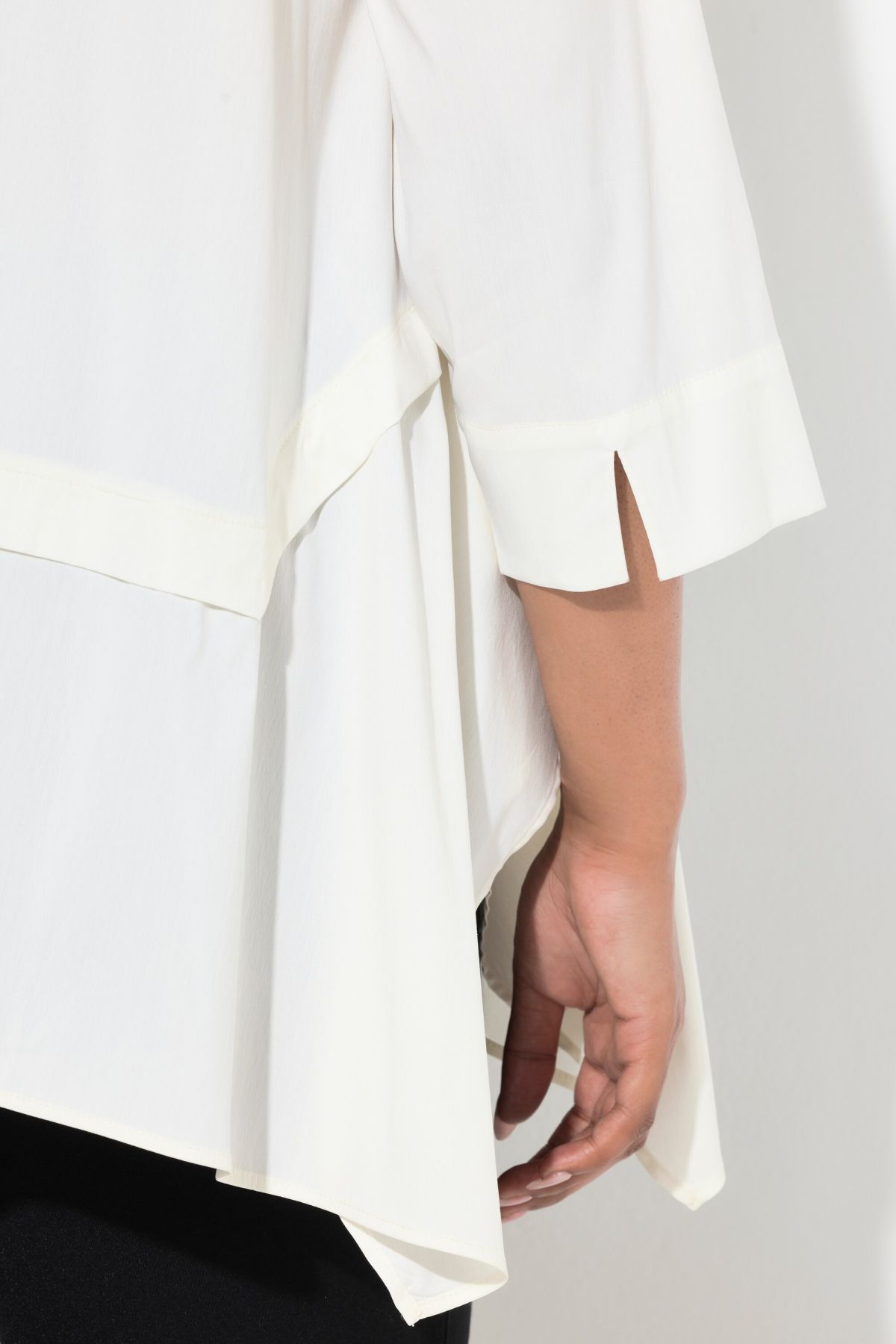 Риза с асиметрична кройка с яка тип риза. 3/4 ръкави с маншет с цепка. Декоративни шевове, скрито закопчаване с копчета. Уголемена кройка, изработена от памучна материя.
