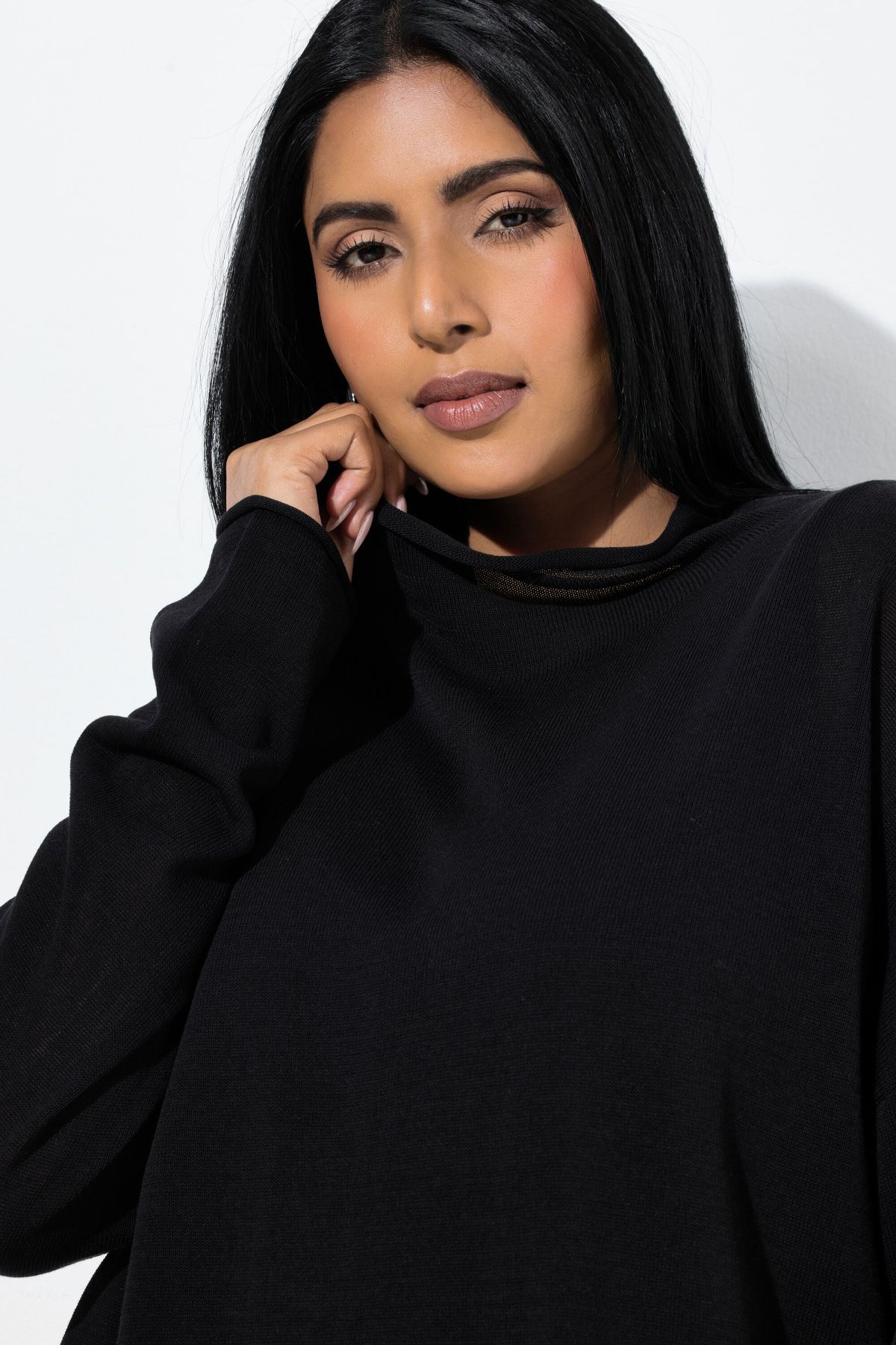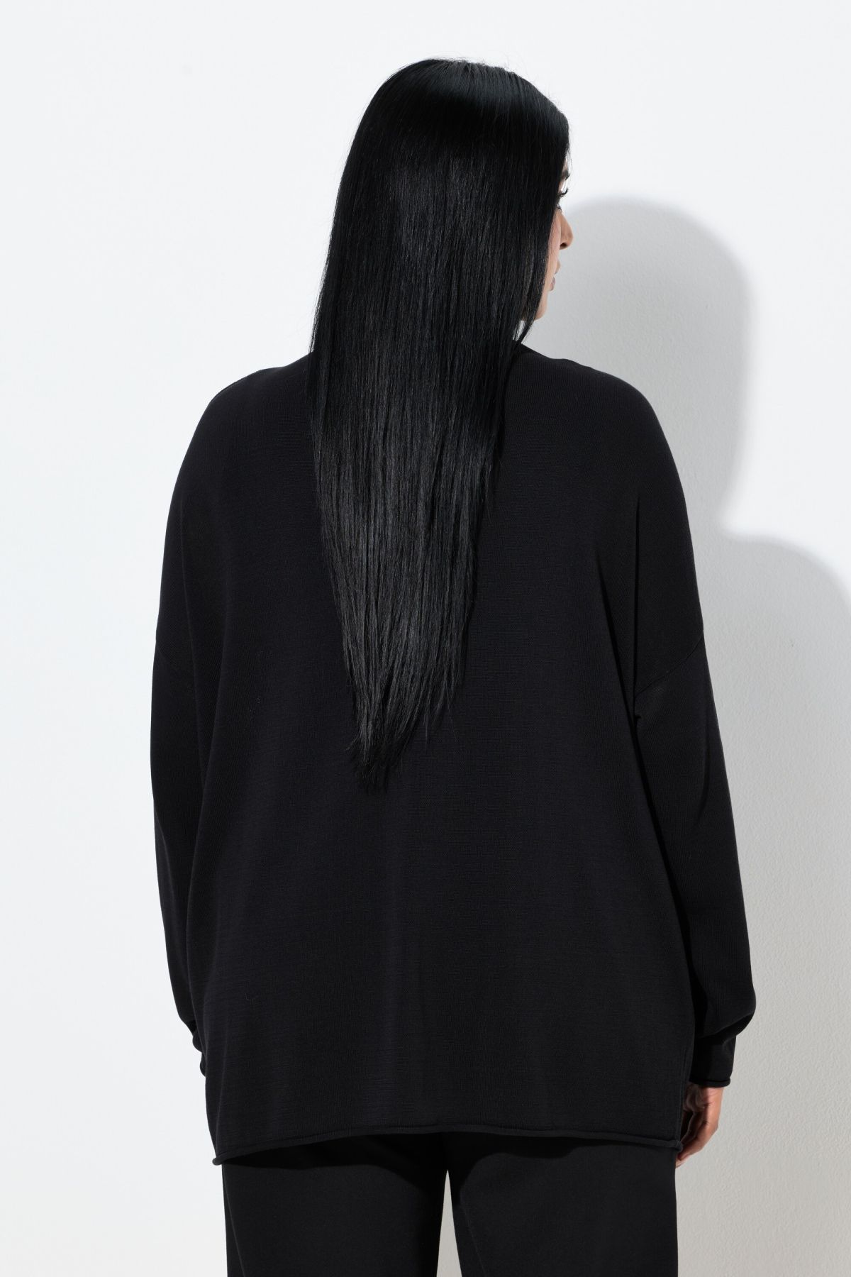 Модерни навити краища, плетена яка с изправени краища, свободна кройка, дълги ръкави с леко спуснати рамене, мека фина плетка, дължина, регулирана по размер, приблизително 68-76 см.