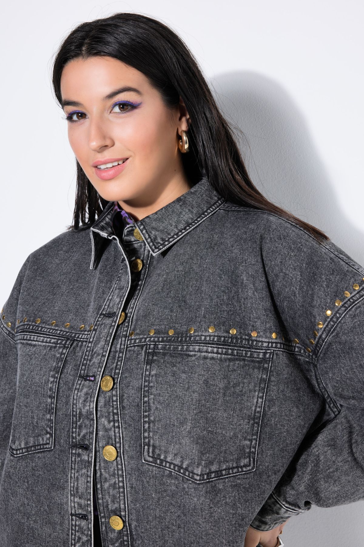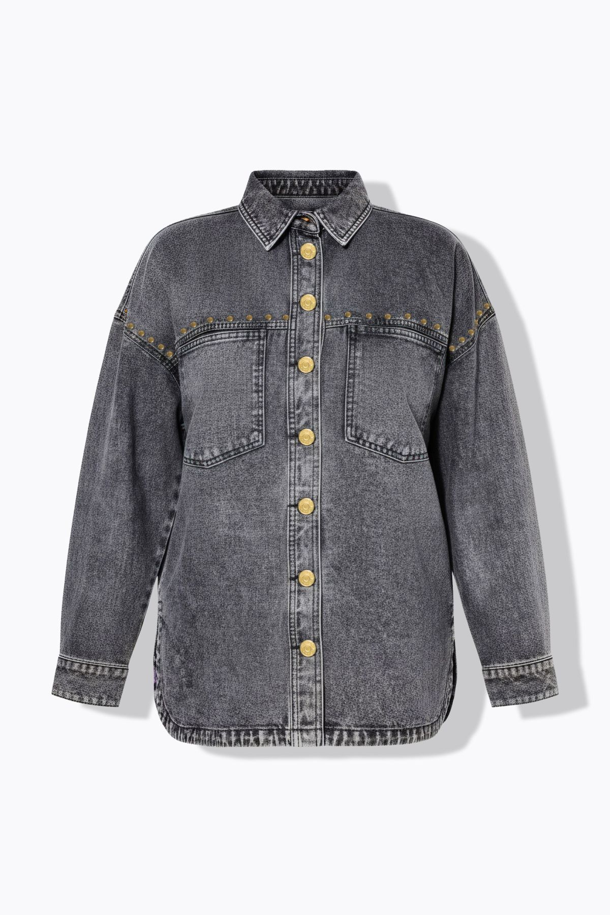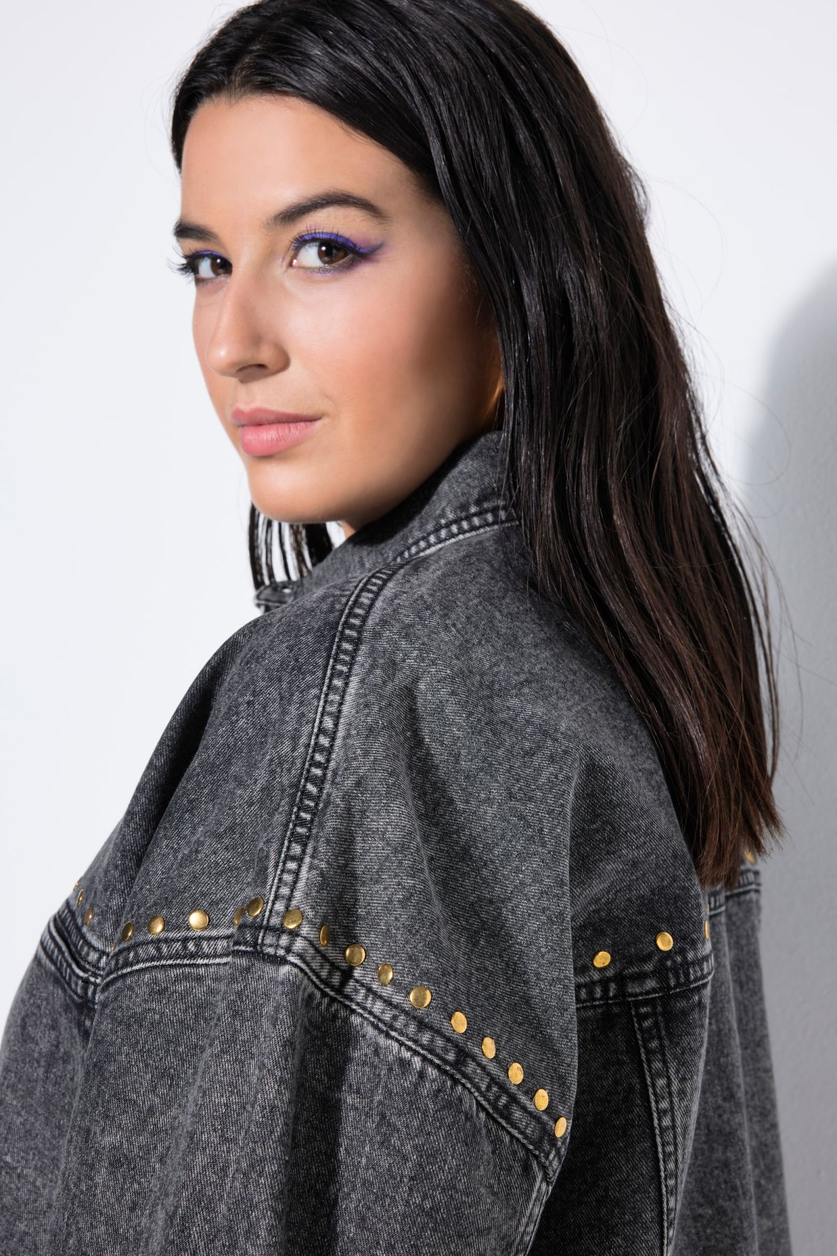 Дънкова риза с винтидж стил и златисти копчета и декоративни капси. Модел с паднали рамене и дълги ръкави с маншети. Два джоба на гърдите и странични цепки на ризата. Уголемена и свободна кройка