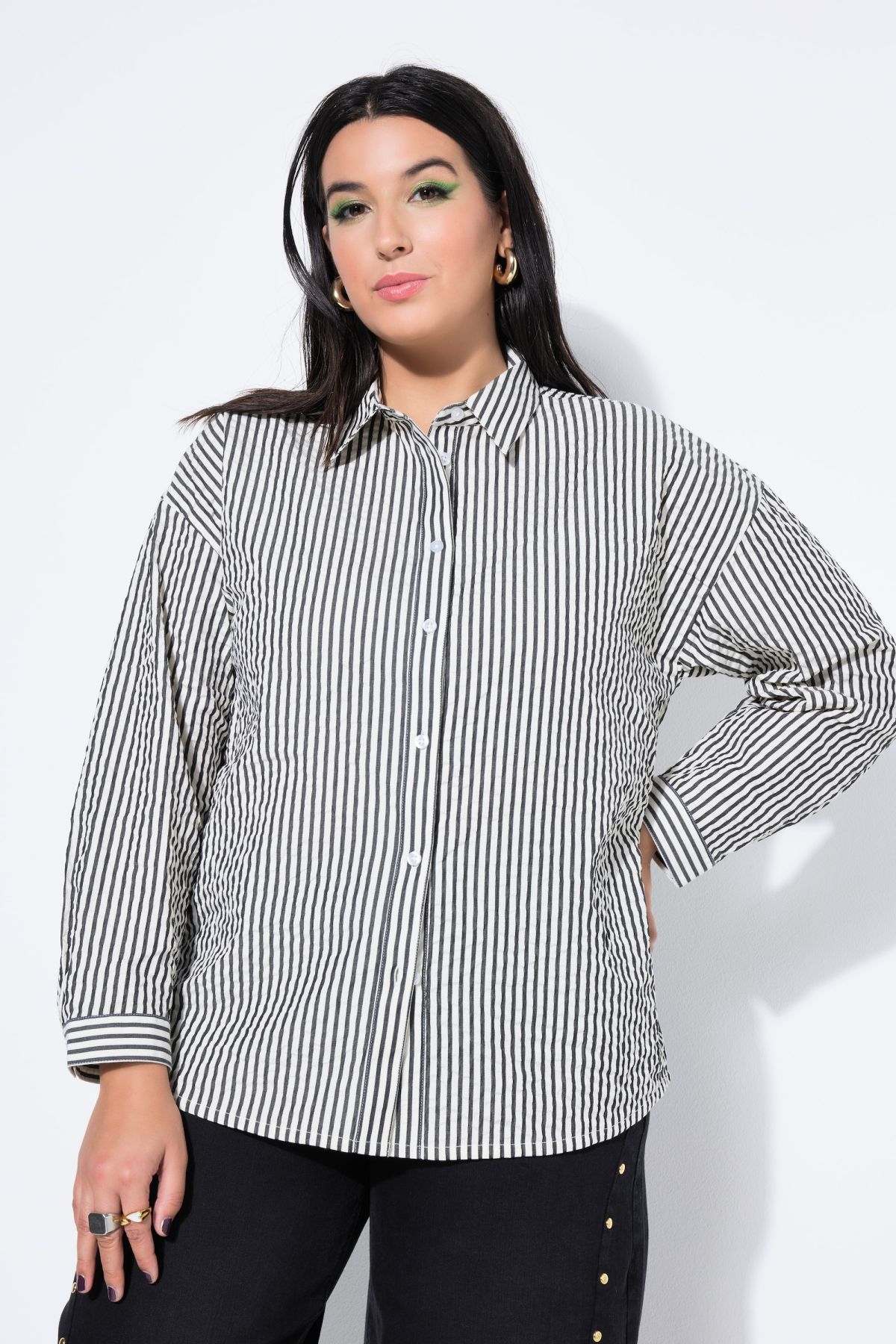Леко овърсайз кройка, дреха тип „серсукър“ с фина текстура и райета, яка тип „риза“, широки дълги ръкави тип „балон“, дължина приблизително 68-72 см (коригирана по размер).