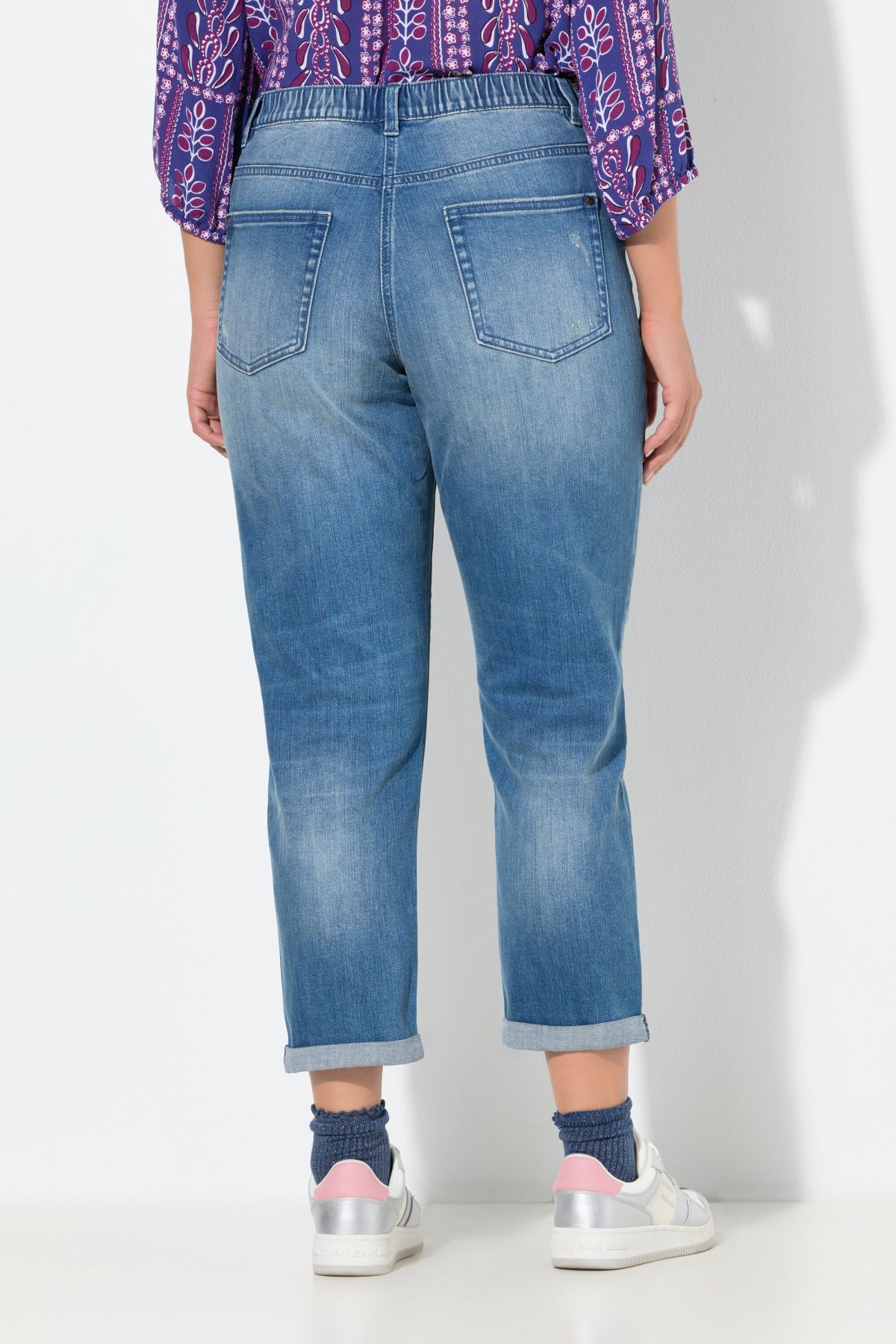 Дънки тип Boyfriend с прокъсани и протрити ефекти. Стеснена еластична талия с гайки за колан, копче и цип. Свободна кройка на ханша и бедрата. Дизайн с 5 джоба.