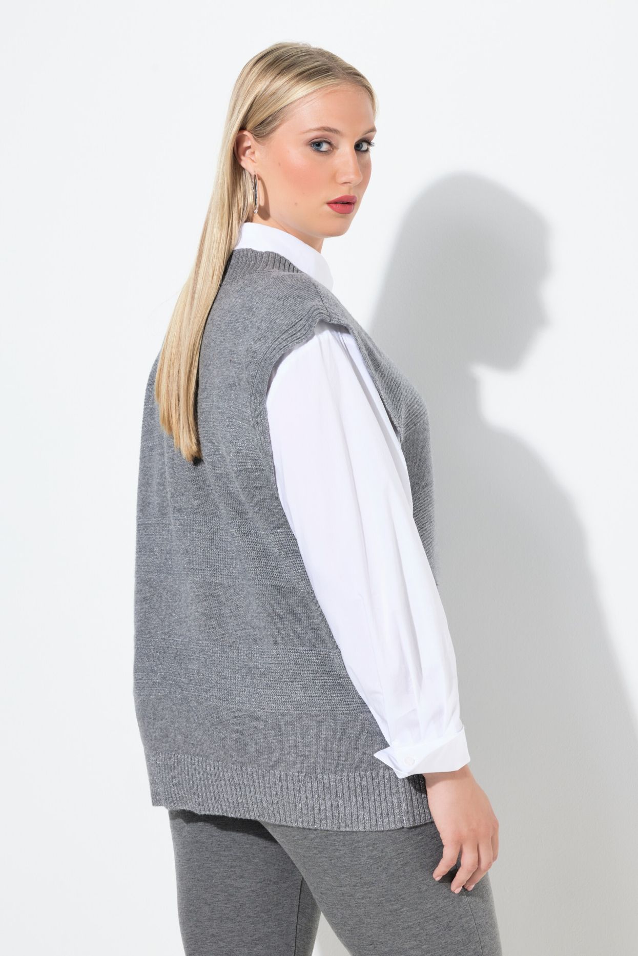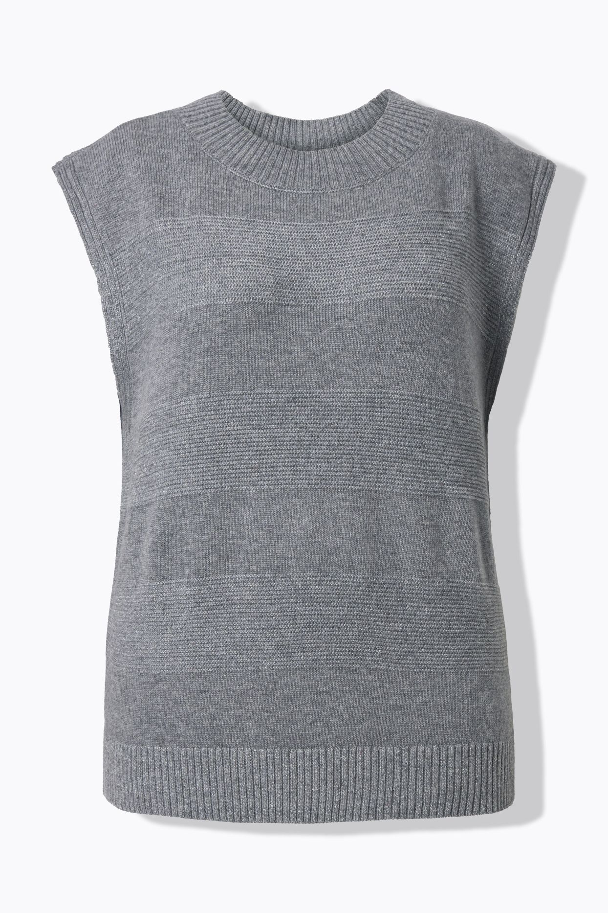 Плетен елек с бляскави райета. С кръгло деколте и комфортни отвори за ръцете. С рипсен подгъв.
