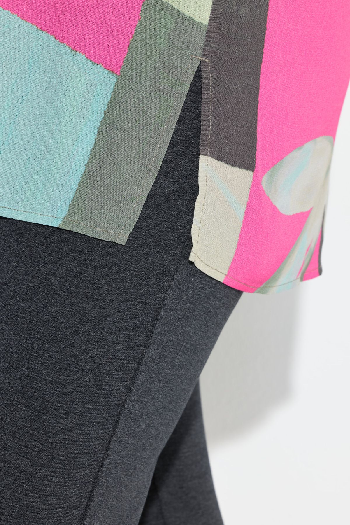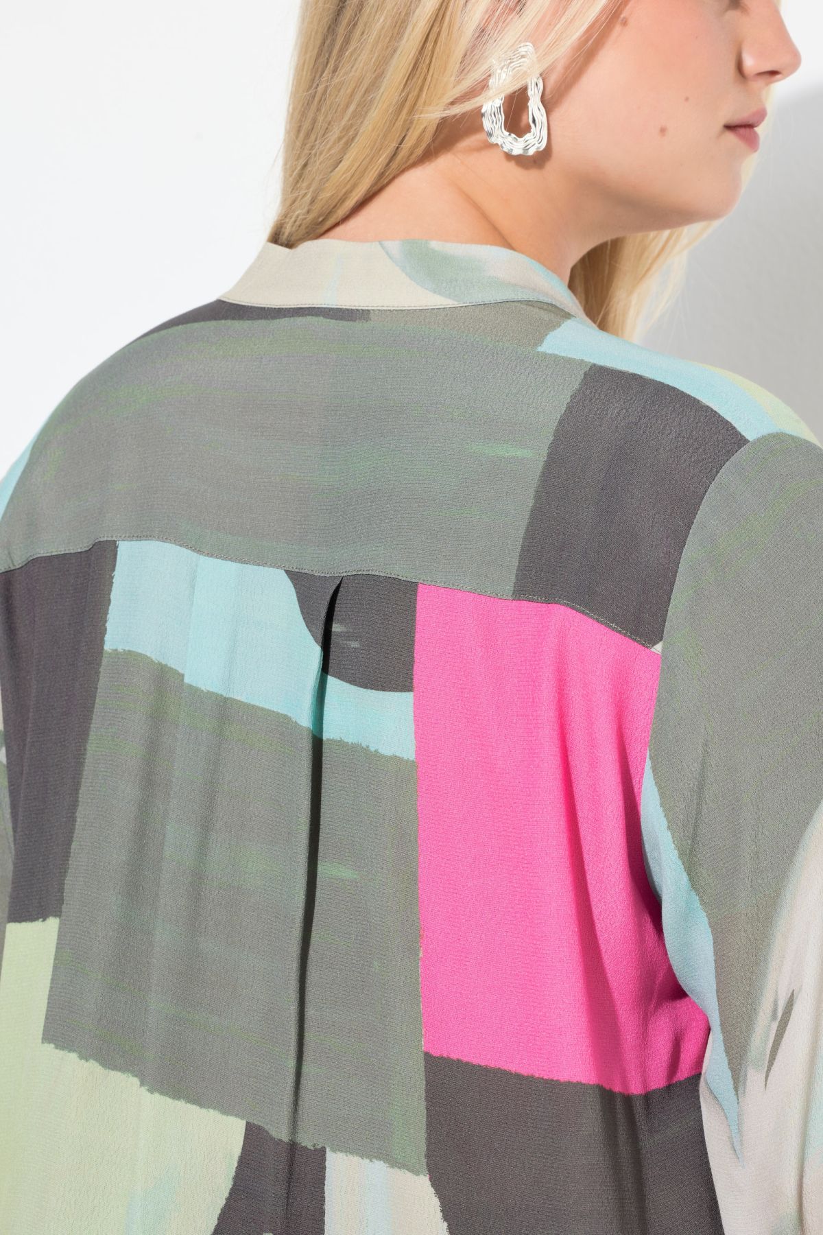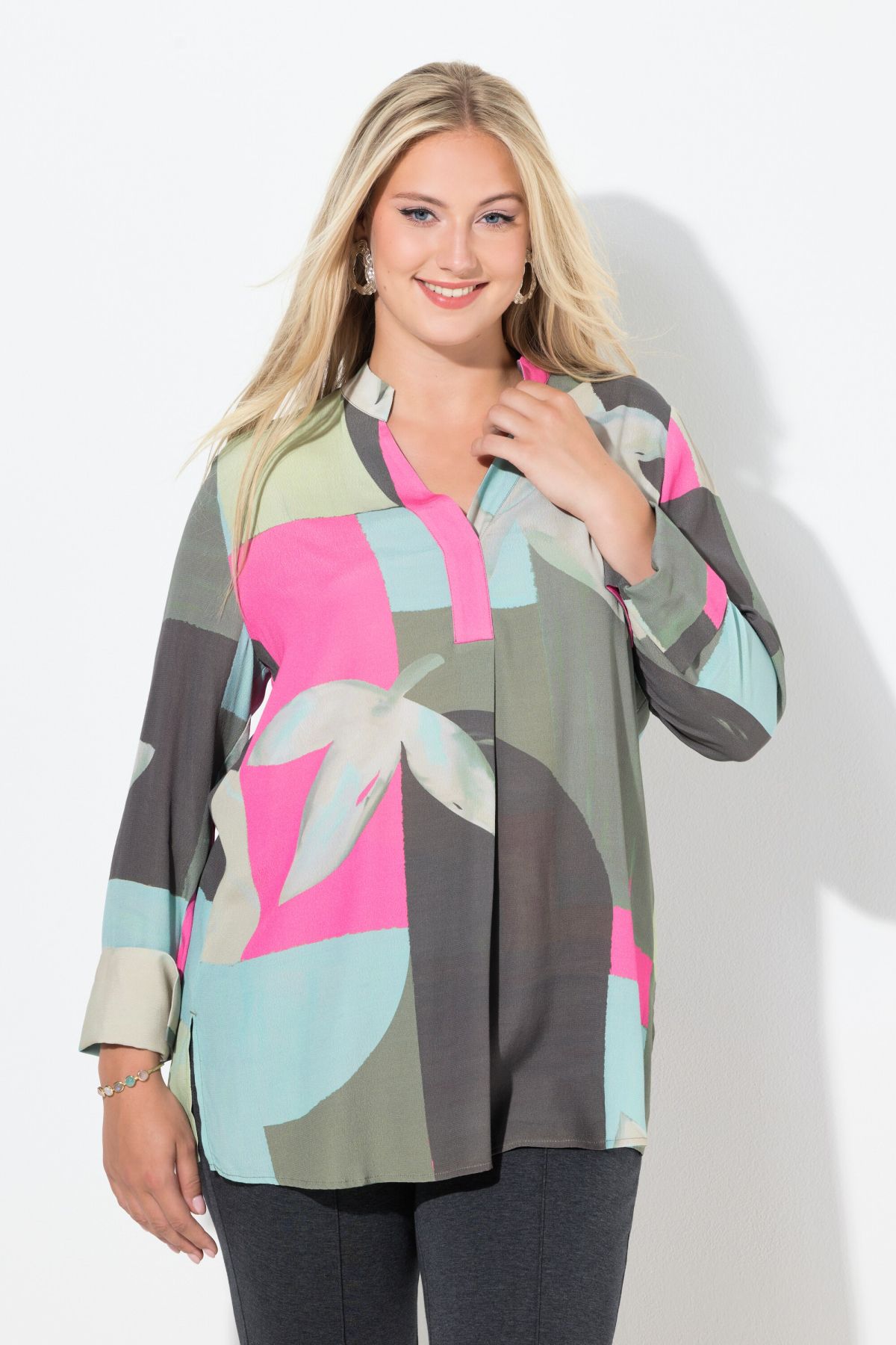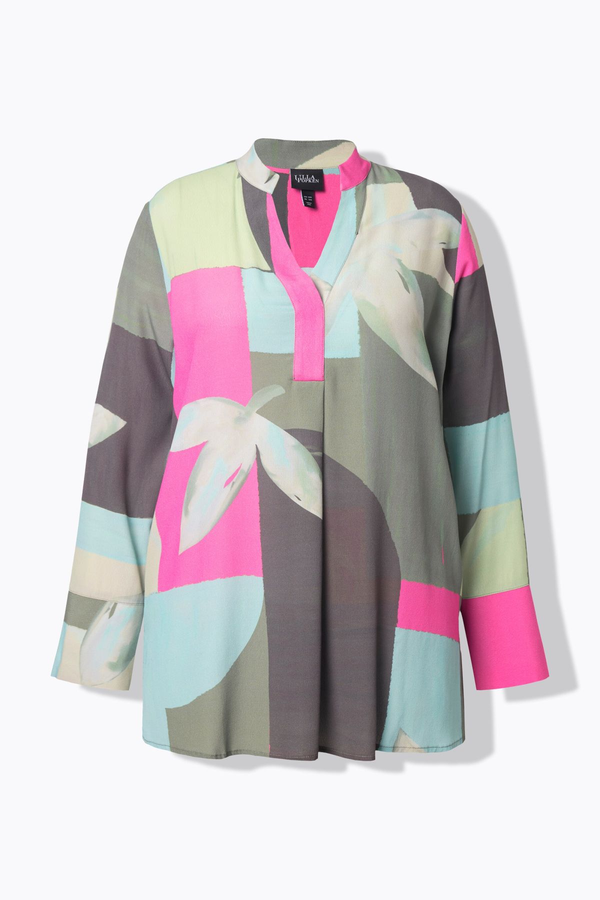 Блуза с геометричен флорален принт. Модел с яка, V - образно деколте с декоративно плисе. С дълги ръкави с маншет с копче.